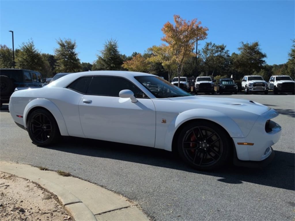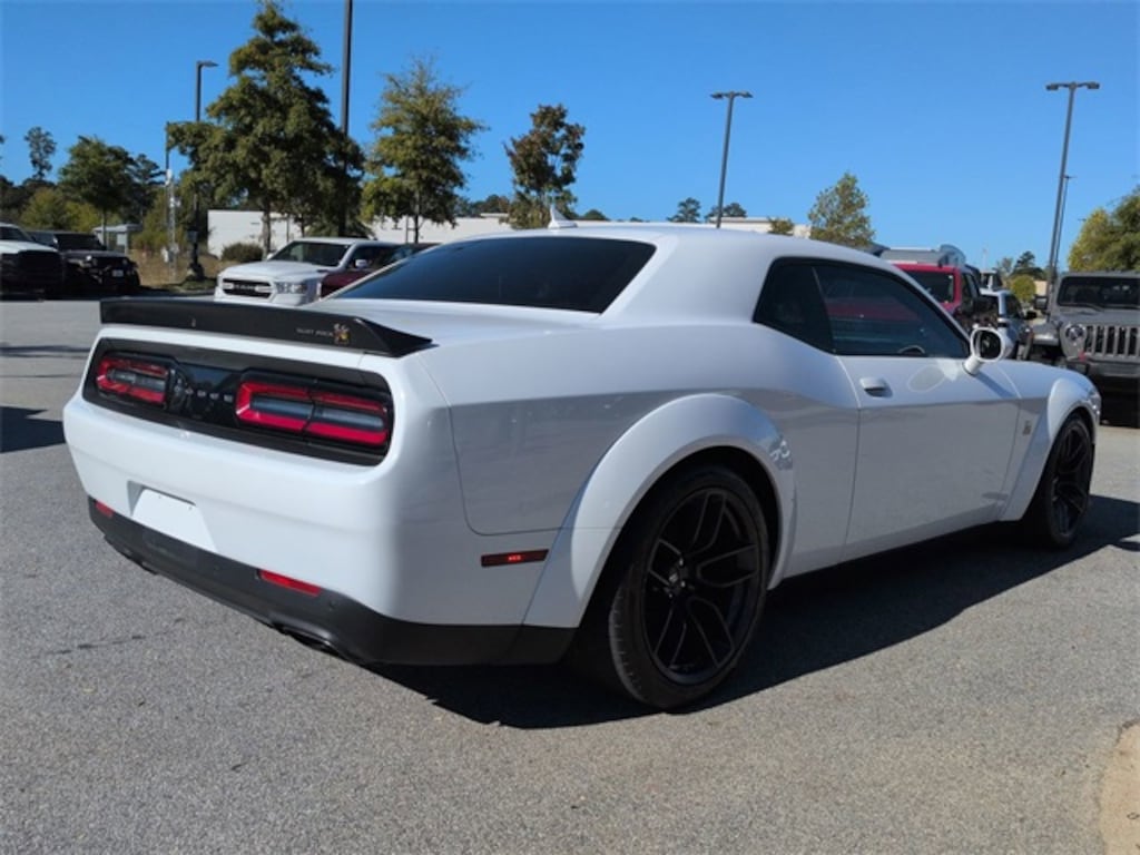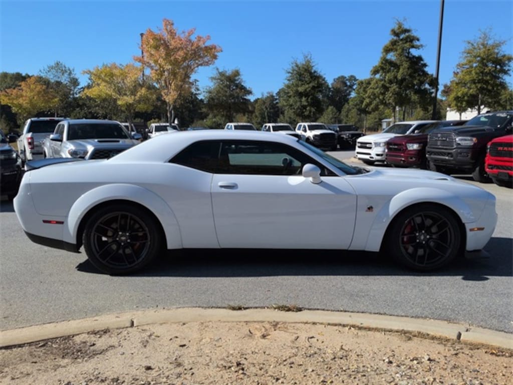 This 2021 Dodge Challenger R/T Scat Pack Widebody in White Knuckle Clearcoat features: 2D Coupe, SRT HEMI 6.4L V8 MDS, 8-Speed Automatic, RWD, 230MM Rear Axle, 3.09 Rear Axle Ratio, 4-Wheel Disc Brakes, 4G WiFi Hotspot Telematics, 8.4" Touchscreen Display, Active Exhaust, Adaptive Damping Suspension, Adaptive Suspension, AM/FM radio: SiriusXM, Android Auto, Apple Carplay, Apple CarPlay/Android Auto, Auto-dimming Rear-View mirror, Automatic temperature control, Backup Camera, Bi Xenon Headlamp Package, Blind Spot & Cross Path Detection, Blind Spot Monitoring, Bluetooth w/ Audio Streaming, Brake assist, Brembo 6-Pot Fixed Front Caliper Brakes, Cold Weather Package, Compass, Convenience Package, Delay-off headlights, Driver Convenience Group, Electronic Stability Control, Emergency communication system: SiriusXM Guardian, Flat-Bottom Steering Wheel, Four wheel independent suspension, Front Center Armrest, Front dual zone A/C, Front fog lights, Fully automatic headlights, Garage door transmitter, GPS Antenna Input, Heated door mirrors, Heated steering wheel, High-Intensity Discharge Headlamps, Illuminated entry, Integrated Center Stack Radio, Integrated Voice Command w/Bluetooth, Leather Shift Knob, Line Lock & Launch Control with Launch Assist, Low tire pressure warning, Media Hub (2 USB, AUX), Multimedia Package, Outside temperature display, Overhead console, Panic alarm, Parking Sensors, ParkView Rear Back-Up Camera, Performance Handling Package, Performance Package, Performance Shift Indicator, Power door mirrors, Power Mirror Package, Power Multi-Function Foldaway Mirrors, Power Package, Preferred Equipment Package, Push Button Start, Quick Order Package 24N R/T Scat Pack Widebody, Radio data system, Radio: Uconnect 4C w/8.4" Display, Rear Cross Traffic Alert, Rear seat center armrest, Remote keyless entry, Remote Start, Reverse Brake Assist, Reverse Sensing, Safety Package, Scat Pack Logo Houndstooth Seat, Security system, Shark Fin Antenna, SiriusXM Satellite Radio, Speed control, Speed-sensing steering, Spoiler, Sport steering wheel, Steering wheel mounted audio controls, Telescoping steering wheel, Tilt steering wheel, Traction control, Trip computer, USB Host Flip, Variably intermittent wipers, Wheels: 20" x 11.0" Devil's Rim Aluminum, Widebody Competition Suspension, Widebody Competition Suspension, Widebody Fender Flares.