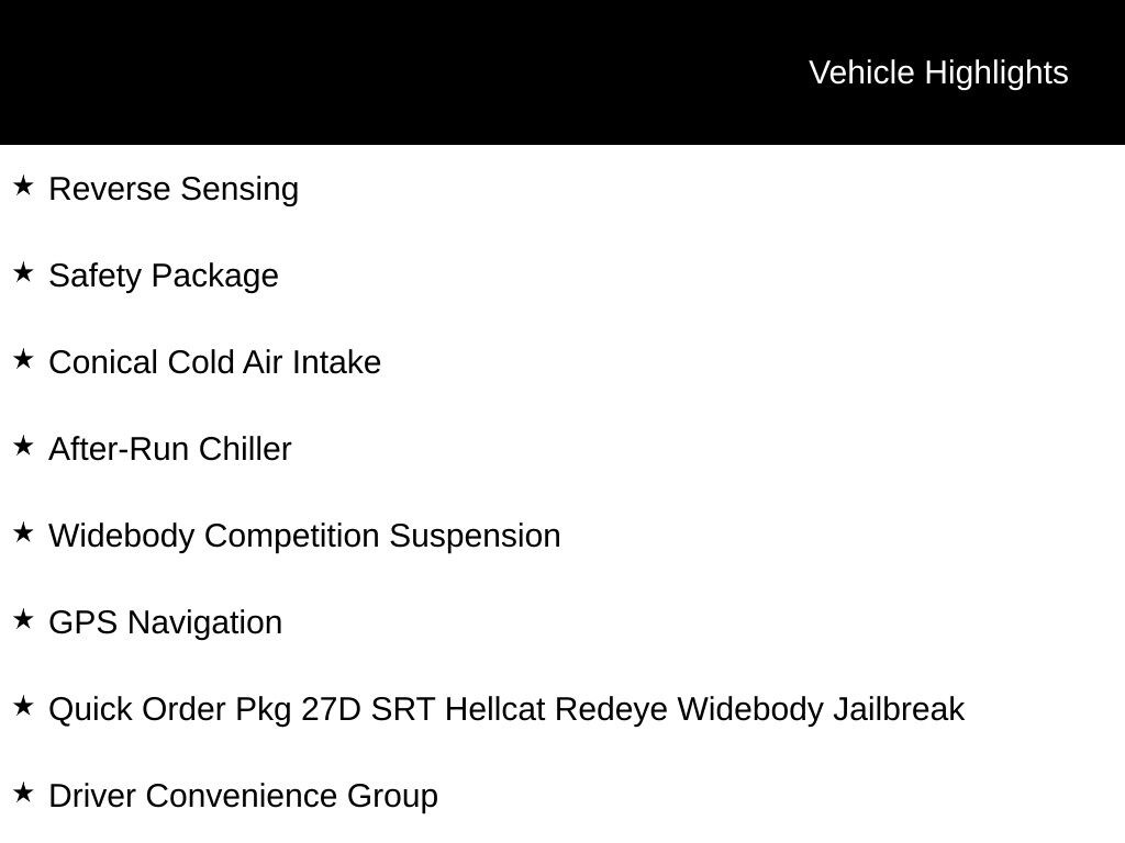 Beneath the hood, the Challenger Redeye Widebody Jailbreak is powered by a potent 6.2L V8 Supercharged engine, delivering an exhilarating 797 horsepower and 707 lb-ft of torque. Paired with an 8-speed automatic transmission and a rear-wheel-drive configuration, this Challenger delivers an unparalleled driving experience that will leave you craving more.