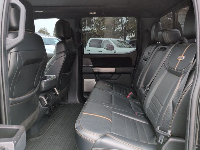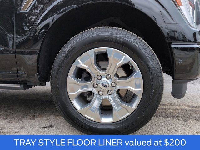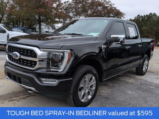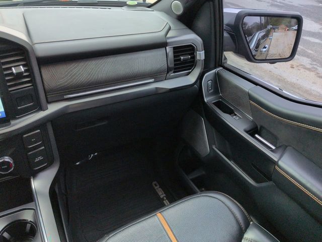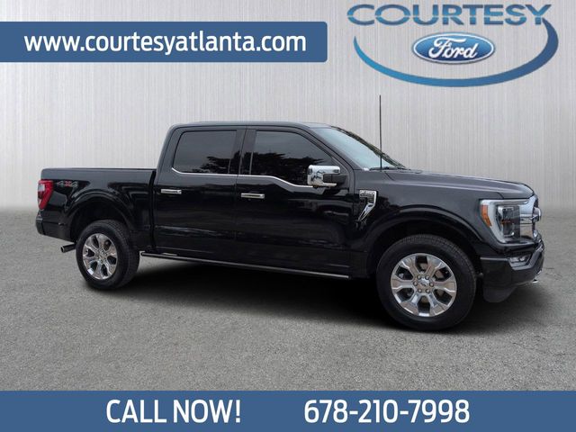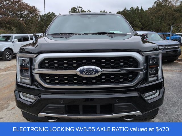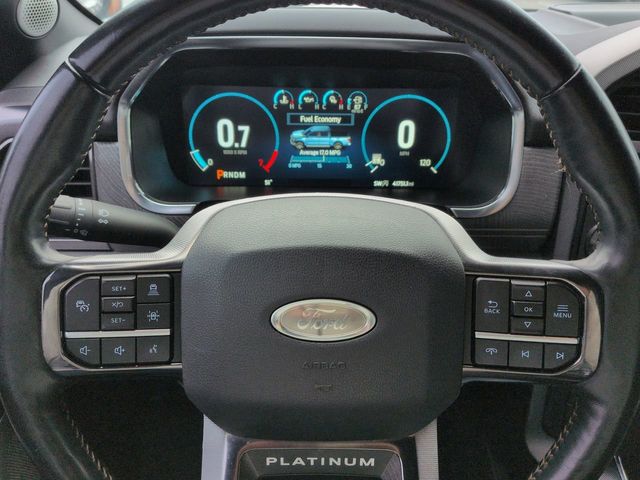 This 2022 Ford F-150 Platinum in Black Metallic features: 4D SuperCrew, 3.5L V6 EcoBoost, 10-Speed Automatic, 4WD, 12" LCD Productivity Touchscreen, 20" Polished Aluminum Wheels, 360 Degree Camera, 360-Degree Camera, 4-Wheel Disc Brakes, 4G WiFi Hotspot Telematics, 8 Speakers, ABS brakes, Active Park Assist, Active Park Assist 2.0, Adaptive Cruise Control, Adaptive Steering, Adaptive Steering, Adjustable pedals, AM/FM radio: SiriusXM with 360L, Auto High-beam Headlights, Auto LED Headlights, Auto tilt-away steering wheel, Auto-dimming door mirrors, Auto-dimming Rear-View mirror, Automatic temperature control, Backup Camera, Bed Utility Package, Blind Spot Monitoring, BLIS w/ Cross Traffic Alert, BlueCruise, BoxLink, Brake assist, Class IV Trailer Hitch Receiver, Compass, Delay-off headlights, Electronic Locking w/3.55 Axle Ratio, Electronic Stability Control, Emergency communication system: SYNC 4 911 Assist, Equipment Group 701A High, Evasive Steering Assist, Extended Range 36 Gallon Fuel Tank, Exterior Parking Camera Rear, Ford Co-Pilot360 Active 2.0, Front Bucket Seats, Front Center Armrest, Front dual zone A/C, Front fog lights, Front wheel independent suspension, Fully automatic headlights, Garage door transmitter, Heated door mirrors, Heated front seats, Heated rear seats, Heated steering wheel, Illuminated entry, Integrated Trailer Brake Controller, Interior Work Surface, Lane Keeping System, Leather Seats, LED Box Lighting, LED Foglights, LED Projector Headlights, Low tire pressure warning, Max Trailer Tow Package, Memory seat, Outside temperature display, Overhead console, Panic alarm, Panoramic Sunroof/Moonroof, Parking Sensors, Pedal memory, Post Collision Braking, Power door mirrors, Power Mirror Package, Power Package, Power passenger seat, Power Running Boards, Power Sliding Rear Window, Power Tailgate, Pro Trailer Backup Assist, Push Button Start, Radio: B&O Sound System by Bang & Olufsen, Radio: B&O Unleashed Sound System by Bang & Olufsen, Rain sensing wipers, Rear seat center armrest, Rear step bumper, Remote keyless entry, Reverse Brake Assist, Reverse Sensing, Security system, Speed control, Speed-sensing steering, Split folding rear seat, Steering wheel memory, Steering wheel mounted audio controls, SYNC 4 w/Enhanced Voice Recognition, Tailgate Step w/Tailgate Work Surface, Telescoping steering wheel, Tilt steering wheel, Tough Bed Spray-In Bedliner, Tow Package, Tow Technology Package, Traction control, Trailer Package, Tray Style Floor Liner, Trip computer, Turn signal indicator mirrors, Twin Panel Moonroof, Unique Multi-Contour Leather Bucket Seats, Ventilated front seats, Wireless Charging Pad.