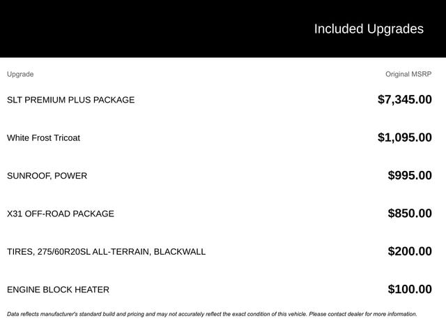 This 2021 GMC Sierra 1500 SLT in White Frost Tricoat features: 4D Crew Cab, EcoTec3 5.3L V8, 10-Speed Automatic, 4WD, **LOCAL TRADE**, 10-Way Power Driver Seat Adjuster w/Lumbar, 10-Way Power Passenger Seat Adjuster w/Lumbar, 12-Volt Rear Auxiliary Power Outlet, 120-Volt Bed Mounted Power Outlet, 120-Volt Instrument Panel Power Outlet, 170 Amp Alternator, 2 USB Ports, 2 USB Ports (1st Row), 20" x 9" Polished Aluminum Wheels, 4-Wheel Disc Brakes, 4G LTE Wi-Fi Hotspot Capable, 4G WiFi Hotspot Telematics, 6-Speaker Audio System Feature, 8" Color Touchscreen, ABS brakes, Adaptive Cruise Control, Adaptive Cruise Control, AM/FM radio: SiriusXM with 360L, Android Auto, Apple Carplay, Apple CarPlay/Android Auto, Auto Emergency Braking, Auto LED Headlights, Auto-dimming door mirrors, Auto-dimming Rear-View mirror, Auto-Locking Rear Differential, Automatic Emergency Braking, Automatic temperature control, Auxiliary External Transmission Oil Cooler, Backup Camera, Blind Spot Monitoring, Bluetooth w/ Audio Streaming, Bose High End Sound Package, Brake assist, Chrome Grille, Chrome Wheel To Wheel Assist Steps, Cold Weather Package, Color-Keyed Carpeting Floor Covering, Compass, Deep-Tinted Glass, Delay-off headlights, Driver Alert Package I, Driver Alert Package II, Driver Memory, Dual Exhaust w/Premium Tips, Electric Rear-Window Defogger, Electrical Lock Control Steering Column, Electronic Stability Control, Engine Block Heater, Floor-Mounted Center Console, Following Distance Indicator, Following Distance Indicator, Forward Collision Alert, Foward Collison Alert, Front & Rear Park Assist, Front Bucket Seats, Front Center Armrest w/Storage, Front dual zone A/C, Front Frame-Mounted Black Recovery Hooks, Front Pedestrian Braking, Front Pedestrian Braking, Front wheel independent suspension, Fully automatic headlights, GMC Connected Access Capable, Heated 2nd Row Outboard Seats, Heated door mirrors, Heated Driver & Front Outboard Passenger Seating, Heated steering wheel, Heavy Duty Suspension, Heavy-Duty Air Filter, Hill Descent Control, Hill Descent Control, Hitch Guidance, Hitch Guidance w/Hitch View, Illuminated entry, In-Vehicle Trailering App, Integrated Trailer Brake Controller, IntelliBeam Automatic High Beam On/Off, Keyless Open & Start, Lane Change Alert, Lane Change Alert w/Side Blind Zone Alert, Lane Departure Warning, Lane Keep Assist w/Lane Departure Warning, Lane Keeping System, Leather Seats, LED Cargo Area Lighting, LED Foglights, Low tire pressure warning, Manual Tilt-Wheel & Telescoping Steering Column, Memory Package, Memory seat, Off Road Package, Off-Road Suspension, OnStar & GMC Connected Services Capable, Outside temperature display, Overhead console, Panic alarm, Parking Sensors, Perf Leather-Appointed Front Outboard Seat Trim, Perimeter Lighting, Power Door Locks, Power door mirrors, Power Front Passenger Windows w/Express Up/Down, Power Front Windows w/Driver Express Up/Down, Power Mirror Package, Power Package, Power Rear Windows w/Express Down, Power Sliding Rear Window, Power Sliding Rear Window w/Rear Defogger, Power Sunroof, Preferred Equipment Group 4SA, Premium audio system: GMC Infotainment System, Premium Bose 7-Speaker Sound System, Premium Sound Package, ProGrade Trailering System, Push Button Start, Radio: Premium GMC Infotainment Sys w/Multi-Touch, Radio: Premium GMC Infotainment Sys w/Navigation, Rear Cross Traffic Alert, Rear Dual USB Charging-Only Ports, Rear seat center armrest, Rear step bumper, Rear Wheelhouse Liners, Remote keyless entry, Remote Start, Remote Vehicle Starter System, Reverse Brake Assist, Reverse Sensing, Safety Alert Seat, Security system, SiriusXM w/360L, Skid Plate Package, SLT Convenience Package, SLT Package, SLT Preferred Package, SLT Premium Plus Package, Speed-sensing steering, Spray-On Pickup Bed Liner w/GMC Logo, Steering Wheel Audio Controls, Steering wheel mounte