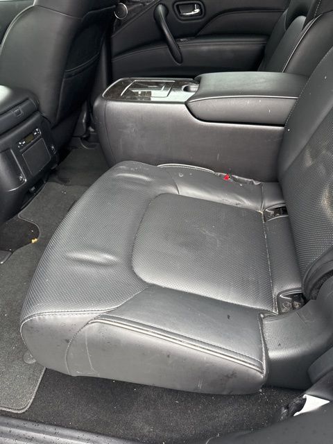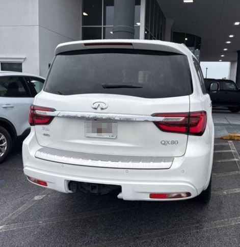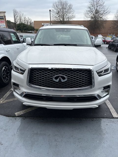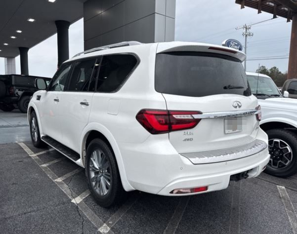 This 2023 INFINITI QX80 LUXE in Moonstone White features: 4D Sport Utility, 5.6L V8, 7-Speed Automatic, 4WD, **LOCAL TRADE**, 12.3" HD Color Driver Cluster, 13 Speakers, 360-Degree Camera, 3rd Row Seating, 3rd row seats: split-bench, 4-Wheel Disc Brakes, ABS brakes, Active Cruise Control, Adaptive Suspension, AM/FM radio: SiriusXM, Android Auto, Apple Carplay, Auto Emergency Braking, Auto High-beam Headlights, Auto LED Headlights, Auto tilt-away steering wheel, Auto-dimming door mirrors, Auto-dimming Rear-View mirror, Auto-leveling suspension, Automatic temperature control, Backup Camera, Blind Spot Monitoring, Bluetooth w/ Audio Streaming, Bose High End Sound Package, Brake assist, Cargo Net, Cargo Package, Carpeted Cargo Mat, Center Console Tray, Cold Weather Package, Compass, Console Net, Delay-off headlights, Electronic Stability Control, Emergency communication system: INFINITI InTouch, First-Aid Kit, Four wheel independent suspension, Foward Collison Alert, Front dual zone A/C, Front fog lights, Fully automatic headlights, Garage door transmitter: HomeLink, Heated door mirrors, Heated Front Bucket Seats, Heated steering wheel, Hill Start Assist, Illuminated entry, Lane Departure Warning, Lane Keeping System, Leather Seats, Leather Shift Knob, Leather steering wheel, Leather-Appointed Seats, LED Foglights, Literature Kit, Low tire pressure warning, Memory Package, Memory seat, Multi Zone Climate Control, Multimedia Package, Navigation system: INFINITI InTouch Navigation, Outside temperature display, Overhead console, Panic alarm, Parking Sensors, Power door mirrors, Power driver seat, Power Liftgate, Power Mirror Package, Power moonroof, Power Package, Power passenger seat, Premium audio system: Bose, Premium Sound Package, Push Button Start, Radio data system, Radio: Bose Premium Audio System w/13 Speakers, Rain sensing wipers, Rear air conditioning, Rear Climate Package, Rear seat center armrest, Rear window wiper, Reclining 3rd row seat, Remote keyless entry, Remote Start, Reverse Brake Assist, Reverse Sensing, Roof Rail Cross Bars, Safety Package, Security system, Speed-sensing steering, Split folding rear seat, Spoiler, Steering wheel memory, Steering wheel mounted audio controls, Telescoping steering wheel, Third Row Seating, Tilt steering wheel, Tow Package, Traction control, Trailer Package, Trip computer, Turn signal indicator mirrors, Wheels: 20" x 8.0" Aluminum-Alloy, WiFi Hotspot Capable, Wireless Charging Pad.