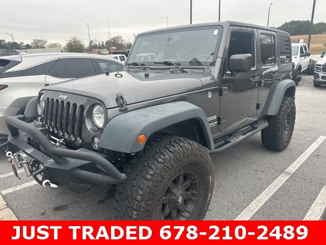 This 2017 Jeep Wrangler Unlimited Sport in Granite Crystal Metallic Clearcoat features: 4D Sport Utility, 3.6L V6 24V VVT, 5-Speed Automatic, 4WD, **LOCAL TRADE**, 17" x 7.5" Aluminum Wheels, 4-Wheel Disc Brakes, 8 Speakers, ABS brakes, Air Conditioning, Auto-Dimming Mirror w/Reading Lamp, Black 3-Piece Hard Top, Brake assist, Chrome/Leather Wrapped Shift Knob, Command-Trac Shift-on-the-Fly Part-Time 4WD, Compass, Connectivity Group, Deep Tint Sunscreen Windows, Delete Sunrider Soft Top, Electronic Stability Control, Freedom Panel Storage Bag, Front 1-Touch Down Power Windows, Front Bucket Seats, Front Center Armrest w/Storage, Front fog lights, Hill Descent Control, Hill Start Assist, Integrated roll-over protection, Leather Wrapped Steering Wheel, Low tire pressure warning, Next Generation Dana 30 Solid Front Axle, Next Generation Dana 44 Heavy Duty Rear Axle, Outside temperature display, Power Convenience Group, Power Heated Mirrors, Power Locks, Power Mirror Package, Power Package, Power steering, Preferred Equipment Package, Quick Order Package 24S, Rear Window Defroster, Rear Window Wiper/Washer, Remote Keyless Entry, Remote USB Port, Security Alarm, SIRIUS Satellite Radio, Speed control, Split folding rear seat, Sport Package, Steering wheel mounted audio controls, Tilt steering wheel, Tire Pressure Monitoring Display, Traction control, Trip computer, Uconnect Voice Command w/Bluetooth, Vehicle Information Center.