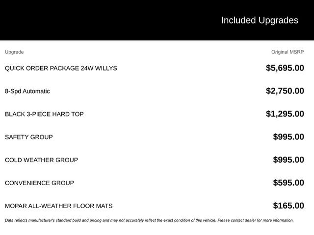 This 2020 Jeep Wrangler Unlimited Willys in Black Clearcoat features: 4D Sport Utility, 3.6L V6 24V VVT, 8-Speed Automatic, 4WD, **LOCAL TRADE**, 4-Wheel Disc Brakes, 4-Wheel Drive Swing Gate Decal, 8 Speakers, ABS brakes, AM/FM radio, Anti-Lock 4-Wheel Disc HD Brakes, Anti-Spin Differential Rear Axle, Auto LED Headlights, Automatic Headlamps, Aux Battery, Backup Camera, Black Grille, Black Trail Rated Badge, Blind Spot & Cross Path Detection, Blind Spot Monitoring, Brake assist, Cloth Low-Back Bucket Seats, Cold Weather Group, Cold Weather Package, Compass, Convenience Group, Convenience Package, Deep Tint Sunscreen Windows, Delay-off headlights, Electronic Stability Control, Front 1-Touch Down Power Windows, Front Bucket Seats, Front Center Armrest w/Storage, Front fog lights, Front LED Fog Lamps, Heated Front Seats, Heated Steering Wheel, Hill Start Assist, Injection Molded Black Rear Bumper, Integrated roll-over protection, Integrated Voice Command w/Bluetooth, Leather Wrapped Steering Wheel, LED Foglights, LED Headlamp & Fog Lamp Group, LED Reflector Headlamps, LED Taillamps, Low tire pressure warning, Matte Black Jeep Badge, MOPAR All-Weather Floor Mats, Outside temperature display, Parking Sensors, ParkSense Rear Park Assist System, ParkView Rear Back-Up Camera, Power Heated Mirrors, Power Mirror Package, Power Package, Preferred Equipment Package, Quick Order Package 24W Willys, Radio data system, Radio: Uconnect 3 w/5" Display, Rear Cross Traffic Alert, Rear Window Wiper/Washer, Remote Keyless Entry, Remote Start, Reverse Brake Assist, Reverse Sensing, Safety Group, Safety Package, Security Alarm, Speed control, Speed Sensitive Power Locks, Split folding rear seat, Steering wheel mounted audio controls, Stop-Start Dual Battery System, Sun Visors w/Illuminated Vanity Mirrors, Telescoping steering wheel, Tilt steering wheel, Traction control, Trip computer, Universal Garage Door Opener, Variably intermittent wipers, Wheels: 17" x 7.5" Moab Black Aluminum, Willys, Willys Hood Decal, Wrangler Decal.
