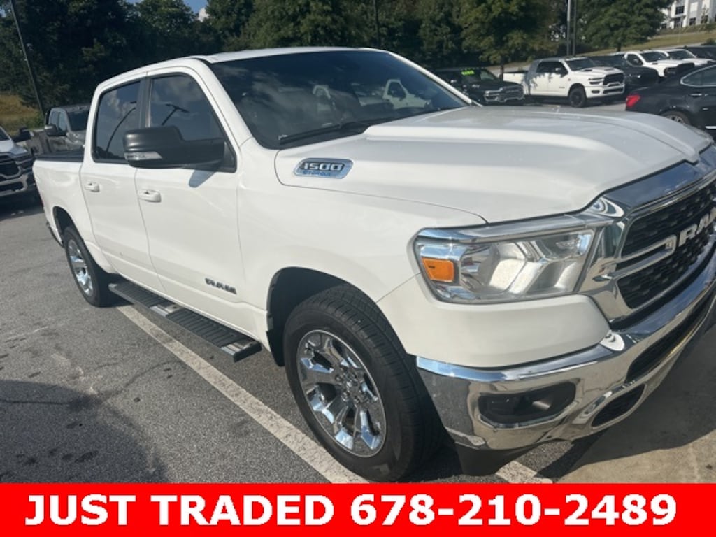 This 2022 Ram 1500 Big Horn/Lone Star in Bright White Clearcoat features: 4D Crew Cab, 3.6L V6 24V VVT, 8-Speed Automatic, RWD, **LOCAL TRADE**, 2nd Row In Floor Storage Bins, 3 Rear Seat Head Restraints, 4-Wheel Disc Brakes, 4G LTE Wi-Fi Hot Spot, 8.4" Touchscreen Display, ABS brakes, Android Auto, Apple CarPlay, Apple Carplay, Auto-Dimming Exterior Driver Mirror, Auto-Dimming Rear-View Mirror, Backup Camera, Big Horn Badge, Big Horn Level 1 Equipment Group, Black Exterior Mirrors, Black Premium Power Mirrors, Bluetooth Handsfree Phone & Audio, Bluetooth w/ Audio Streaming, Brake assist, Class IV Receiver Hitch, Cluster 7.0" TFT Color Display, Compass, Connectivity - US/Canada, Convex Wide-Angle Mirror Insert, Delay-off headlights, Electronic Stability Control, Emergency communication system: SiriusXM Guardian, Exterior Mirrors Courtesy Lamps, Exterior Mirrors w/Heating Element, Exterior Mirrors w/Supplemental Signals, Exterior Parking Camera Rear, For Details, Visit DriveUconnect.com, Front Center Armrest w/Storage, Front fog lights, Front Seat Back Map Pockets, Front wheel independent suspension, Fully automatic headlights, Global Telematics Box Module (TBM), Glove Box Lamp, Google Android Auto, GPS Antenna Input, Heated door mirrors, Hill Start Assist, Illuminated entry, Integrated Center Stack Radio, Integrated Voice Command w/Bluetooth, Leather steering wheel, Low tire pressure warning, Outside temperature display, Overhead console, Panic alarm, Power 2-Way Driver Lumbar Adjust, Power 8-Way Driver Seat, Power Adjustable Pedals, Power door mirrors, Power Mirror Package, Power Package, Power Sliding Rear Window, Power-Folding Mirrors, Push Button Start, Quick Order Package 23Z Big Horn, Radio data system, Radio: Uconnect 5 W w/8.4" Display, Rear Dome w/On/Off Switch Lamp, Rear Power Sliding Window, Rear seat center armrest, Rear step bumper, Rear Window Defroster, Remote keyless entry, Remote Start, SiriusXM Radio Service, SiriusXM Satellite Radio, Speed control, Split folding rear seat, Steering wheel mounted audio controls, Sun Visors w/Illuminated Vanity Mirrors, Telescoping steering wheel, Tilt steering wheel, Tow Package, Traction control, Trailer Package, Trip computer, Universal Garage Door Opener, USB Host Flip, Variably intermittent wipers, Wheels: 20" x 9" Aluminum Chrome Clad (WRK).