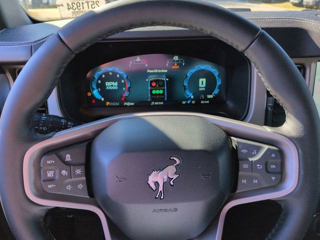 2025 Shadow Black 2025 Ford Bronco Outer Banks Outer Banks 4D Sport Utility 4WD 2.7L EcoBoost V6 Black Appearance Package (Black Molded-In-Color Door Handles, Black Molded-In-Color Fender Flares, Black Molded-In-Color Sideview Mirror Caps, and Black-Painted Molded-In-Color Grille), 18" Bright Machined Aluminum Wheels, 3.73 Axle Ratio, 4-Wheel Disc Brakes, 7 Speakers, ABS brakes, Air Conditioning, Alloy wheels, AM/FM radio: SiriusXM with 360L, AM/FM Stereo, Auto High-beam Headlights, Auto-dimming Rear-View mirror, Automatic temperature control, Brake assist, Compass, Connected Navigation, Delay-off headlights, Driver door bin, Driver vanity mirror, Dual front impact airbags, Dual front side impact airbags, Electronic Stability Control, Emergency communication system: 911 Assist, Exterior Parking Camera Rear, Front anti-roll bar, Front Bucket Seats, Front Center Armrest, Front dual zone A/C, Front fog lights, Front reading lights, Front wheel independent suspension, Fully automatic headlights, Hard Top Sound Deadening Headliner, Heated door mirrors, Heated front seats, Heated Leather-Trimmed/Vinyl Bucket Seats, Heated steering wheel, Illuminated entry, Integrated roll-over protection, Internet access capable: FordPass Connect, Leather Shift Knob, Low tire pressure warning, Navigation system: Connected Navigation, Occupant sensing airbag, Outside temperature display, Overhead airbag, Overhead console, Panic alarm, Passenger door bin, Passenger vanity mirror, Power door mirrors, Power driver seat, Power passenger seat, Power steering, Power windows, Radio data system, Rear seat center armrest, Rear-Window Defroster & Washer, Remote keyless entry, Security system, Shadow Black-Painted Hard Top, SiriusXM w/360L, Speed control, Split folding rear seat, Steering wheel mounted audio controls, SYNC 4, Tachometer, Telescoping steering wheel, Tilt steering wheel, Traction control, Trip computer, Variably intermittent wipers, and Voltmeter. Price includes: $1,000 - Exp. 12/31/2026 Retail Trade Assistance. Must trade in a vehicle to qualify $1,000 - Exp. 12/31/2026 Dealer Finance Assistance. Must finance through dealer lender to qualify.