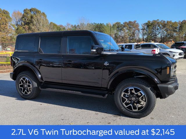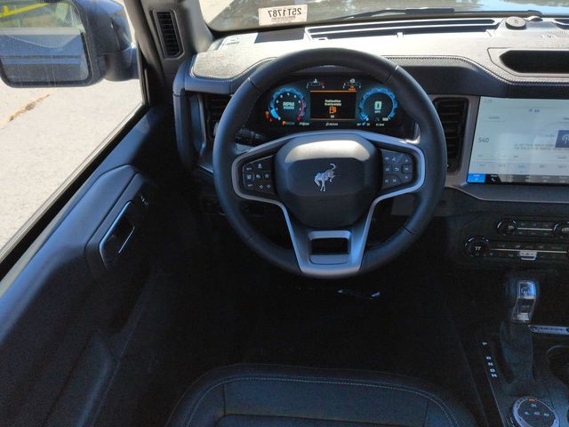 2025 Shadow Black 2025 Ford Bronco Outer Banks Outer Banks 4D Sport Utility 4WD 2.7L EcoBoost V6 4D Sport Utility, 2.7L EcoBoost V6, 10-Speed Automatic, 4WD, 12" LCD Productivity Touchscreen, 360-Degree Camera, 360-Degree Camera, Adaptive Cruise Control, Adaptive Cruise Control, Auto LED Headlights, Backup Camera, Equipment Group 314A Lux Package, Evasive Steering Assist, Front Parking Sensors, Hard Top Sound Deadening Headliner, Hill Start Assist, Information on Demand Panel, Leather Seats, Navigation system: Connected Navigation, Push Button Start, Radio: B&O Sound System by Bang & Olufsen, Rear-Window Defroster & Washer, Shadow Black-Painted Hard Top, Sideview Mirrors, Trailer Tow Package (DIO), Universal Garage Door Opener. Equipment Group 314A Lux Package (360-Degree Camera, Adaptive Cruise Control, Evasive Steering Assist, Front Parking Sensors, Information on Demand Panel, Radio: B&O Sound System by Bang & Olufsen, Sideview Mirrors, and Universal Garage Door Opener), Trailer Tow Package (DIO), 4D Sport Utility, 2.7L EcoBoost V6, 10-Speed Automatic, 4WD, 12" LCD Productivity Touchscreen, 360-Degree Camera, Adaptive Cruise Control, Auto LED Headlights, Backup Camera, Hard Top Sound Deadening Headliner, Hill Start Assist, Leather Seats, Navigation system: Connected Navigation, Push Button Start, Rear-Window Defroster & Washer, Shadow Black-Painted Hard Top, 18" Bright Machined Aluminum Wheels, 3.73 Axle Ratio, 4-Wheel Disc Brakes, 7 Speakers, ABS brakes, Air Conditioning, Alloy wheels, AM/FM radio: SiriusXM with 360L, AM/FM Stereo, Auto High-beam Headlights, Auto-dimming Rear-View mirror, Automatic temperature control, Brake assist, Compass, Connected Navigation, Delay-off headlights, Driver door bin, Driver vanity mirror, Dual front impact airbags, Dual front side impact airbags, Electronic Stability Control, Emergency communication system: 911 Assist, Exterior Parking Camera Rear, Front anti-roll bar, Front Bucket Seats, Front Center Armrest, Front dual zone A/C, Front fog lights, Front reading lights, Front wheel independent suspension, Fully automatic headlights, Heated door mirrors, Heated front seats, Heated Leather-Trimmed/Vinyl Bucket Seats, Heated steering wheel, Illuminated entry, Integrated roll-over protection, Leather Shift Knob, Low tire pressure warning, Occupant sensing airbag, Outside temperature display, Overhead airbag, Overhead console, Panic alarm, Passenger door bin, Passenger vanity mirror, Power door mirrors, Power driver seat, Power passenger seat, Power steering, Power windows, Radio data system, Rear seat center armrest, Remote keyless entry, Security system, SiriusXM w/360L, Speed control, Split folding rear seat, Steering wheel mounted audio controls, SYNC 4, Tachometer, Telescoping steering wheel, Tilt steering wheel, Traction control, Trip computer, Variably intermittent wipers, and Voltmeter. $1,000 - Exp. 12/31/2026 Retail Trade Assistance. Must trade in a vehicle to qualify $1,000 - Exp. 12/31/2026 Dealer Finance Assistance. Must finance through dealer lender to qualify.