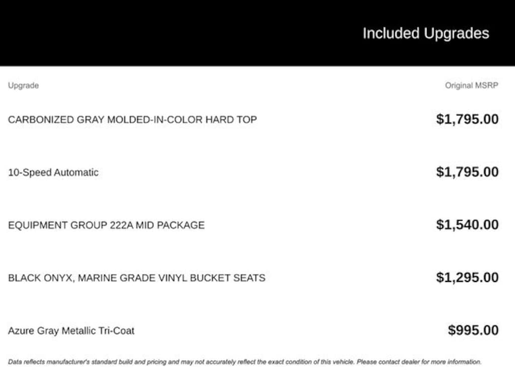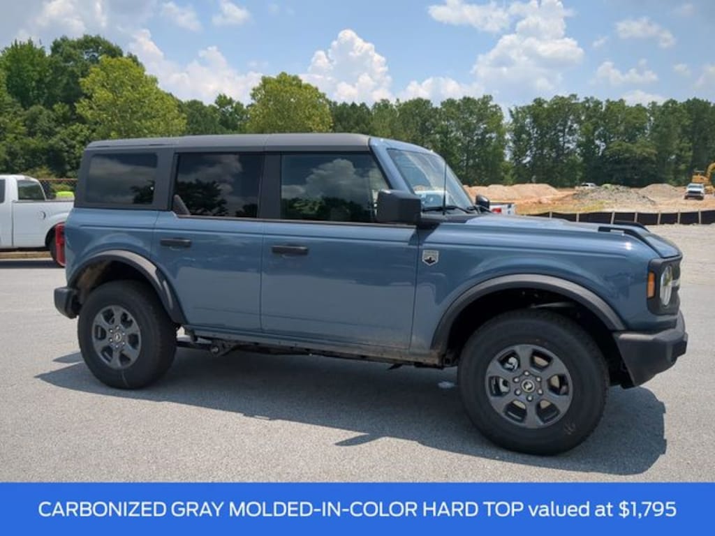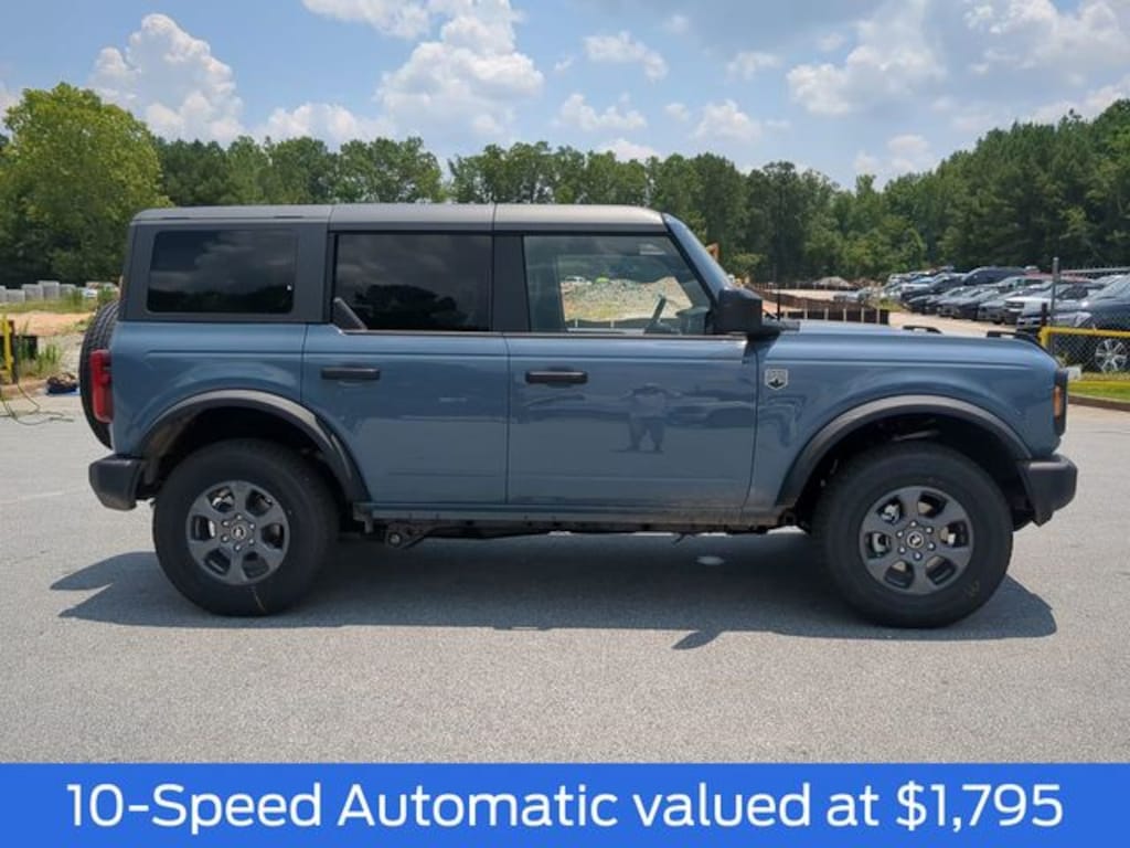 2025 Azure Gray Metallic Tri-Coat 2025 Ford Bronco Big Bend DP Big Bend 4D Sport Utility 4WD 2.3L EcoBoost I-4 12" LCD Productivity Touchscreen, Auto Emergency Braking, Backup Camera, Hill Start Assist, Pre Collision Assist w/ AEB, Remote Start, 4D Sport Utility, 2.3L EcoBoost I-4, 10-Speed Automatic, 4WD, Equipment Group 222A Mid Package, Trailer Tow Package (DIO). Equipment Group 222A Mid Package (Connected Navigation), Trailer Tow Package (DIO), 4D Sport Utility, 2.3L EcoBoost I-4, 10-Speed Automatic, 4WD, 4-Wheel Disc Brakes, 4.46 Axle Ratio, 7 Speakers, ABS brakes, Air Conditioning, Alloy wheels, AM/FM radio: SiriusXM with 360L, AM/FM Stereo, Auto High-beam Headlights, Brake assist, Carbonized Gray Molded-In-Color Hard Top, Cloth Bucket Seats, Compass, Delay-off headlights, Driver door bin, Driver vanity mirror, Dual front impact airbags, Dual front side impact airbags, Electronic Stability Control, Emergency communication system: 911 Assist, Exterior Parking Camera Rear, Front anti-roll bar, Front Bucket Seats, Front Center Armrest, Front reading lights, Front wheel independent suspension, Fully automatic headlights, Heated door mirrors, Illuminated entry, Integrated roll-over protection, Leather Shift Knob, Low tire pressure warning, Occupant sensing airbag, Outside temperature display, Overhead airbag, Overhead console, Panic alarm, Passenger door bin, Passenger vanity mirror, Power door mirrors, Power steering, Power windows, Radio data system, Rear-Window Defroster & Washer, Remote keyless entry, Security system, SiriusXM w/360L, Speed control, Split folding rear seat, Steering wheel mounted audio controls, SYNC 4, Tachometer, Telescoping steering wheel, Tilt steering wheel, Traction control, Trip computer, Variably intermittent wipers, and Wheels: 17" Carbonized Gray-Painted Aluminum.