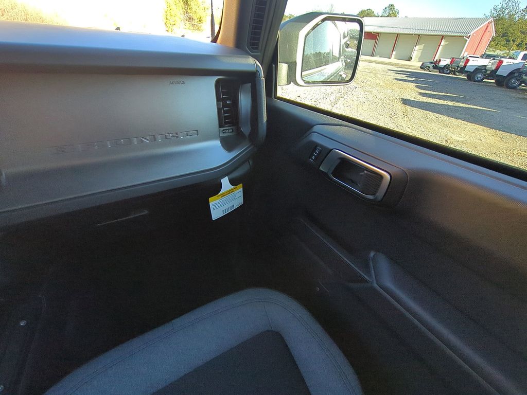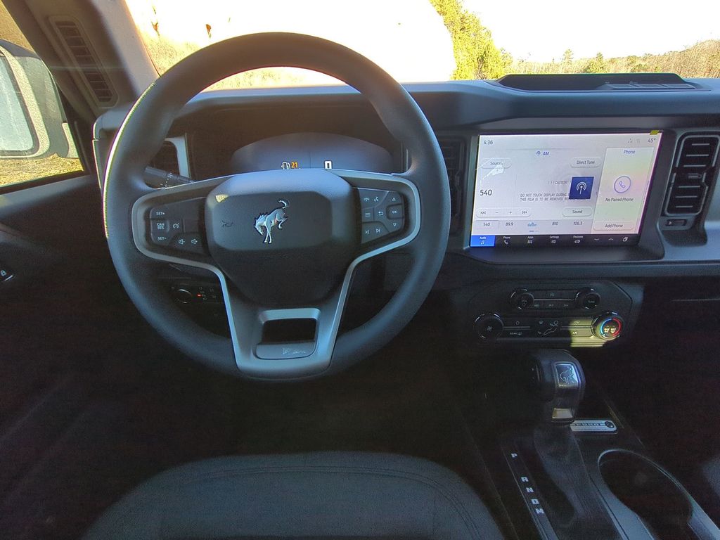 2025 Azure / Gray 2025 Ford Bronco Base 4WD 2.3L EcoBoost I-4 4-Wheel Disc Brakes, 4.46 Axle Ratio, 7 Speakers, ABS brakes, Air Conditioning, AM/FM radio: SiriusXM with 360L, AM/FM Stereo, Auto High-beam Headlights, Brake assist, Cloth Bucket Seats, Compass, Delay-off headlights, Driver door bin, Driver vanity mirror, Dual front impact airbags, Dual front side impact airbags, Electronic Stability Control, Emergency communication system: 911 Assist, Exterior Parking Camera Rear, Front anti-roll bar, Front Bucket Seats, Front Center Armrest, Front reading lights, Front wheel independent suspension, Fully automatic headlights, Heated door mirrors, Illuminated entry, Integrated roll-over protection, Internet access capable: FordPass Connect, Low tire pressure warning, Occupant sensing airbag, Outside temperature display, Overhead airbag, Overhead console, Panic alarm, Passenger door bin, Passenger vanity mirror, Power door mirrors, Power steering, Power windows, Radio data system, Remote keyless entry, Security system, SiriusXM w/360L, Speed control, Split folding rear seat, Steering wheel mounted audio controls, SYNC 4, Tachometer, Telescoping steering wheel, Tilt steering wheel, Traction control, Trip computer, Variably intermittent wipers, and Wheels: 16" Bright Polished Silver-Painted Steel Courtesy Ford and Lincoln of Rome 101 Hwy 411 E Rome, Ga 30161 ROMEFORDLINC.COM 706.235.4453.