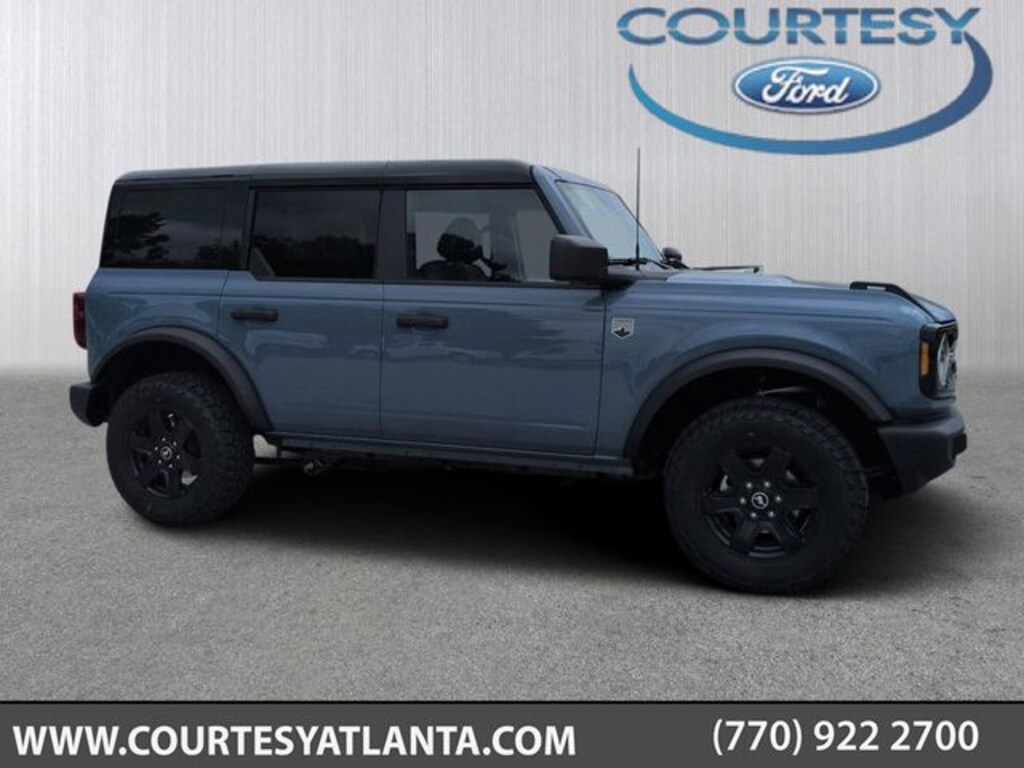 2025 Azure Gray Metallic Tri-Coat 2025 Ford Bronco Big Bend Big Bend 4D Sport Utility 4WD 2.3L EcoBoost I-4 4D Sport Utility, 2.3L EcoBoost I-4, 10-Speed Automatic, 4WD, 12" LCD Productivity Touchscreen, Auto Emergency Braking, Auto LED Headlights, Backup Camera, Black Appearance Package, Black Molded-In-Color Door Handles, Black Molded-In-Color Fender Flares, Black Molded-In-Color Sideview Mirror Caps, Black-Painted Molded-In-Color Grille, Equipment Group 222A Mid Package, Hard Top Sound Deadening Headliner, Hill Start Assist, Pre Collision Assist w/ AEB, Rear-Window Defroster & Washer, Shadow Black Painted Hard Top, Trailer Tow Package (DIO). Black Appearance Package (Black Molded-In-Color Door Handles, Black Molded-In-Color Fender Flares, Black Molded-In-Color Sideview Mirror Caps, and Black-Painted Molded-In-Color Grille), Equipment Group 222A Mid Package (Connected Navigation), Trailer Tow Package (DIO), 4D Sport Utility, 2.3L EcoBoost I-4, 10-Speed Automatic, 4WD, 12" LCD Productivity Touchscreen, Auto Emergency Braking, Auto LED Headlights, Backup Camera, Hard Top Sound Deadening Headliner, Hill Start Assist, Pre Collision Assist w/ AEB, Rear-Window Defroster & Washer, Shadow Black Painted Hard Top, 4-Wheel Disc Brakes, 4.46 Axle Ratio, 7 Speakers, ABS brakes, Air Conditioning, Alloy wheels, AM/FM radio: SiriusXM with 360L, AM/FM Stereo, Auto High-beam Headlights, Brake assist, Cloth Bucket Seats, Compass, Delay-off headlights, Driver door bin, Driver vanity mirror, Dual front impact airbags, Dual front side impact airbags, Electronic Stability Control, Emergency communication system: 911 Assist, Exterior Parking Camera Rear, Front anti-roll bar, Front Bucket Seats, Front Center Armrest, Front reading lights, Front wheel independent suspension, Fully automatic headlights, Heated door mirrors, Illuminated entry, Integrated roll-over protection, Leather Shift Knob, Low tire pressure warning, Occupant sensing airbag, Outside temperature display, Overhead airbag, Overhead console, Panic alarm, Passenger door bin, Passenger vanity mirror, Power door mirrors, Power steering, Power windows, Radio data system, Remote keyless entry, Security system, SiriusXM w/360L, Speed control, Split folding rear seat, Steering wheel mounted audio controls, SYNC 4, Tachometer, Telescoping steering wheel, Tilt steering wheel, Traction control, Trip computer, Variably intermittent wipers, and Wheels: 17" Carbonized Gray-Painted Aluminum.