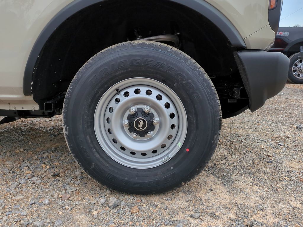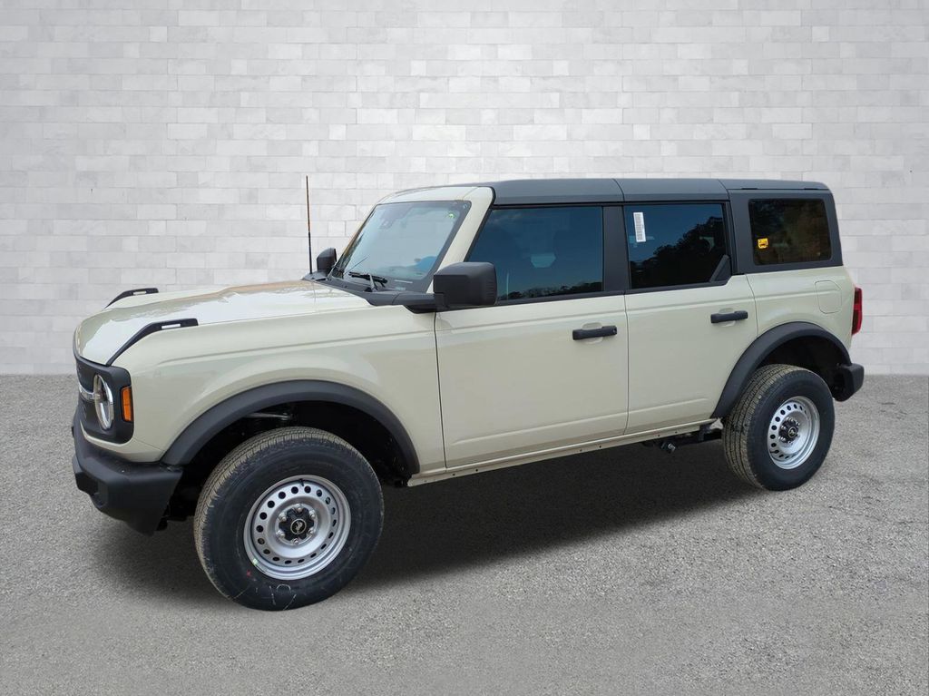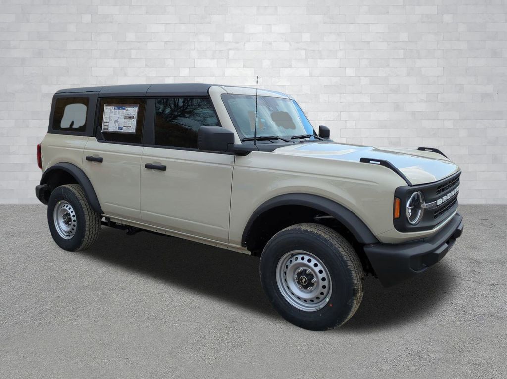 2025 Desert Sand 2025 Ford Bronco Base 4WD 2.3L EcoBoost I-4 4-Wheel Disc Brakes, 4.46 Axle Ratio, 7 Speakers, ABS brakes, Air Conditioning, AM/FM radio: SiriusXM with 360L, AM/FM Stereo, Auto High-beam Headlights, Brake assist, Cloth Bucket Seats, Compass, Delay-off headlights, Driver door bin, Driver vanity mirror, Dual front impact airbags, Dual front side impact airbags, Electronic Stability Control, Emergency communication system: 911 Assist, Exterior Parking Camera Rear, Front anti-roll bar, Front Bucket Seats, Front Center Armrest, Front reading lights, Front wheel independent suspension, Fully automatic headlights, Heated door mirrors, Illuminated entry, Integrated roll-over protection, Internet access capable: FordPass Connect, Low tire pressure warning, Occupant sensing airbag, Outside temperature display, Overhead airbag, Overhead console, Panic alarm, Passenger door bin, Passenger vanity mirror, Power door mirrors, Power steering, Power windows, Radio data system, Remote keyless entry, Security system, SiriusXM w/360L, Speed control, Split folding rear seat, Steering wheel mounted audio controls, SYNC 4, Tachometer, Telescoping steering wheel, Tilt steering wheel, Traction control, Trip computer, Variably intermittent wipers, and Wheels: 16" Bright Polished Silver-Painted Steel Courtesy Ford and Lincoln of Rome 101 Hwy 411 E Rome, Ga 30161 ROMEFORDLINC.COM 706.235.4453.