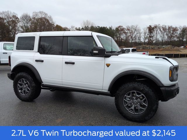 2025 Oxford White 2025 Ford Bronco Badlands Badlands 4D Sport Utility 4WD 2.7L EcoBoost V6 4D Sport Utility, 2.7L EcoBoost V6, 10-Speed Automatic, 4WD, 12" LCD Productivity Touchscreen, 2-Door Intelligent Access w/Lock/Unlock, 360-Degree Camera, 360-Degree Camera, Adaptive Cruise Control, Adaptive Cruise Control, Ambient Footwell Lighting, Auto Emergency Braking, Auto LED Headlights, Backup Camera, Carbonized Gray Molded-In-Color Hard Top, Connected Navigation, Dr & Pass Illuminated Sliding Visor Vanity Mirrors, Dual Smart Charging USB Ports, Dual-Zone Electronic Automatic Temperature Control, Equipment Group 334A Lux Package, Evasive Steering Assist, Front Parking Sensors, Front Row Heated Seats, Hard Top Sound Deadening Headliner, Information on Demand Panel, Power Outlet - Back Side of Center Floor Console, Pre Collision Assist w/ AEB, Push Button Start, Radio: B&O Sound System by Bang & Olufsen, Rear Parking Sensors, Rear-Window Defroster & Washer, Remote Start, Sideview Mirrors, Universal Garage Door Opener. Equipment Group 334A Lux Package (2-Door Intelligent Access w/Lock/Unlock, 360-Degree Camera, Adaptive Cruise Control, Ambient Footwell Lighting, Connected Navigation, Dr & Pass Illuminated Sliding Visor Vanity Mirrors, Dual Smart Charging USB Ports, Dual-Zone Electronic Automatic Temperature Control, Evasive Steering Assist, Front Parking Sensors, Front Row Heated Seats, Information on Demand Panel, Power Outlet - Back Side of Center Floor Console, Radio: B&O Sound System by Bang & Olufsen, Rear Parking Sensors, Sideview Mirrors, and Universal Garage Door Opener), 4D Sport Utility, 2.7L EcoBoost V6, 10-Speed Automatic, 4WD, 12" LCD Productivity Touchscreen, 360-Degree Camera, Adaptive Cruise Control, Auto Emergency Braking, Auto LED Headlights, Backup Camera, Carbonized Gray Molded-In-Color Hard Top, Hard Top Sound Deadening Headliner, Pre Collision Assist w/ AEB, Push Button Start, Rear-Window Defroster & Washer, Remote Start, 4-Wheel Disc Brakes, 4.7 Axle Ratio, 7 Speakers, ABS brakes, Air Conditioning, Alloy wheels, AM/FM radio: SiriusXM with 360L, AM/FM Stereo, Auto High-beam Headlights, Auto-dimming Rear-View mirror, Body Color-Painted Hard Top, Brake assist, Compass, Delay-off headlights, Driver door bin, Driver vanity mirror, Dual front impact airbags, Dual front side impact airbags, Electronic Stability Control, Emergency communication system: 911 Assist, Exterior Parking Camera Rear, Front anti-roll bar, Front Bucket Seats, Front Center Armrest, Front fog lights, Front reading lights, Front wheel independent suspension, Fully automatic headlights, Heated door mirrors, Heated front seats, Heated steering wheel, Illuminated entry, Integrated roll-over protection, Leather Shift Knob, Leather-Trimmed/Vinyl Bucket Seats, Low tire pressure warning, Marine Grade Vinyl Heated Bucket Seats, Occupant sensing airbag, Outside temperature display, Overhead airbag, Overhead console, Panic alarm, Passenger door bin, Passenger vanity mirror, Power door mirrors, Power steering, Power windows, Radio data system, Remote keyless entry, Security system, SiriusXM w/360L, Speed control, Split folding rear seat, Steering wheel mounted audio controls, SYNC 4, Tachometer, Telescoping steering wheel, Tilt steering wheel, Traction control, Trip computer, Variably intermittent wipers, Voltmeter, and Wheels: 17" Carbonized Gray-Painted Aluminum. $1,000 - Exp. 12/31/2026 Retail Trade Assistance. Must trade in a vehicle to qualify $1,000 - Exp. 12/31/2026 Dealer Finance Assistance. Must finance through dealer lender to qualify.