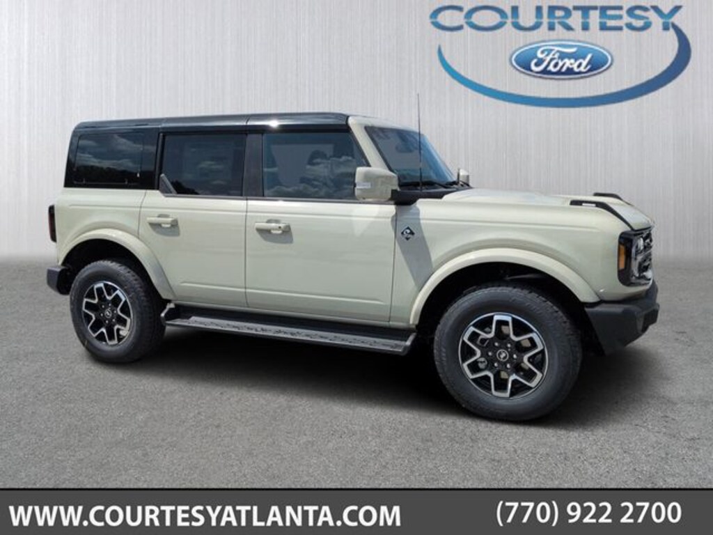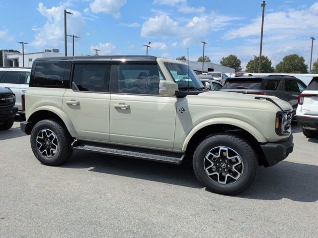 2025 Desert Sand 2025 Ford Bronco Outer Banks Outer Banks 4D Sport Utility 4WD 2.7L EcoBoost V6 4D Sport Utility, 2.7L EcoBoost V6, 10-Speed Automatic, 4WD, 12" LCD Productivity Touchscreen, 360-Degree Camera, 360-Degree Camera, Adaptive Cruise Control, Adaptive Cruise Control, Equipment Group 314A Lux Package, Evasive Steering Assist, Front Parking Sensors, Hard Top Sound Deadening Headliner, Hill Start Assist, Information on Demand Panel, Leather Seats, Navigation system: Connected Navigation, Push Button Start, Radio: B&O Sound System by Bang & Olufsen, Rear-Window Defroster & Washer, Shadow Black-Painted Hard Top, Sideview Mirrors, Trailer Tow Package (DIO), Universal Garage Door Opener. Equipment Group 314A Lux Package (360-Degree Camera, Adaptive Cruise Control, Evasive Steering Assist, Front Parking Sensors, Information on Demand Panel, Radio: B&O Sound System by Bang & Olufsen, Sideview Mirrors, and Universal Garage Door Opener), Trailer Tow Package (DIO), 4D Sport Utility, 2.7L EcoBoost V6, 10-Speed Automatic, 4WD, 12" LCD Productivity Touchscreen, 360-Degree Camera, Adaptive Cruise Control, Hard Top Sound Deadening Headliner, Hill Start Assist, Leather Seats, Navigation system: Connected Navigation, Push Button Start, Rear-Window Defroster & Washer, Shadow Black-Painted Hard Top, 18" Bright Machined Aluminum Wheels, 3.73 Axle Ratio, 4-Wheel Disc Brakes, 7 Speakers, ABS brakes, Air Conditioning, Alloy wheels, AM/FM radio: SiriusXM with 360L, AM/FM Stereo, Auto High-beam Headlights, Auto-dimming Rear-View mirror, Automatic temperature control, Brake assist, Compass, Connected Navigation, Delay-off headlights, Driver door bin, Driver vanity mirror, Dual front impact airbags, Dual front side impact airbags, Electronic Stability Control, Emergency communication system: 911 Assist, Exterior Parking Camera Rear, Front anti-roll bar, Front Bucket Seats, Front Center Armrest, Front dual zone A/C, Front fog lights, Front reading lights, Front wheel independent suspension, Fully automatic headlights, Heated door mirrors, Heated front seats, Heated Leather-Trimmed/Vinyl Bucket Seats, Heated steering wheel, Illuminated entry, Integrated roll-over protection, Leather Shift Knob, Low tire pressure warning, Occupant sensing airbag, Outside temperature display, Overhead airbag, Overhead console, Panic alarm, Passenger door bin, Passenger vanity mirror, Power door mirrors, Power driver seat, Power passenger seat, Power steering, Power windows, Radio data system, Rear seat center armrest, Remote keyless entry, Security system, SiriusXM w/360L, Speed control, Split folding rear seat, Steering wheel mounted audio controls, SYNC 4, Tachometer, Telescoping steering wheel, Tilt steering wheel, Traction control, Trip computer, Variably intermittent wipers, and Voltmeter.