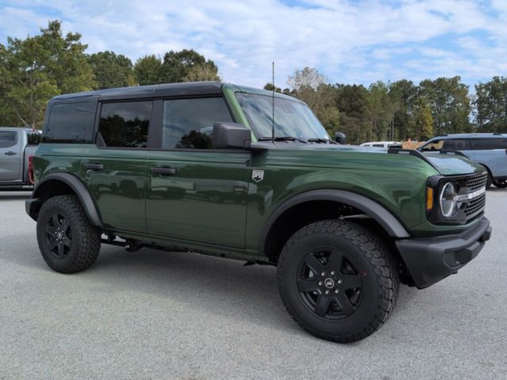 2025 Eruption Green Metallic 2025 Ford Bronco Big Bend Big Bend 4D Sport Utility 4WD 2.3L EcoBoost I-4 4D Sport Utility, 2.3L EcoBoost I-4, 10-Speed Automatic, 4WD, 12" LCD Productivity Touchscreen, Auto Emergency Braking, Auto LED Headlights, Backup Camera, Black Appearance Package, Black Molded-In-Color Door Handles, Black Molded-In-Color Fender Flares, Black Molded-In-Color Sideview Mirror Caps, Black-Painted Molded-In-Color Grille, Equipment Group 222A Mid Package, Hard Top Sound Deadening Headliner, Hill Start Assist, Pre Collision Assist w/ AEB, Push Button Start, Rear-Window Defroster & Washer, Remote Start, Shadow Black Painted Hard Top, Trailer Tow Package (DIO). Black Appearance Package (Black Molded-In-Color Door Handles, Black Molded-In-Color Fender Flares, Black Molded-In-Color Sideview Mirror Caps, and Black-Painted Molded-In-Color Grille), Equipment Group 222A Mid Package (Connected Navigation), Trailer Tow Package (DIO), 4D Sport Utility, 2.3L EcoBoost I-4, 10-Speed Automatic, 4WD, 12" LCD Productivity Touchscreen, Auto Emergency Braking, Auto LED Headlights, Backup Camera, Hard Top Sound Deadening Headliner, Hill Start Assist, Pre Collision Assist w/ AEB, Push Button Start, Rear-Window Defroster & Washer, Remote Start, Shadow Black Painted Hard Top, 4-Wheel Disc Brakes, 4.46 Axle Ratio, 7 Speakers, ABS brakes, Air Conditioning, Alloy wheels, AM/FM radio: SiriusXM with 360L, AM/FM Stereo, Auto High-beam Headlights, Brake assist, Cloth Bucket Seats, Compass, Delay-off headlights, Driver door bin, Driver vanity mirror, Dual front impact airbags, Dual front side impact airbags, Electronic Stability Control, Emergency communication system: 911 Assist, Exterior Parking Camera Rear, Front anti-roll bar, Front Bucket Seats, Front Center Armrest, Front reading lights, Front wheel independent suspension, Fully automatic headlights, Heated door mirrors, Illuminated entry, Integrated roll-over protection, Leather Shift Knob, Low tire pressure warning, Occupant sensing airbag, Outside temperature display, Overhead airbag, Overhead console, Panic alarm, Passenger door bin, Passenger vanity mirror, Power door mirrors, Power steering, Power windows, Radio data system, Remote keyless entry, Security system, SiriusXM w/360L, Speed control, Split folding rear seat, Steering wheel mounted audio controls, SYNC 4, Tachometer, Telescoping steering wheel, Tilt steering wheel, Traction control, Trip computer, Variably intermittent wipers, and Wheels: 17" Carbonized Gray-Painted Aluminum.