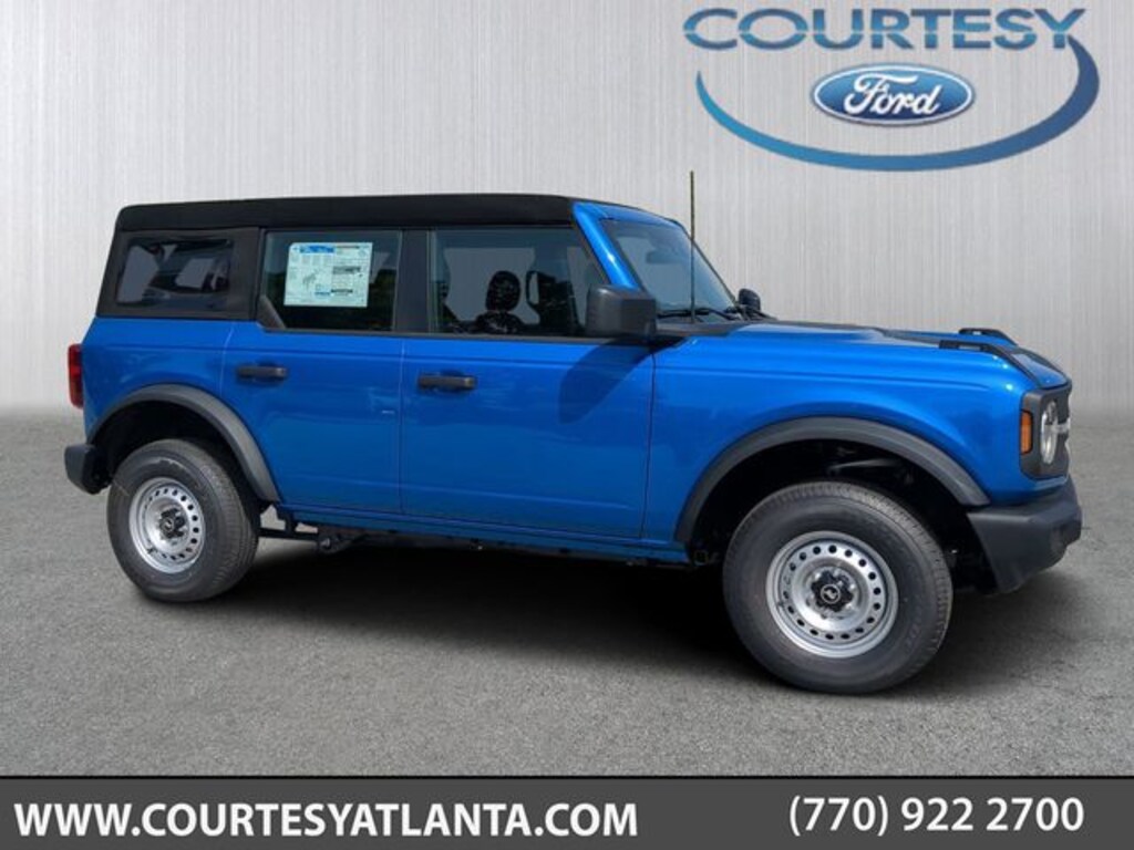 2025 Velocity Blue Metallic 2025 Ford Bronco Base 4D Sport Utility 4WD 2.3L EcoBoost I-4 Backup Camera, Bluetooth w/ Audio Streaming, Foward Collison Alert, Pre-Collision w/ Pedestrian Detection, 4D Sport Utility, 2.3L EcoBoost I-4, 10-Speed Automatic, 4WD, Equipment Group 101A. Equipment Group 101A, 4D Sport Utility, 2.3L EcoBoost I-4, 10-Speed Automatic, 4WD, 4-Wheel Disc Brakes, 4.46 Axle Ratio, 7 Speakers, ABS brakes, Air Conditioning, AM/FM radio: SiriusXM with 360L, AM/FM Stereo, Auto High-beam Headlights, Brake assist, Cloth Bucket Seats, Compass, Delay-off headlights, Driver door bin, Driver vanity mirror, Dual front impact airbags, Dual front side impact airbags, Electronic Stability Control, Emergency communication system: 911 Assist, Exterior Parking Camera Rear, Front anti-roll bar, Front Bucket Seats, Front Center Armrest, Front reading lights, Front wheel independent suspension, Fully automatic headlights, Heated door mirrors, Illuminated entry, Integrated roll-over protection, Low tire pressure warning, Occupant sensing airbag, Outside temperature display, Overhead airbag, Overhead console, Panic alarm, Passenger door bin, Passenger vanity mirror, Power door mirrors, Power steering, Power windows, Radio data system, Remote keyless entry, Security system, SiriusXM w/360L, Speed control, Split folding rear seat, Steering wheel mounted audio controls, SYNC 4, Tachometer, Telescoping steering wheel, Tilt steering wheel, Traction control, Trip computer, Variably intermittent wipers, and Wheels: 16" Bright Polished Silver-Painted Steel.