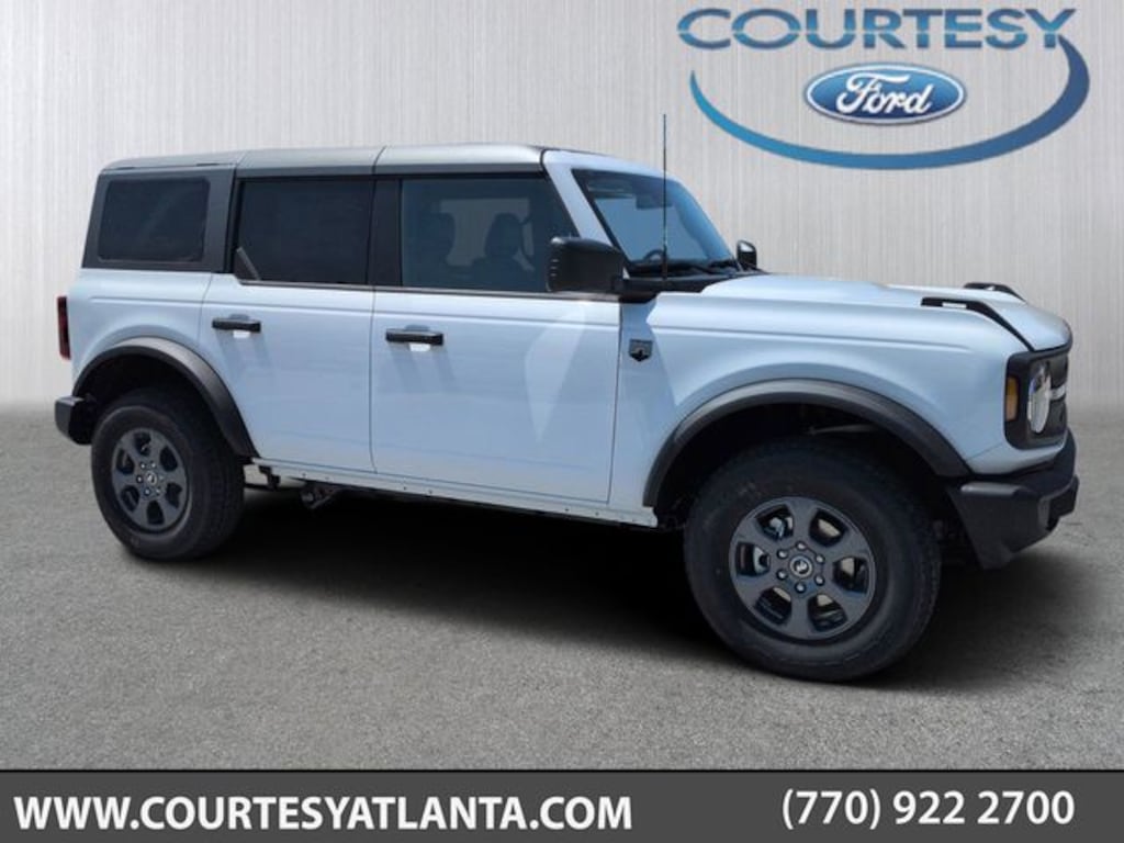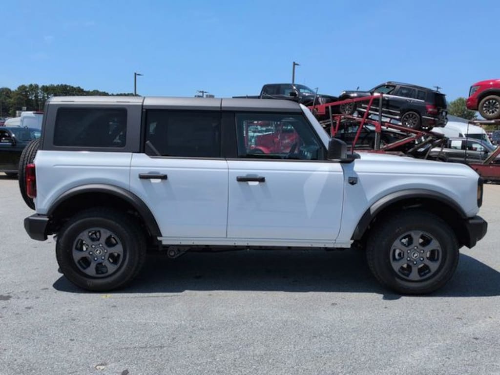 2025 Oxford White 2025 Ford Bronco Big Bend Big Bend 4D Sport Utility 4WD 2.3L EcoBoost I-4 4D Sport Utility, 2.3L EcoBoost I-4, 10-Speed Automatic, 4WD, 12" LCD Productivity Touchscreen, Auto Emergency Braking, Auto LED Headlights, Backup Camera, Bluetooth w/ Audio Streaming, Equipment Group 222A Mid Package, Hill Start Assist, Parking Sensors, Pre Collision Assist w/ AEB, Remote Start, Trailer Tow Package (DIO). Equipment Group 222A Mid Package (Connected Navigation), Trailer Tow Package (DIO), 4D Sport Utility, 2.3L EcoBoost I-4, 10-Speed Automatic, 4WD, 12" LCD Productivity Touchscreen, Auto Emergency Braking, Auto LED Headlights, Backup Camera, Bluetooth w/ Audio Streaming, Hill Start Assist, Parking Sensors, Pre Collision Assist w/ AEB, Remote Start, 4-Wheel Disc Brakes, 4.46 Axle Ratio, 7 Speakers, ABS brakes, Air Conditioning, Alloy wheels, AM/FM radio: SiriusXM with 360L, AM/FM Stereo, Auto High-beam Headlights, Brake assist, Carbonized Gray Molded-In-Color Hard Top, Cloth Bucket Seats, Compass, Delay-off headlights, Driver door bin, Driver vanity mirror, Dual front impact airbags, Dual front side impact airbags, Electronic Stability Control, Emergency communication system: 911 Assist, Exterior Parking Camera Rear, Front anti-roll bar, Front Bucket Seats, Front Center Armrest, Front reading lights, Front wheel independent suspension, Fully automatic headlights, Hard Top Sound Deadening Headliner, Heated door mirrors, Illuminated entry, Integrated roll-over protection, Leather Shift Knob, Low tire pressure warning, Occupant sensing airbag, Outside temperature display, Overhead airbag, Overhead console, Panic alarm, Passenger door bin, Passenger vanity mirror, Power door mirrors, Power steering, Power windows, Radio data system, Rear-Window Defroster & Washer, Remote keyless entry, Security system, SiriusXM w/360L, Speed control, Split folding rear seat, Steering wheel mounted audio controls, SYNC 4, Tachometer, Telescoping steering wheel, Tilt steering wheel, Traction control, Trip computer, Variably intermittent wipers, and Wheels: 17" Carbonized Gray-Painted Aluminum.