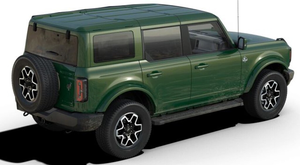 2025 Eruption Green Metallic 2025 Ford Bronco Outer Banks Outer Banks 4D Sport Utility 4WD 2.7L EcoBoost V6 4D Sport Utility, 2.7L EcoBoost V6, 10-Speed Automatic, 4WD, 12" LCD Productivity Touchscreen, 360-Degree Camera, 360-Degree Camera, Adaptive Cruise Control, Adaptive Cruise Control, Auto LED Headlights, Backup Camera, Equipment Group 314A Lux Package, Evasive Steering Assist, Front Parking Sensors, Information on Demand Panel, Luxury Package, Navigation system: Connected Navigation, Power Mirror Package, Power Package, Push Button Start, Radio: B&O Sound System by Bang & Olufsen, Sideview Mirrors, Trailer Tow Package (DIO), Universal Garage Door Opener. Equipment Group 314A Lux Package (360-Degree Camera, Adaptive Cruise Control, Evasive Steering Assist, Front Parking Sensors, Information on Demand Panel, Radio: B&O Sound System by Bang & Olufsen, Sideview Mirrors, and Universal Garage Door Opener), Trailer Tow Package (DIO), 4D Sport Utility, 2.7L EcoBoost V6, 10-Speed Automatic, 4WD, 12" LCD Productivity Touchscreen, 360-Degree Camera, Adaptive Cruise Control, Auto LED Headlights, Backup Camera, Luxury Package, Navigation system: Connected Navigation, Power Mirror Package, Power Package, Push Button Start, 18" Bright Machined Aluminum Wheels, 3.73 Axle Ratio, 4-Wheel Disc Brakes, 7 Speakers, ABS brakes, Air Conditioning, Alloy wheels, AM/FM radio: SiriusXM with 360L, AM/FM Stereo, Auto High-beam Headlights, Auto-dimming Rear-View mirror, Automatic temperature control, Brake assist, Compass, Connected Navigation, Delay-off headlights, Driver door bin, Driver vanity mirror, Dual front impact airbags, Dual front side impact airbags, Electronic Stability Control, Emergency communication system: 911 Assist, Exterior Parking Camera Rear, Front anti-roll bar, Front Bucket Seats, Front Center Armrest, Front dual zone A/C, Front fog lights, Front reading lights, Front wheel independent suspension, Fully automatic headlights, Hard Top Sound Deadening Headliner, Heated door mirrors, Heated front seats, Heated Leather-Trimmed/Vinyl Bucket Seats, Heated steering wheel, Illuminated entry, Integrated roll-over protection, Leather Shift Knob, Low tire pressure warning, Occupant sensing airbag, Outside temperature display, Overhead airbag, Overhead console, Painted Hard Top, Panic alarm, Passenger door bin, Passenger vanity mirror, Power door mirrors, Power driver seat, Power passenger seat, Power steering, Power windows, Radio data system, Rear seat center armrest, Rear-Window Defroster & Washer, Remote keyless entry, Security system, SiriusXM w/360L, Speed control, Split folding rear seat, Steering wheel mounted audio controls, SYNC 4, Tachometer, Telescoping steering wheel, Tilt steering wheel, Traction control, Trip computer, Variably intermittent wipers, and Voltmeter.