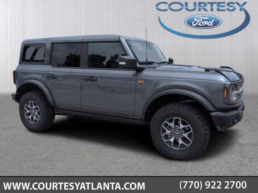 2025 Carbonized Gray Metallic 2025 Ford Bronco Badlands Badlands 4D Sport Utility 4WD 2.7L EcoBoost V6 360-Degree Camera, Adaptive Cruise Control, Auto Emergency Braking, Auto LED Headlights, Backup Camera, Hill Start Assist, Leather Seats, Pre Collision Assist w/ AEB, Remote Start, 4D Sport Utility, 2.7L EcoBoost V6, 10-Speed Automatic, 4WD, 360-Degree Camera, Adaptive Cruise Control, Body Color-Painted Hard Top, Equipment Group 334A Lux Package, Evasive Steering Assist, Front Parking Sensors, Hard Top Sound Deadening Headliner, Information on Demand Panel, Radio: B&O Sound System by Bang & Olufsen, Rear-Window Defroster & Washer, Sideview Mirrors, Trailer Tow Package (DIO), Universal Garage Door Opener. Equipment Group 334A Lux Package (360-Degree Camera, Adaptive Cruise Control, Evasive Steering Assist, Front Parking Sensors, Information on Demand Panel, Radio: B&O Sound System by Bang & Olufsen, Sideview Mirrors, Universal Garage Door Opener, and Connected Navigation), Trailer Tow Package (DIO), 4D Sport Utility, 2.7L EcoBoost V6, 10-Speed Automatic, 4WD, Body Color-Painted Hard Top, Hard Top Sound Deadening Headliner, Rear-Window Defroster & Washer, 4-Wheel Disc Brakes, 4.7 Axle Ratio, 7 Speakers, ABS brakes, Air Conditioning, Alloy wheels, AM/FM radio: SiriusXM with 360L, AM/FM Stereo, Auto High-beam Headlights, Auto-dimming Rear-View mirror, Brake assist, Compass, Delay-off headlights, Driver door bin, Driver vanity mirror, Dual front impact airbags, Dual front side impact airbags, Electronic Stability Control, Emergency communication system: 911 Assist, Exterior Parking Camera Rear, Front anti-roll bar, Front Bucket Seats, Front Center Armrest, Front fog lights, Front License Plate Bracket, Front reading lights, Front wheel independent suspension, Fully automatic headlights, Heated door mirrors, Heated front seats, Heated steering wheel, Illuminated entry, Integrated roll-over protection, Leather Shift Knob, Low tire pressure warning, Marine Grade Vinyl Heated Bucket Seats, Occupant sensing airbag, Outside temperature display, Overhead airbag, Overhead console, Panic alarm, Passenger door bin, Passenger vanity mirror, Power door mirrors, Power steering, Power windows, Radio data system, Remote keyless entry, Security system, SiriusXM w/360L, Speed control, Split folding rear seat, Steering wheel mounted audio controls, SYNC 4, Tachometer, Telescoping steering wheel, Tilt steering wheel, Traction control, Trip computer, Variably intermittent wipers, and Voltmeter.