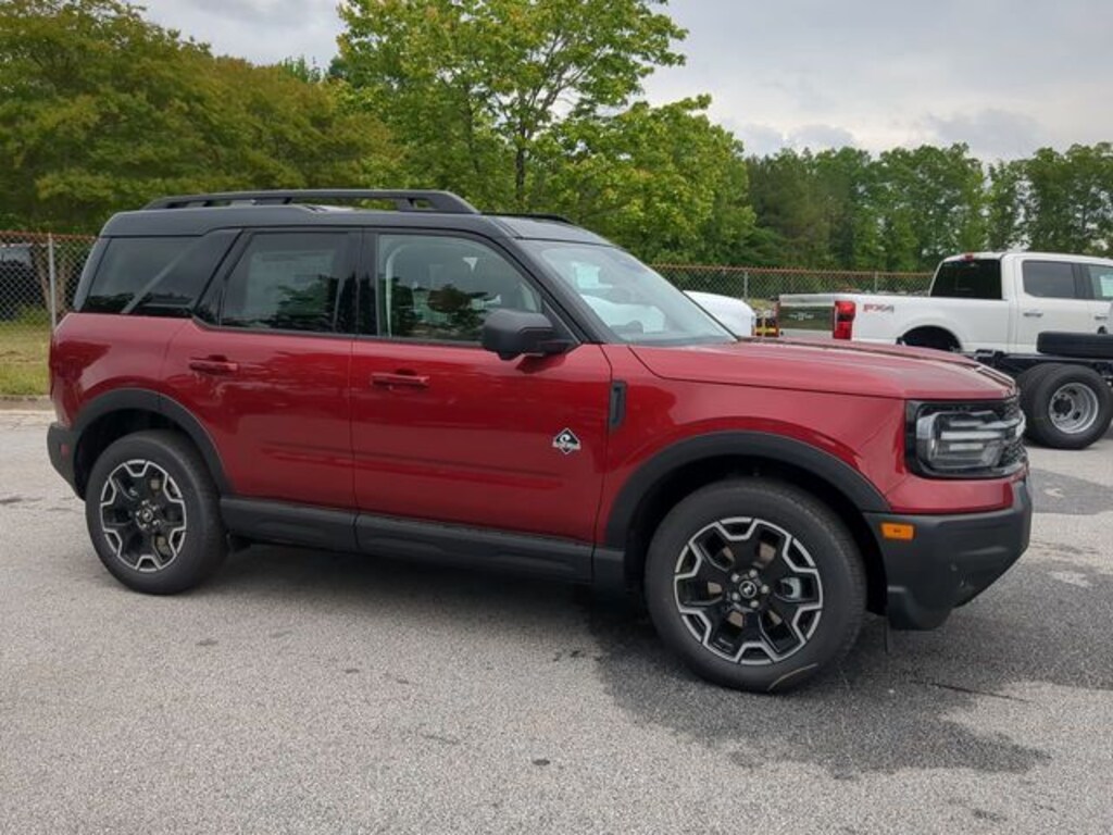 2025 Ruby Red Metallic Tinted Clearcoat 2025 Ford Bronco Sport Outer Banks Outer Banks 4D Sport Utility 4WD 1.5L EcoBoost 13.2" LCD Centerstack Touchscreen, Auto LED Headlights, Backup Camera, LED Foglights, Navigation System, Push Button Start, Remote Start, Sunroof/Moonroof, 4D Sport Utility, 1.5L EcoBoost, 8-Speed Automatic, 4WD, B&O Sound System by Bang & Olufsen, Connected Navigation, Equipment Group 300A, HD Radio, Outer Banks Tech Package+, SYNC 4 w/Enhanced Voice Recognition. Equipment Group 300A, Outer Banks Tech Package+ (B&O Sound System by Bang & Olufsen, Connected Navigation, and HD Radio), 4D Sport Utility, 1.5L EcoBoost, 8-Speed Automatic, 4WD, SYNC 4 w/Enhanced Voice Recognition, 360-Degree Camera w/Trail & Split View, 4-Wheel Disc Brakes, 6 Speakers, ABS brakes, Air Conditioning, Alloy wheels, AM/FM radio: SiriusXM, AM/FM Stereo, Auto High-beam Headlights, Auto-dimming Rear-View mirror, Automatic temperature control, Brake assist, Compass, Delay-off headlights, Driver door bin, Driver vanity mirror, Dual front impact airbags, Dual front side impact airbags, Electronic Stability Control, Emergency communication system: SYNC 4 911 Assist, Four wheel independent suspension, Front anti-roll bar, Front Bucket Seats, Front Center Armrest, Front Driver/Passenger Seat Back Map Pockets, Front dual zone A/C, Front fog lights, Front Parking Sensors, Front reading lights, Fully automatic headlights, Garage door transmitter, Heated door mirrors, Heated front seats, Heated steering wheel, Illuminated entry, Knee airbag, Low tire pressure warning, Memory seat, Occupant sensing airbag, Outside temperature display, Overhead airbag, Overhead console, Panic alarm, Passenger door bin, Passenger vanity mirror, Power door mirrors, Power driver seat, Power Moonroof, Power passenger seat, Power steering, Power windows, Premium Trimmed Front Bucket Seats w/Ebony/Roast, Radio data system, Rain sensing wipers, Rear anti-roll bar, Rear Parking Sensors, Rear reading lights, Rear seat center armrest, Rear window defroster, Rear window wiper, Remote keyless entry, Reverse Brake Assist, Security system, SiriusXM, Speed control, Speed-sensing steering, Speed-Sensitive Wipers, Split folding rear seat, Steering wheel mounted audio controls, Tachometer, Telescoping steering wheel, Tilt steering wheel, Traction control, Trip computer, Variably intermittent wipers, and Wheels: 18" Ebony Black-Painted Aluminum.