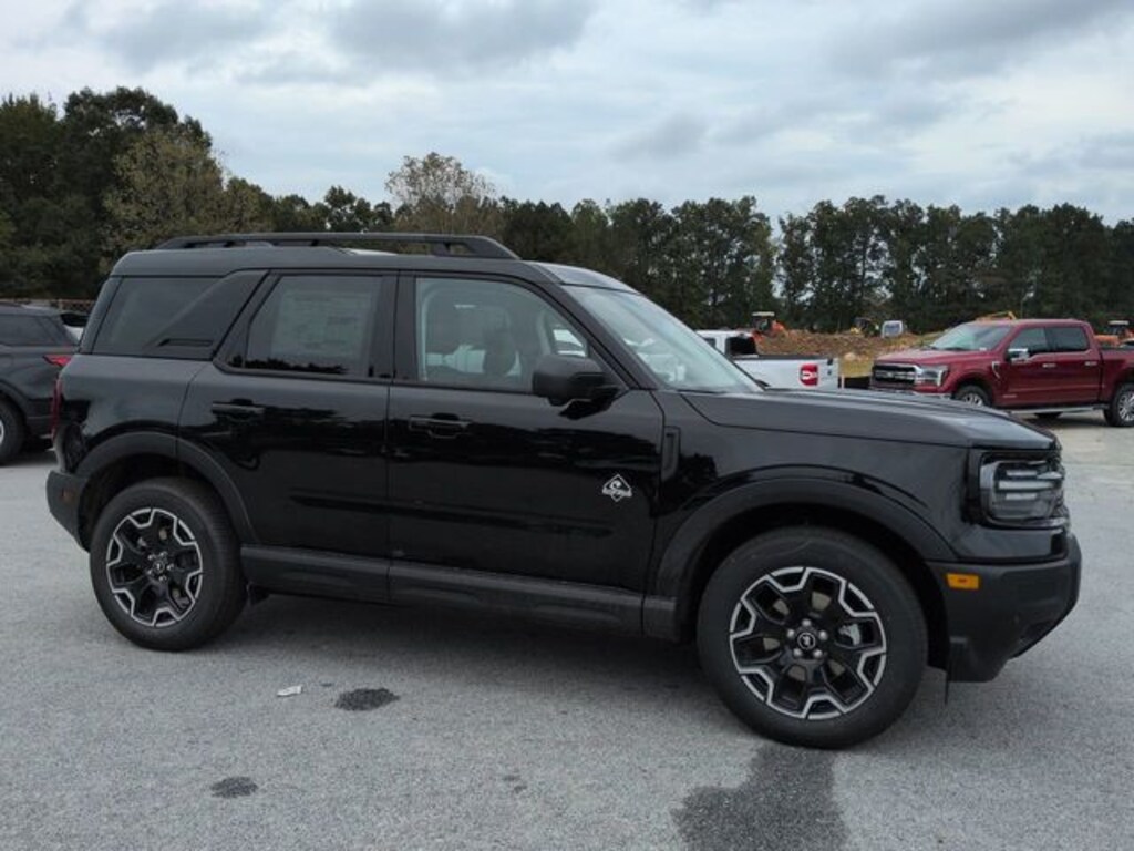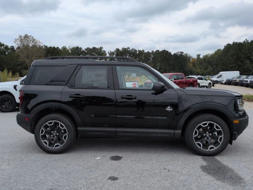 2025 Shadow Black 2025 Ford Bronco Sport Outer Banks Outer Banks 4D Sport Utility 4WD 1.5L EcoBoost 4D Sport Utility, 1.5L EcoBoost, 8-Speed Automatic, 4WD, Auto LED Headlights, B&O Sound System by Bang & Olufsen, Backup Camera, Connected Navigation, Equipment Group 300A, HD Radio, LED Foglights, Outer Banks Tech Package+, Premium Sound Package, Push Button Start, Rain sensing wipers, Rear window wiper, Remote Start, Speed-Sensitive Wipers, Sunroof/Moonroof, SYNC 4 w/Enhanced Voice Recognition. Equipment Group 300A, Outer Banks Tech Package+ (B&O Sound System by Bang & Olufsen, Connected Navigation, and HD Radio), 4D Sport Utility, 1.5L EcoBoost, 8-Speed Automatic, 4WD, Auto LED Headlights, Backup Camera, LED Foglights, Premium Sound Package, Push Button Start, Rain sensing wipers, Rear window wiper, Remote Start, Speed-Sensitive Wipers, Sunroof/Moonroof, SYNC 4 w/Enhanced Voice Recognition, 360-Degree Camera w/Trail & Split View, 4-Wheel Disc Brakes, 6 Speakers, ABS brakes, Air Conditioning, Alloy wheels, AM/FM radio: SiriusXM, AM/FM Stereo, Auto High-beam Headlights, Auto-dimming Rear-View mirror, Automatic temperature control, Brake assist, Compass, Delay-off headlights, Driver door bin, Driver vanity mirror, Dual front impact airbags, Dual front side impact airbags, Electronic Stability Control, Emergency communication system: SYNC 4 911 Assist, Four wheel independent suspension, Front anti-roll bar, Front Bucket Seats, Front Center Armrest, Front Driver/Passenger Seat Back Map Pockets, Front dual zone A/C, Front fog lights, Front Parking Sensors, Front reading lights, Fully automatic headlights, Garage door transmitter, Heated door mirrors, Heated front seats, Heated steering wheel, Illuminated entry, Knee airbag, Low tire pressure warning, Memory seat, Occupant sensing airbag, Outside temperature display, Overhead airbag, Overhead console, Panic alarm, Passenger door bin, Passenger vanity mirror, Power door mirrors, Power driver seat, Power Moonroof, Power passenger seat, Power steering, Power windows, Premium Trimmed Front Bucket Seats w/Ebony/Roast, Radio data system, Rear anti-roll bar, Rear Parking Sensors, Rear reading lights, Rear seat center armrest, Rear window defroster, Remote keyless entry, Reverse Brake Assist, Security system, SiriusXM, Speed control, Speed-sensing steering, Split folding rear seat, Steering wheel mounted audio controls, Tachometer, Telescoping steering wheel, Tilt steering wheel, Traction control, Trip computer, and Wheels: 18" Ebony Black-Painted Aluminum.