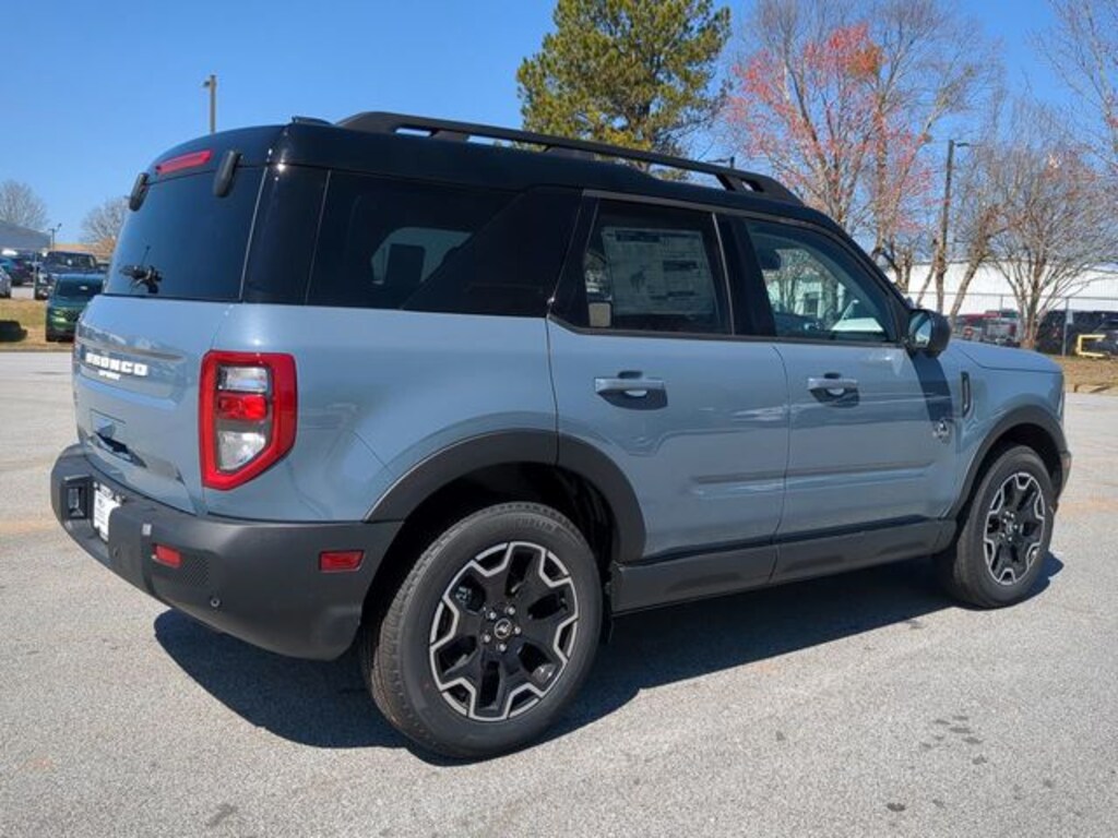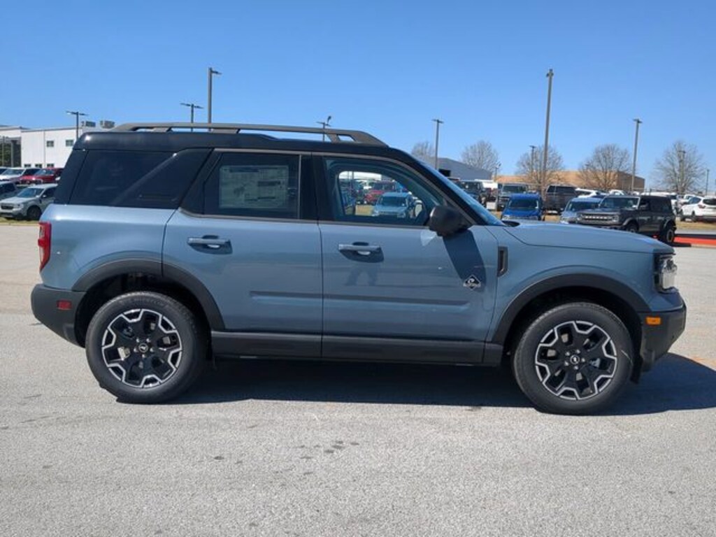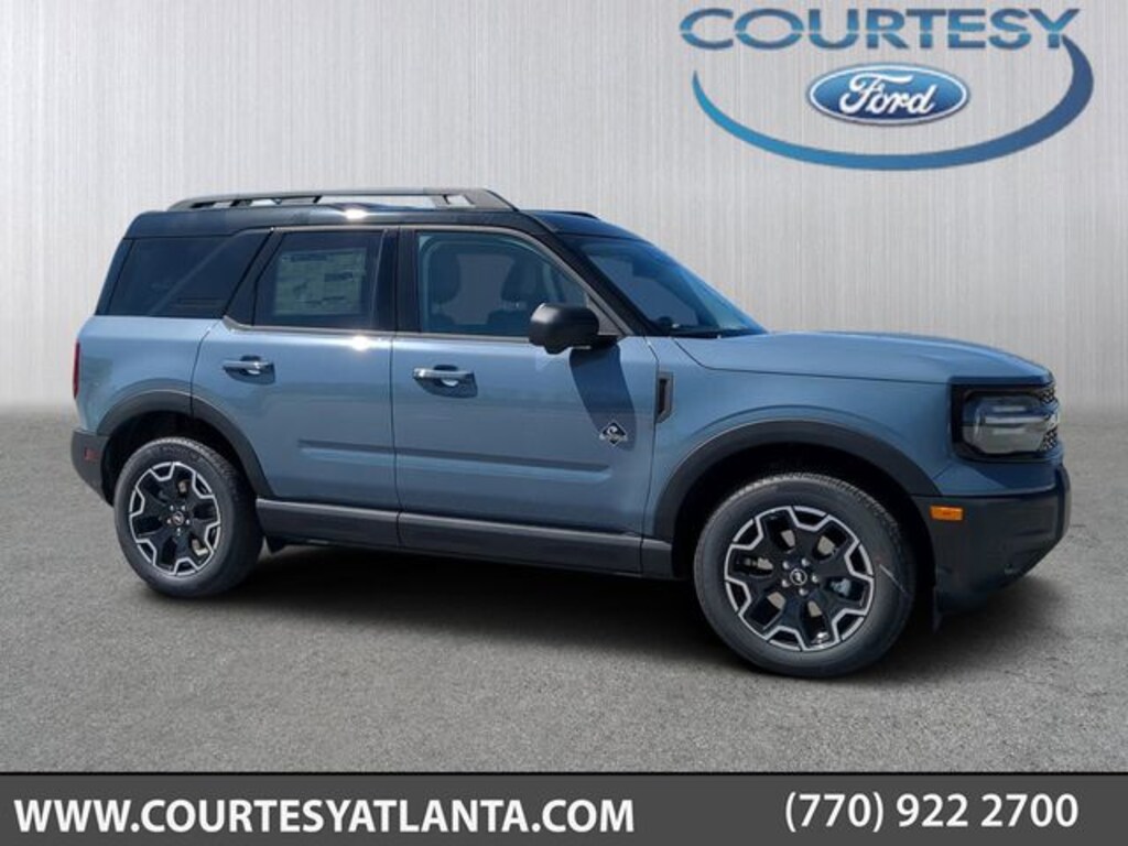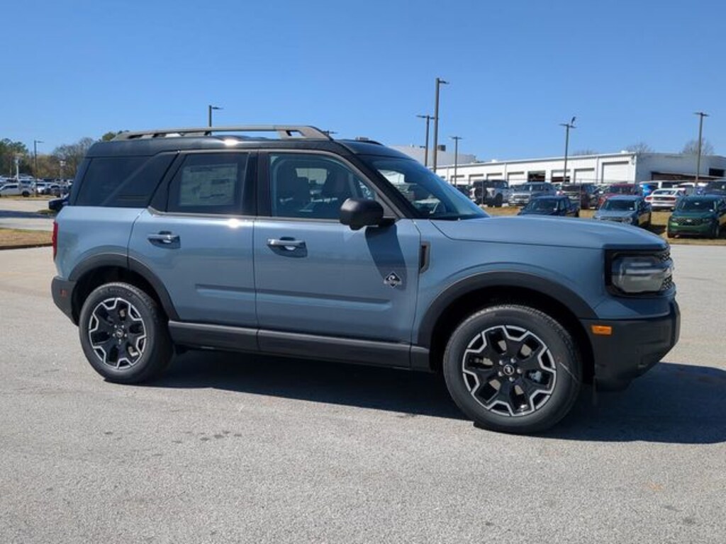 2025 Azure Gray Metallic Tri-Coat 2025 Ford Bronco Sport Outer Banks Outer Banks 4D Sport Utility 4WD 1.5L EcoBoost 13.2" LCD Centerstack Touchscreen, Auto LED Headlights, Backup Camera, LED Foglights, Push Button Start, Remote Start, 4D Sport Utility, 1.5L EcoBoost, 8-Speed Automatic, 4WD, B&O Sound System by Bang & Olufsen, Connected Navigation, Equipment Group 300A, HD Radio, Outer Banks Tech Package+. Equipment Group 300A, Outer Banks Tech Package+ (B&O Sound System by Bang & Olufsen, Connected Navigation, and HD Radio), 4D Sport Utility, 1.5L EcoBoost, 8-Speed Automatic, 4WD, 4-Wheel Disc Brakes, 6 Speakers, ABS brakes, Air Conditioning, Alloy wheels, AM/FM radio: SiriusXM, AM/FM Stereo, Auto High-beam Headlights, Auto-dimming Rear-View mirror, Automatic temperature control, Brake assist, Compass, Delay-off headlights, Driver door bin, Driver vanity mirror, Dual front impact airbags, Dual front side impact airbags, Electronic Stability Control, Emergency communication system: SYNC 4 911 Assist, Four wheel independent suspension, Front anti-roll bar, Front Bucket Seats, Front Center Armrest, Front Driver/Passenger Seat Back Map Pockets, Front dual zone A/C, Front fog lights, Front Parking Sensors, Front reading lights, Fully automatic headlights, Garage door transmitter, Heated door mirrors, Heated front seats, Heated steering wheel, Illuminated entry, Knee airbag, Low tire pressure warning, Memory seat, Occupant sensing airbag, Outside temperature display, Overhead airbag, Overhead console, Panic alarm, Passenger door bin, Passenger vanity mirror, Power door mirrors, Power driver seat, Power passenger seat, Power steering, Power windows, Premium Trimmed Front Bucket Seats w/Ebony/Roast, Radio data system, Rain sensing wipers, Rear anti-roll bar, Rear Parking Sensors, Rear reading lights, Rear seat center armrest, Rear window defroster, Rear window wiper, Remote keyless entry, Reverse Brake Assist, Security system, SiriusXM, Speed control, Speed-sensing steering, Speed-Sensitive Wipers, Split folding rear seat, Steering wheel mounted audio controls, SYNC 4 w/Enhanced Voice Recognition, Tachometer, Telescoping steering wheel, Tilt steering wheel, Traction control, Trip computer, Variably intermittent wipers, and Wheels: 18" Ebony Black-Painted Aluminum.