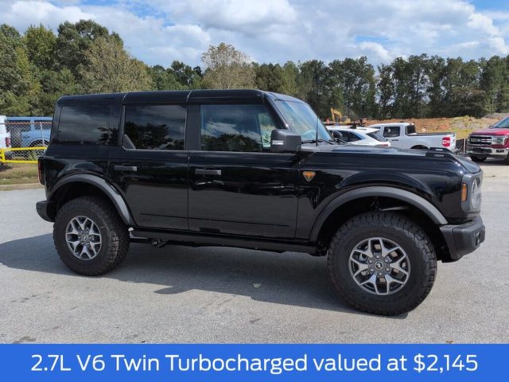 2025 Shadow Black 2025 Ford Bronco Badlands Badlands 4D Sport Utility 4WD 2.7L EcoBoost V6 4D Sport Utility, 2.7L EcoBoost V6, 10-Speed Automatic, 4WD, 12" LCD Productivity Touchscreen, 360-Degree Camera, Adaptive Cruise Control, Auto Emergency Braking, Auto LED Headlights, Backup Camera, Equipment Group 334A Lux Package, Evasive Steering Assist, Front Parking Sensors, Hard Top Sound Deadening Headliner, Hill Start Assist, Information on Demand Panel, Pre Collision Assist w/ AEB, Push Button Start, Radio: B&O Sound System by Bang & Olufsen, Rear-Window Defroster & Washer, Remote Start, Shadow Black Painted Hard Top, Sideview Mirrors, Trailer Tow Package (DIO), Universal Garage Door Opener. Equipment Group 334A Lux Package (360-Degree Camera, Adaptive Cruise Control, Evasive Steering Assist, Front Parking Sensors, Information on Demand Panel, Radio: B&O Sound System by Bang & Olufsen, Sideview Mirrors, Universal Garage Door Opener, and Connected Navigation), Trailer Tow Package (DIO), 4D Sport Utility, 2.7L EcoBoost V6, 10-Speed Automatic, 4WD, 12" LCD Productivity Touchscreen, Auto Emergency Braking, Auto LED Headlights, Backup Camera, Hard Top Sound Deadening Headliner, Hill Start Assist, Pre Collision Assist w/ AEB, Push Button Start, Rear-Window Defroster & Washer, Remote Start, Shadow Black Painted Hard Top, 4-Wheel Disc Brakes, 4.7 Axle Ratio, 7 Speakers, ABS brakes, Air Conditioning, Alloy wheels, AM/FM radio: SiriusXM with 360L, AM/FM Stereo, Auto High-beam Headlights, Auto-dimming Rear-View mirror, Brake assist, Compass, Delay-off headlights, Driver door bin, Driver vanity mirror, Dual front impact airbags, Dual front side impact airbags, Electronic Stability Control, Emergency communication system: 911 Assist, Exterior Parking Camera Rear, Front anti-roll bar, Front Bucket Seats, Front Center Armrest, Front fog lights, Front reading lights, Front wheel independent suspension, Fully automatic headlights, Heated door mirrors, Heated front seats, Heated steering wheel, Illuminated entry, Integrated roll-over protection, Leather Shift Knob, Leather-Trimmed/Vinyl Bucket Seats, Low tire pressure warning, Marine Grade Vinyl Heated Bucket Seats, Occupant sensing airbag, Outside temperature display, Overhead airbag, Overhead console, Panic alarm, Passenger door bin, Passenger vanity mirror, Power door mirrors, Power steering, Power windows, Radio data system, Remote keyless entry, Security system, SiriusXM w/360L, Speed control, Split folding rear seat, Steering wheel mounted audio controls, SYNC 4, Tachometer, Telescoping steering wheel, Tilt steering wheel, Traction control, Trip computer, Variably intermittent wipers, and Voltmeter.