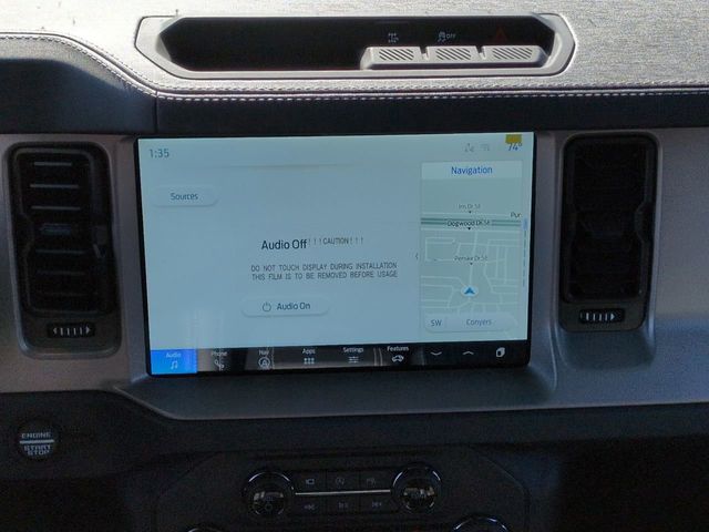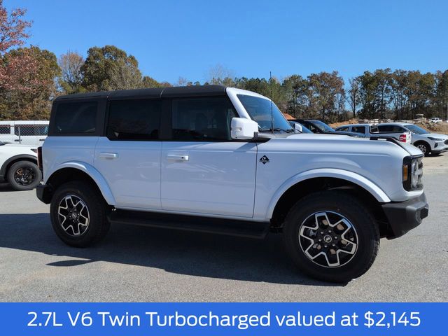 2025 Oxford White 2025 Ford Bronco Outer Banks Outer Banks 4D Sport Utility 4WD 2.7L EcoBoost V6 4D Sport Utility, 2.7L EcoBoost V6, 10-Speed Automatic, 4WD, 12" LCD Productivity Touchscreen, 360-Degree Camera, 360-Degree Camera, Adaptive Cruise Control, Adaptive Cruise Control, Auto LED Headlights, Backup Camera, Carbonized Gray Molded-In-Color Hard Top, Equipment Group 314A Lux Package, Evasive Steering Assist, Front Parking Sensors, Hard Top Sound Deadening Headliner, Hill Start Assist, Information on Demand Panel, Navigation system: Connected Navigation, Radio: B&O Sound System by Bang & Olufsen, Rear-Window Defroster & Washer, Sideview Mirrors, Trailer Tow Package (DIO), Universal Garage Door Opener. Equipment Group 314A Lux Package (360-Degree Camera, Adaptive Cruise Control, Evasive Steering Assist, Front Parking Sensors, Information on Demand Panel, Radio: B&O Sound System by Bang & Olufsen, Sideview Mirrors, and Universal Garage Door Opener), Trailer Tow Package (DIO), 4D Sport Utility, 2.7L EcoBoost V6, 10-Speed Automatic, 4WD, 12" LCD Productivity Touchscreen, 360-Degree Camera, Adaptive Cruise Control, Auto LED Headlights, Backup Camera, Carbonized Gray Molded-In-Color Hard Top, Hard Top Sound Deadening Headliner, Hill Start Assist, Navigation system: Connected Navigation, Rear-Window Defroster & Washer, 18" Bright Machined Aluminum Wheels, 3.73 Axle Ratio, 4-Wheel Disc Brakes, 7 Speakers, ABS brakes, Air Conditioning, Alloy wheels, AM/FM radio: SiriusXM with 360L, AM/FM Stereo, Auto High-beam Headlights, Auto-dimming Rear-View mirror, Automatic temperature control, Brake assist, Compass, Connected Navigation, Delay-off headlights, Driver door bin, Driver vanity mirror, Dual front impact airbags, Dual front side impact airbags, Electronic Stability Control, Emergency communication system: 911 Assist, Exterior Parking Camera Rear, Front anti-roll bar, Front Bucket Seats, Front Center Armrest, Front dual zone A/C, Front fog lights, Front reading lights, Front wheel independent suspension, Fully automatic headlights, Heated door mirrors, Heated front seats, Heated Leather-Trimmed/Vinyl Bucket Seats, Heated steering wheel, Illuminated entry, Integrated roll-over protection, Leather Shift Knob, Low tire pressure warning, Occupant sensing airbag, Outside temperature display, Overhead airbag, Overhead console, Panic alarm, Passenger door bin, Passenger vanity mirror, Power door mirrors, Power driver seat, Power passenger seat, Power steering, Power windows, Radio data system, Rear seat center armrest, Remote keyless entry, Security system, SiriusXM w/360L, Speed control, Split folding rear seat, Steering wheel mounted audio controls, SYNC 4, Tachometer, Telescoping steering wheel, Tilt steering wheel, Traction control, Trip computer, Variably intermittent wipers, and Voltmeter. $1,000 - Exp. 12/31/2026 Retail Trade Assistance. Must trade in a vehicle to qualify $1,000 - Exp. 12/31/2026 Dealer Finance Assistance. Must finance through dealer lender to qualify.