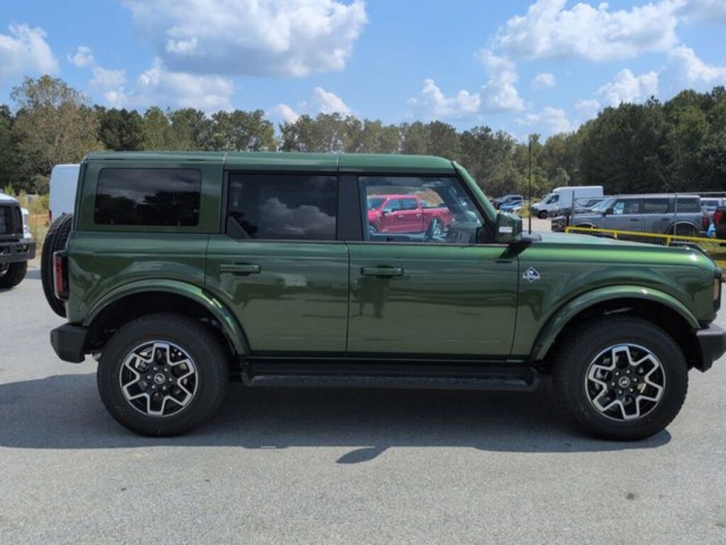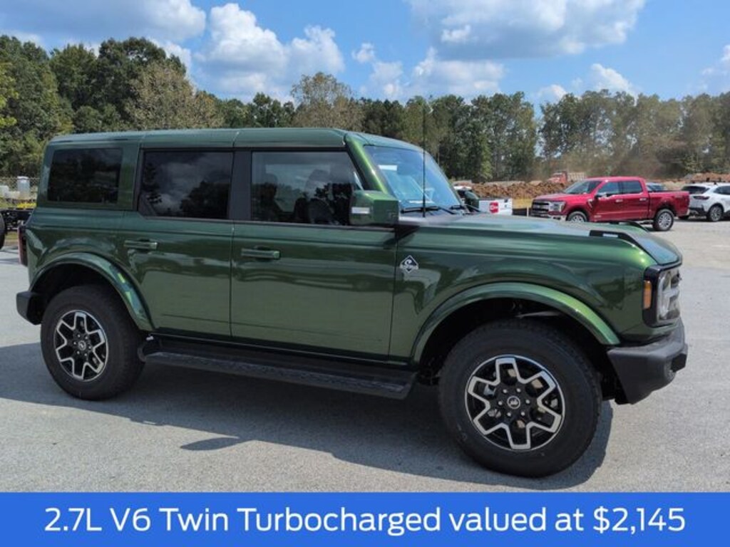 2025 Eruption Green Metallic 2025 Ford Bronco Outer Banks Outer Banks 4D Sport Utility 4WD 2.7L EcoBoost V6 4D Sport Utility, 2.7L EcoBoost V6, 10-Speed Automatic, 4WD, 12" LCD Productivity Touchscreen, 360-Degree Camera, 360-Degree Camera, Adaptive Cruise Control, Adaptive Cruise Control, Auto LED Headlights, Backup Camera, Equipment Group 314A Lux Package, Evasive Steering Assist, Front Parking Sensors, Hard Top Sound Deadening Headliner, Hill Start Assist, Information on Demand Panel, Leather Seats, Navigation system: Connected Navigation, Painted Hard Top, Push Button Start, Radio: B&O Sound System by Bang & Olufsen, Rear-Window Defroster & Washer, Sideview Mirrors, Trailer Tow Package (DIO), Universal Garage Door Opener. Equipment Group 314A Lux Package (360-Degree Camera, Adaptive Cruise Control, Evasive Steering Assist, Front Parking Sensors, Information on Demand Panel, Radio: B&O Sound System by Bang & Olufsen, Sideview Mirrors, and Universal Garage Door Opener), Trailer Tow Package (DIO), 4D Sport Utility, 2.7L EcoBoost V6, 10-Speed Automatic, 4WD, 12" LCD Productivity Touchscreen, 360-Degree Camera, Adaptive Cruise Control, Auto LED Headlights, Backup Camera, Hard Top Sound Deadening Headliner, Hill Start Assist, Leather Seats, Navigation system: Connected Navigation, Painted Hard Top, Push Button Start, Rear-Window Defroster & Washer, 18" Bright Machined Aluminum Wheels, 3.73 Axle Ratio, 4-Wheel Disc Brakes, 7 Speakers, ABS brakes, Air Conditioning, Alloy wheels, AM/FM radio: SiriusXM with 360L, AM/FM Stereo, Auto High-beam Headlights, Auto-dimming Rear-View mirror, Automatic temperature control, Brake assist, Compass, Connected Navigation, Delay-off headlights, Driver door bin, Driver vanity mirror, Dual front impact airbags, Dual front side impact airbags, Electronic Stability Control, Emergency communication system: 911 Assist, Exterior Parking Camera Rear, Front anti-roll bar, Front Bucket Seats, Front Center Armrest, Front dual zone A/C, Front fog lights, Front reading lights, Front wheel independent suspension, Fully automatic headlights, Heated door mirrors, Heated front seats, Heated Leather-Trimmed/Vinyl Bucket Seats, Heated steering wheel, Illuminated entry, Integrated roll-over protection, Leather Shift Knob, Low tire pressure warning, Occupant sensing airbag, Outside temperature display, Overhead airbag, Overhead console, Panic alarm, Passenger door bin, Passenger vanity mirror, Power door mirrors, Power driver seat, Power passenger seat, Power steering, Power windows, Radio data system, Rear seat center armrest, Remote keyless entry, Security system, SiriusXM w/360L, Speed control, Split folding rear seat, Steering wheel mounted audio controls, SYNC 4, Tachometer, Telescoping steering wheel, Tilt steering wheel, Traction control, Trip computer, Variably intermittent wipers, and Voltmeter.
