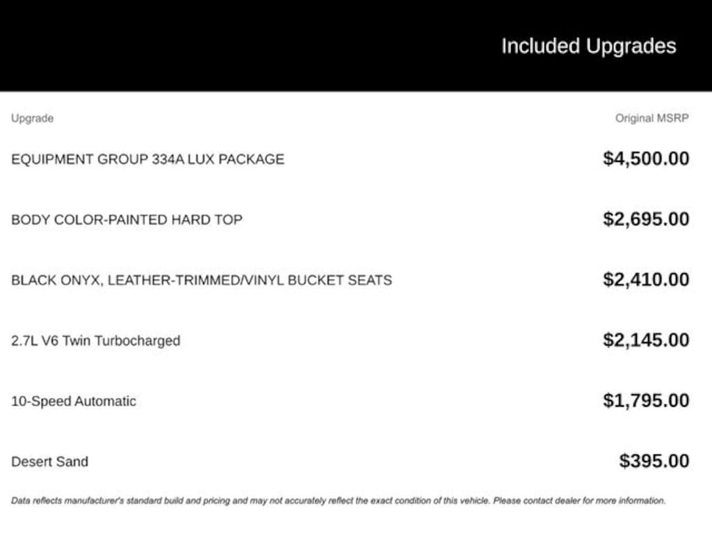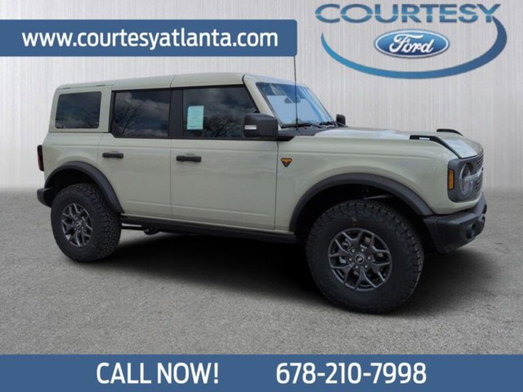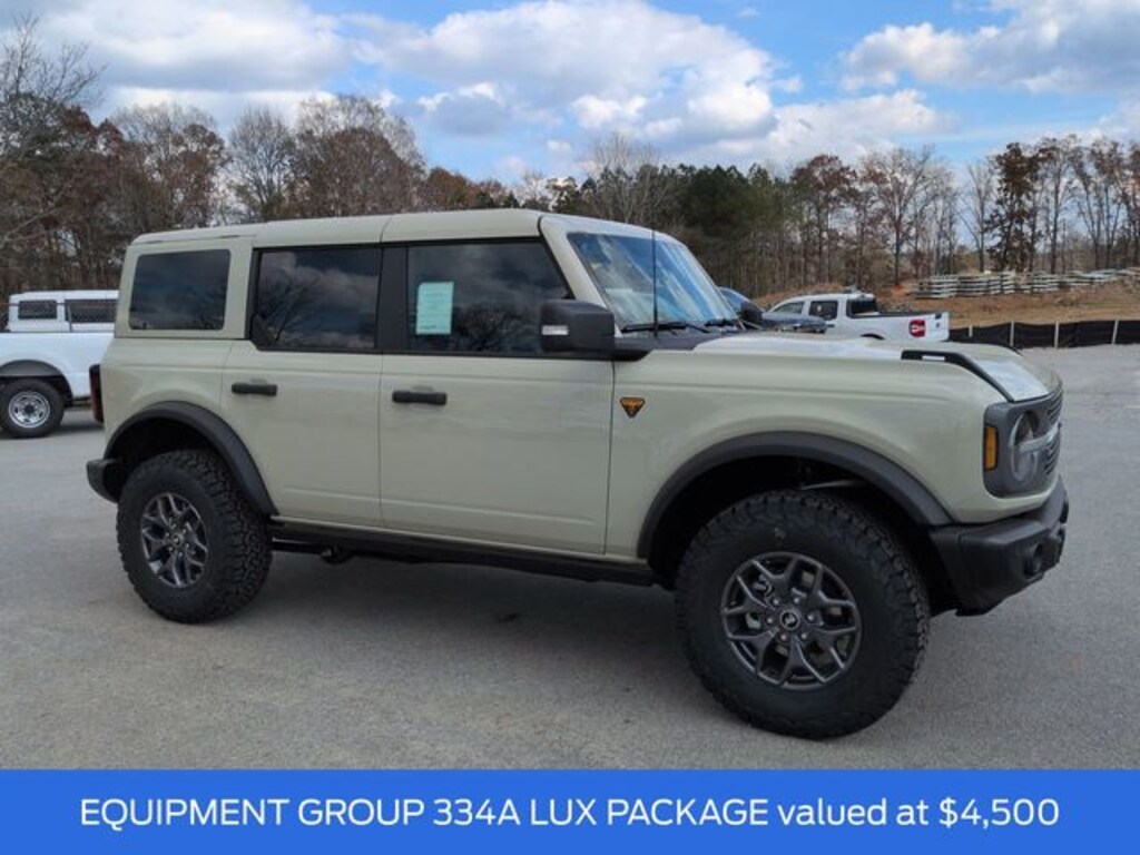 2025 Desert Sand 2025 Ford Bronco Badlands Badlands 4D Sport Utility 4WD 2.7L EcoBoost V6 Equipment Group 334A Lux Package (2-Door Intelligent Access w/Lock/Unlock, 360-Degree Camera, Adaptive Cruise Control, Ambient Footwell Lighting, Connected Navigation, Dr & Pass Illuminated Sliding Visor Vanity Mirrors, Dual Smart Charging USB Ports, Dual-Zone Electronic Automatic Temperature Control, Evasive Steering Assist, Front Parking Sensors, Front Row Heated Seats, Information on Demand Panel, Power Outlet - Back Side of Center Floor Console, Radio: B&O Sound System by Bang & Olufsen, Rear Parking Sensors, Sideview Mirrors, and Universal Garage Door Opener), 4-Wheel Disc Brakes, 4.7 Axle Ratio, 7 Speakers, ABS brakes, Air Conditioning, Alloy wheels, AM/FM radio: SiriusXM with 360L, AM/FM Stereo, Auto High-Beam Headlamps, Auto High-beam Headlights, Auto-dimming Rear-View mirror, BLIS Blind Spot Information System, Body Color-Painted Hard Top, Brake assist, Compass, Delay-off headlights, Driver door bin, Driver vanity mirror, Dual front impact airbags, Dual front side impact airbags, Electronic Stability Control, Emergency communication system: 911 Assist, Exterior Parking Camera Rear, Front anti-roll bar, Front Bucket Seats, Front Center Armrest, Front fog lights, Front reading lights, Front wheel independent suspension, Fully automatic headlights, Hard Top Sound Deadening Headliner, Heated door mirrors, Heated front seats, Heated steering wheel, Illuminated entry, Integrated roll-over protection, Lane-Keeping System, Leather Shift Knob, Leather-Trimmed/Vinyl Bucket Seats, Low tire pressure warning, Marine Grade Vinyl Heated Bucket Seats, Occupant sensing airbag, Outside temperature display, Overhead airbag, Overhead console, Panic alarm, Passenger door bin, Passenger vanity mirror, Power door mirrors, Power steering, Power windows, Pre-Collision Assist w/Automatic Emergency Braking, Radio data system, Rear-View Camera, Rear-Window Defroster & Washer, Remote keyless entry, Security system, SiriusXM w/360L, Speed control, Split folding rear seat, Steering wheel mounted audio controls, SYNC 4, Tachometer, Telescoping steering wheel, Tilt steering wheel, Traction control, Trip computer, Variably intermittent wipers, Voltmeter, and Wheels: 17" Carbonized Gray-Painted Aluminum.