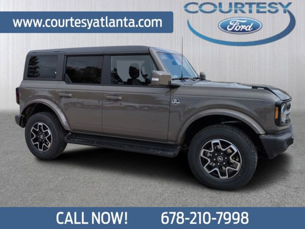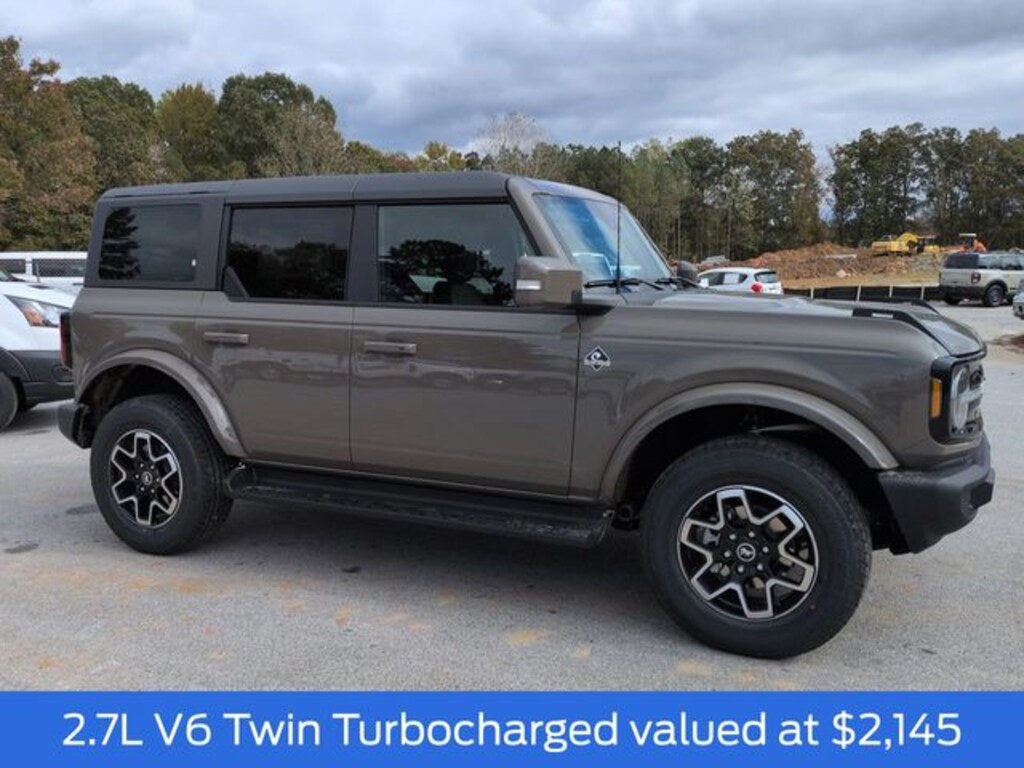 2025 Marsh Gray 2025 Ford Bronco Outer Banks Outer Banks 4D Sport Utility 4WD 2.7L EcoBoost V6 4D Sport Utility, 2.7L EcoBoost V6, 10-Speed Automatic, 4WD, 12" LCD Productivity Touchscreen, 360-Degree Camera, 360-Degree Camera, Adaptive Cruise Control, Adaptive Cruise Control, Auto LED Headlights, Backup Camera, Carbonized Gray Molded-In-Color Hard Top, Equipment Group 314A Lux Package, Evasive Steering Assist, Front Parking Sensors, Hard Top Sound Deadening Headliner, Hill Start Assist, Information on Demand Panel, Navigation system: Connected Navigation, Push Button Start, Radio: B&O Sound System by Bang & Olufsen, Rear-Window Defroster & Washer, Sideview Mirrors, Universal Garage Door Opener. Equipment Group 314A Lux Package (360-Degree Camera, Adaptive Cruise Control, Evasive Steering Assist, Front Parking Sensors, Information on Demand Panel, Radio: B&O Sound System by Bang & Olufsen, Sideview Mirrors, and Universal Garage Door Opener), 4D Sport Utility, 2.7L EcoBoost V6, 10-Speed Automatic, 4WD, 12" LCD Productivity Touchscreen, 360-Degree Camera, Adaptive Cruise Control, Auto LED Headlights, Backup Camera, Carbonized Gray Molded-In-Color Hard Top, Hard Top Sound Deadening Headliner, Hill Start Assist, Navigation system: Connected Navigation, Push Button Start, Rear-Window Defroster & Washer, 18" Bright Machined Aluminum Wheels, 3.73 Axle Ratio, 4-Wheel Disc Brakes, 7 Speakers, ABS brakes, Air Conditioning, Alloy wheels, AM/FM radio: SiriusXM with 360L, AM/FM Stereo, Auto High-beam Headlights, Auto-dimming Rear-View mirror, Automatic temperature control, Brake assist, Compass, Connected Navigation, Delay-off headlights, Driver door bin, Driver vanity mirror, Dual front impact airbags, Dual front side impact airbags, Electronic Stability Control, Emergency communication system: 911 Assist, Exterior Parking Camera Rear, Front anti-roll bar, Front Bucket Seats, Front Center Armrest, Front dual zone A/C, Front fog lights, Front reading lights, Front wheel independent suspension, Fully automatic headlights, Heated door mirrors, Heated front seats, Heated Leather-Trimmed/Vinyl Bucket Seats, Heated steering wheel, Illuminated entry, Integrated roll-over protection, Leather Shift Knob, Low tire pressure warning, Occupant sensing airbag, Outside temperature display, Overhead airbag, Overhead console, Panic alarm, Passenger door bin, Passenger vanity mirror, Power door mirrors, Power driver seat, Power passenger seat, Power steering, Power windows, Radio data system, Rear seat center armrest, Remote keyless entry, Security system, SiriusXM w/360L, Speed control, Split folding rear seat, Steering wheel mounted audio controls, SYNC 4, Tachometer, Telescoping steering wheel, Tilt steering wheel, Traction control, Trip computer, Variably intermittent wipers, and Voltmeter.