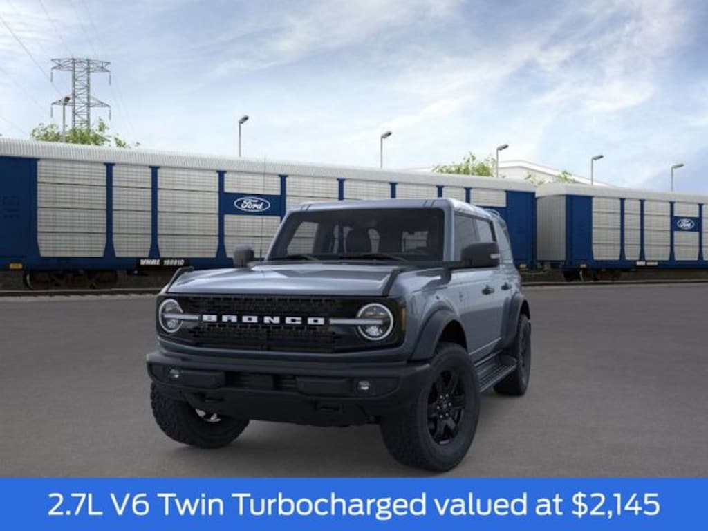 2025 Azure Gray Metallic Tri-Coat 2025 Ford Bronco Outer Banks Outer Banks 4D Sport Utility 4WD 2.7L EcoBoost V6 Black Appearance Package (Black Molded-In-Color Door Handles, Black Molded-In-Color Fender Flares, Black Molded-In-Color Sideview Mirror Caps, and Black-Painted Molded-In-Color Grille), 18" Bright Machined Aluminum Wheels, 3.73 Axle Ratio, 4-Wheel Disc Brakes, 7 Speakers, ABS brakes, Air Conditioning, Alloy wheels, AM/FM radio: SiriusXM with 360L, AM/FM Stereo, Auto High-beam Headlights, Auto-dimming Rear-View mirror, Automatic temperature control, Brake assist, Compass, Connected Navigation, Delay-off headlights, Driver door bin, Driver vanity mirror, Dual front impact airbags, Dual front side impact airbags, Electronic Stability Control, Emergency communication system: 911 Assist, Exterior Parking Camera Rear, Front anti-roll bar, Front Bucket Seats, Front Center Armrest, Front dual zone A/C, Front fog lights, Front reading lights, Front wheel independent suspension, Fully automatic headlights, Hard Top Sound Deadening Headliner, Heated door mirrors, Heated front seats, Heated Leather-Trimmed/Vinyl Bucket Seats, Heated steering wheel, Illuminated entry, Integrated roll-over protection, Leather Shift Knob, Low tire pressure warning, Navigation system: Connected Navigation, Occupant sensing airbag, Outside temperature display, Overhead airbag, Overhead console, Panic alarm, Passenger door bin, Passenger vanity mirror, Power door mirrors, Power driver seat, Power passenger seat, Power steering, Power windows, Radio data system, Rear seat center armrest, Rear-Window Defroster & Washer, Remote keyless entry, Security system, Shadow Black-Painted Hard Top, SiriusXM w/360L, Speed control, Split folding rear seat, Steering wheel mounted audio controls, SYNC 4, Tachometer, Telescoping steering wheel, Tilt steering wheel, Traction control, Trip computer, Variably intermittent wipers, and Voltmeter.