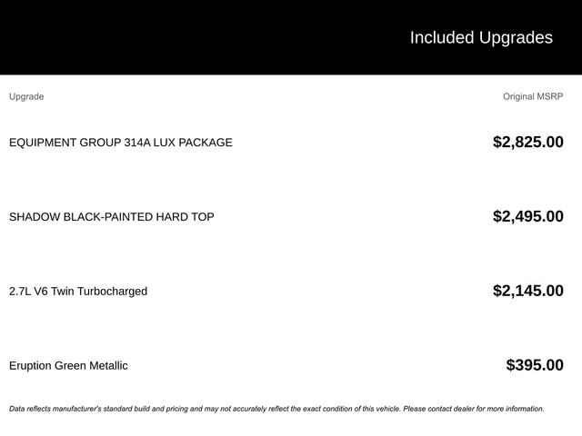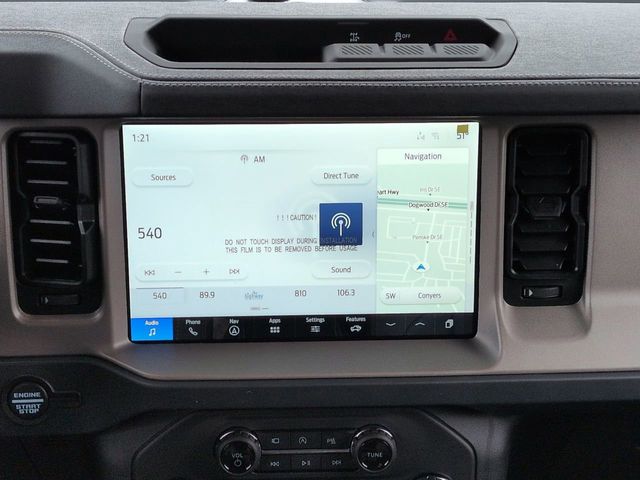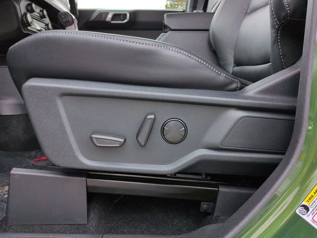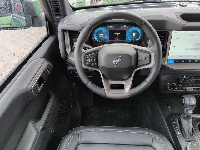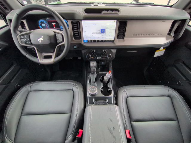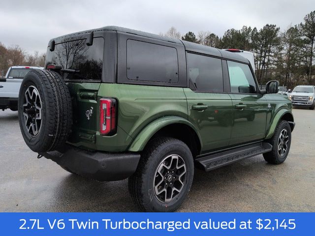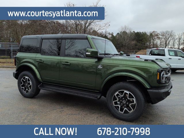2025 Eruption Green Metallic 2025 Ford Bronco Outer Banks Outer Banks 4D Sport Utility 4WD 2.7L EcoBoost V6 Equipment Group 314A Lux Package (360-Degree Camera, Adaptive Cruise Control, Evasive Steering Assist, Front Parking Sensors, Information on Demand Panel, Radio: B&O Sound System by Bang & Olufsen, Sideview Mirrors, and Universal Garage Door Opener), 18" Bright Machined Aluminum Wheels, 3.73 Axle Ratio, 4-Wheel Disc Brakes, 7 Speakers, ABS brakes, Air Conditioning, Alloy wheels, AM/FM radio: SiriusXM with 360L, AM/FM Stereo, Auto High-beam Headlights, Auto-dimming Rear-View mirror, Automatic temperature control, Brake assist, Compass, Connected Navigation, Delay-off headlights, Driver door bin, Driver vanity mirror, Dual front impact airbags, Dual front side impact airbags, Electronic Stability Control, Emergency communication system: 911 Assist, Exterior Parking Camera Rear, Front anti-roll bar, Front Bucket Seats, Front Center Armrest, Front dual zone A/C, Front fog lights, Front reading lights, Front wheel independent suspension, Fully automatic headlights, Hard Top Sound Deadening Headliner, Heated door mirrors, Heated front seats, Heated Leather-Trimmed/Vinyl Bucket Seats, Heated steering wheel, Illuminated entry, Integrated roll-over protection, Internet access capable: FordPass Connect, Leather Shift Knob, Low tire pressure warning, Navigation system: Connected Navigation, Occupant sensing airbag, Outside temperature display, Overhead airbag, Overhead console, Panic alarm, Passenger door bin, Passenger vanity mirror, Power door mirrors, Power driver seat, Power passenger seat, Power steering, Power windows, Radio data system, Rear seat center armrest, Rear-Window Defroster & Washer, Remote keyless entry, Security system, Shadow Black-Painted Hard Top, SiriusXM w/360L, Speed control, Split folding rear seat, Steering wheel mounted audio controls, SYNC 4, Tachometer, Telescoping steering wheel, Tilt steering wheel, Traction control, Trip computer, Variably intermittent wipers, and Voltmeter. $1,000 - Exp. 12/31/2026 Retail Trade Assistance. Must trade in a vehicle to qualify $1,000 - Exp. 12/31/2026 Dealer Finance Assistance. Must finance through dealer lender to qualify.