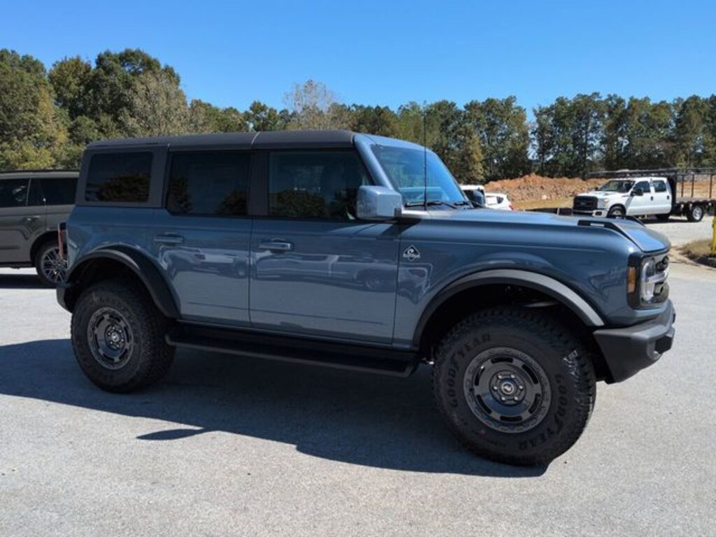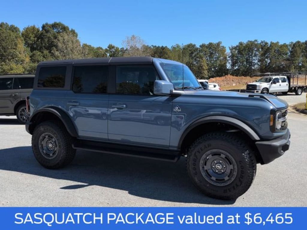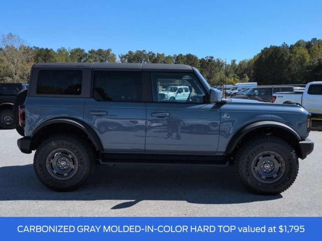 2025 Azure Gray Metallic 2025 Ford Bronco Outer Banks Outer Banks 4D Sport Utility 4WD 2.3L EcoBoost I-4 Equipment Group 312A Mid Package, Sasquatch Package (High Clearance Fender Flares, High Clearance Suspension, Position-Sensitive Bilstein Shock Absorbers, and Wheels: 17" Carbonized Gray Painted Aluminum), 18" Bright Machined Aluminum Wheels, 4-Wheel Disc Brakes, 7 Speakers, ABS brakes, Air Conditioning, Alloy wheels, AM/FM radio: SiriusXM with 360L, AM/FM Stereo, Auto High-beam Headlights, Auto-dimming Rear-View mirror, Automatic temperature control, Brake assist, Carbonized Gray Molded-In-Color Hard Top, Compass, Connected Navigation, Delay-off headlights, Driver door bin, Driver vanity mirror, Dual front impact airbags, Dual front side impact airbags, Electronic Stability Control, Emergency communication system: 911 Assist, Exterior Parking Camera Rear, Front anti-roll bar, Front Bucket Seats, Front Center Armrest, Front dual zone A/C, Front fog lights, Front reading lights, Front wheel independent suspension, Fully automatic headlights, Hard Top Sound Deadening Headliner, Heated door mirrors, Heated front seats, Heated Leather-Trimmed/Vinyl Bucket Seats, Heated steering wheel, Illuminated entry, Integrated roll-over protection, Leather Shift Knob, Low tire pressure warning, Navigation system: Connected Navigation, Occupant sensing airbag, Outside temperature display, Overhead airbag, Overhead console, Panic alarm, Passenger door bin, Passenger vanity mirror, Power door mirrors, Power driver seat, Power passenger seat, Power steering, Power windows, Radio data system, Rear seat center armrest, Rear-Window Defroster & Washer, Remote keyless entry, Security system, SiriusXM w/360L, Speed control, Split folding rear seat, Steering wheel mounted audio controls, SYNC 4, Tachometer, Telescoping steering wheel, Tilt steering wheel, Traction control, Trip computer, Variably intermittent wipers, and Voltmeter.
