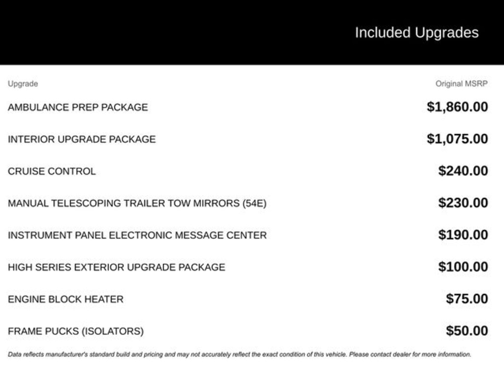 2025 Oxford White 2025 Ford E-350SD Base Cutaway RWD 7.3L V8 Preferred Equipment Package, 7.3L V8, 6-Speed Automatic with Overdrive, RWD, 240 Amp Alternator, 4.10 Axle Ratio w/Limited-Slip, Ambulance Prep Package, Auxiliary Fuel Port, Auxiliary Heater/AC Connector Package, Chrome Grille, Dual 78 Amp-Hour Batteries, Front Chrome Bumper, High Series Exterior Upgrade Package, High-Series Door-Trim Panels, Insulation Package, Interior Upgrade Package, License Plate Bracket, Manual Telescoping Trailer Tow Mirrors, Order Code 780A. Ambulance Prep Package (240 Amp Alternator, Auxiliary Fuel Port, Dual 78 Amp-Hour Batteries, License Plate Bracket, and Manual Telescoping Trailer Tow Mirrors), Auxiliary Heater/AC Connector Package, High Series Exterior Upgrade Package (Chrome Grille and Front Chrome Bumper), Insulation Package, Interior Upgrade Package (High-Series Door-Trim Panels), Order Code 780A, 7.3L V8, 6-Speed Automatic with Overdrive, RWD, 4.10 Axle Ratio w/Limited-Slip, 2 Speakers, 4-Wheel Disc Brakes, ABS brakes, Air Conditioning, AM/FM radio, Cloth Bucket Seats, Cloth Captain's Chairs, Cruise Control, Driver door bin, Driver's Seat Mounted Armrest, Dual front impact airbags, Dual High Back Buckets, Electronic Stability Control, Engine Block Heater, Frame Pucks (Isolators), Front anti-roll bar, Front Bucket Seats, Front wheel independent suspension, Fully automatic headlights, Instrument Panel Electronic Message Center, Passenger door bin, Passenger seat mounted armrest, Power steering, Radio: AM/FM Stereo w/Clock Display & 2 Speakers, Remote Keyless Entry, Tachometer, Telescoping steering wheel, Tilt steering wheel, Traction control, Variably intermittent wipers, Vinyl Bucket Seats, Vinyl Floor Covering, and Voltmeter.
