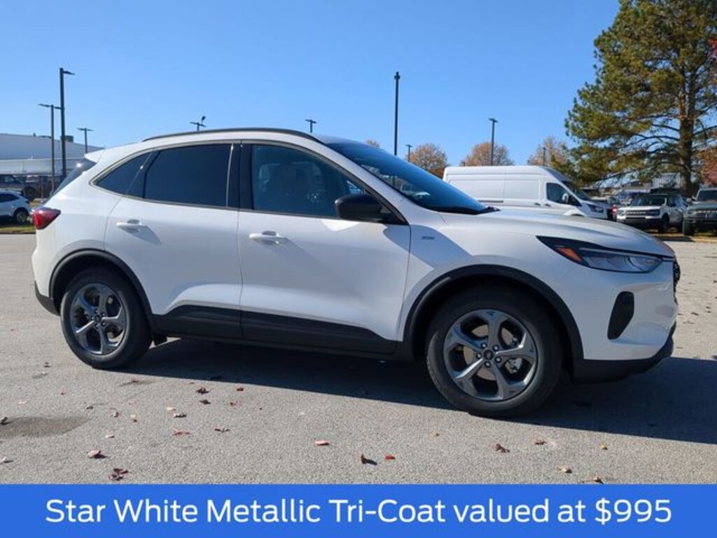 2025 Star White Metallic Tri-Coat 2025 Ford Escape ST-Line ST-Line 4D Sport Utility FWD 1.5L EcoBoost 13.2" LCD Centerstack Touchscreen, Adaptive Cruise Control, Auto LED Headlights, Backup Camera, Blind Spot Monitoring, BLIS w/ Cross Traffic Alert, Evasive Steering Assist, Lane Keeping System, Parking Sensors, Push Button Start, 4D Sport Utility, 1.5L EcoBoost, 8-Speed Automatic. Equipment Group 300A, Tech Pack #1 (Adaptive Cruise Control w/Stop-and-Go, Connected Navigation, Ford Co-Pilot360 Assist+, Intersection Assist, Predictive Speed Assist, Rear Parking Sensor, Rear-View Camera, and SYNC 4 w/Enhanced Voice Recognition), 4D Sport Utility, 1.5L EcoBoost, 8-Speed Automatic, 3.81 Axle Ratio, 4-Wheel Disc Brakes, 6 Speakers, ABS brakes, Air Conditioning, Alloy wheels, AM/FM radio: SiriusXM, AM/FM Stereo, Auto High-beam Headlights, Automatic temperature control, Brake assist, Bumpers: body-color, Compass, Delay-off headlights, Driver door bin, Driver vanity mirror, Dual front impact airbags, Dual front side impact airbags, Electronic Stability Control, Emergency communication system: SYNC 4 911 Assist, FordPass Connect, Four wheel independent suspension, Front anti-roll bar, Front Bucket Seats, Front Center Armrest, Front dual zone A/C, Front reading lights, Fully automatic headlights, Illuminated entry, Knee airbag, Low tire pressure warning, Occupant sensing airbag, Outside temperature display, Overhead airbag, Overhead console, Panic alarm, Passenger door bin, Passenger vanity mirror, Power door mirrors, Power driver seat, Power Liftgate, Power steering, Power windows, Radio data system, Rear anti-roll bar, Rear reading lights, Rear seat center armrest, Rear window defroster, Rear window wiper, Remote keyless entry, Speed control, Speed-sensing steering, Speed-Sensitive Wipers, Split folding rear seat, Spoiler, Sport steering wheel, Steering wheel mounted audio controls, SYNC 4, Tachometer, Telescoping steering wheel, Tilt steering wheel, Traction control, Trip computer, Variably intermittent wipers, Vinyl/Cloth Front Sport Contour Bucket Seats, and Wheels: 18" Rock Metallic Painted Aluminum.