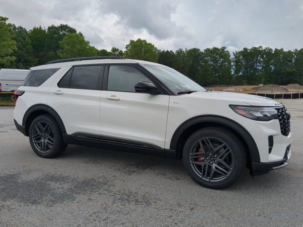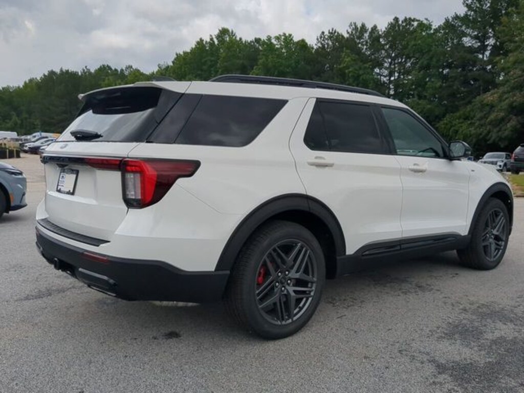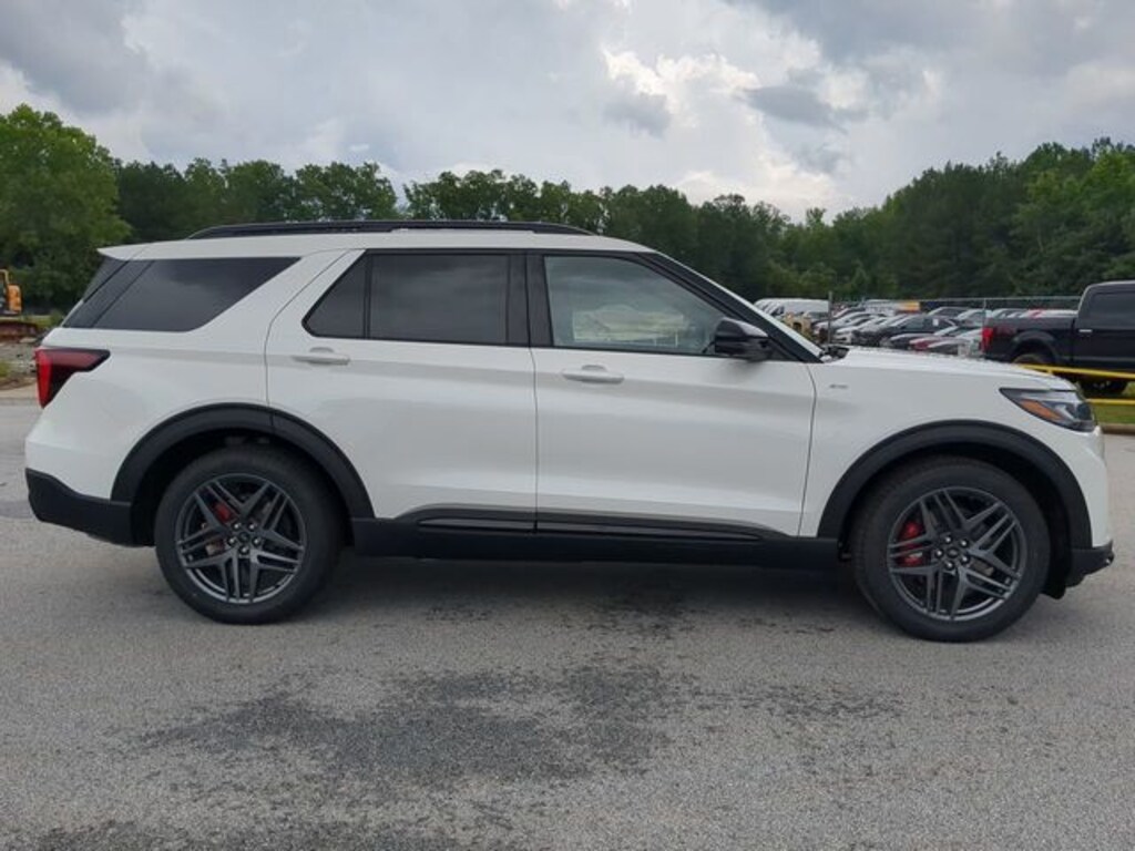 2025 Star White Metallic Tri-Coat 2025 Ford Explorer ST-Line ST-Line 4D Sport Utility RWD 2.3L EcoBoost I-4 12.4" LCD Digital Driver Cluster, 13.2" LCD Centerstack Touchscreen, Android Auto, Apple Carplay, Auto LED Headlights, Backup Camera, Bluetooth w/ Audio Streaming, Hill Start Assist, Intersection Assist, Premium Sound Package, Side-Wind Stabilization, Sport Package, Tow Package, Trailer Package, Wireless Charging Pad, 4D Sport Utility, 2.3L EcoBoost I-4, 10-Speed Automatic, RWD, 110V/150W AC Power Outlet, 2nd Row Heated Seats, Ambient Lighting, Auto-Dimming Interior Rear-View Mirror, Equipment Group 300A Standard Package, Navigation System, Performance Brakes, Power-Folding Sideview Mirrors w/Autofold, Premium Package, Radio: B&O Sound System by Bang & Olufsen, Rain-Sensing Wipers (Front Only), Red Painted Perf Front & Rear Brake Calipers, ST-Line Street Pack, Wheels: 21" Magnetite-Painted Aluminum, Wireless Charging Pad. Equipment Group 300A Standard Package, Premium Package (110V/150W AC Power Outlet, 2nd Row Heated Seats, Ambient Lighting, Auto-Dimming Interior Rear-View Mirror, Power-Folding Sideview Mirrors w/Autofold, Rain-Sensing Wipers (Front Only), and Wireless Charging Pad), ST-Line Street Pack (Performance Brakes, Red Painted Perf Front & Rear Brake Calipers, and Wheels: 21" Magnetite-Painted Aluminum), 4D Sport Utility, 2.3L EcoBoost I-4, 10-Speed Automatic, RWD, Navigation System, Radio: B&O Sound System by Bang & Olufsen, 10 Speakers, 2nd Row Captain's Chairs w/E-Z Entry & Armrest, 3.58 Non-Limited Slip Rear Axle, 3rd row seats: bench, 4-Wheel Disc Brakes, ABS brakes, Air Conditioning, Alloy wheels, Apple CarPlay/Android Auto, Auto High-beam Headlights, Automatic temperature control, Brake assist, Bumpers: body-color, Compass, Delay-off headlights, Driver door bin, Driver vanity mirror, Dual front impact airbags, Dual front side impact airbags, Electronic Stability Control, Emergency communication system: 911 Assist, Exterior Parking Camera Rear, Ford BlueCruise Equipped (1-Year Plan), Four wheel independent suspension, Front anti-roll bar, Front Bucket Seats, Front Center Armrest, Front dual zone A/C, Front fog lights, Front reading lights, Fully automatic headlights, Garage door transmitter, Heated door mirrors, Heated front seats, Heated steering wheel, Heated Unique Cloth Captain's Chairs, Illuminated entry, Knee airbag, Leather steering wheel, Low tire pressure warning, Occupant sensing airbag, Outside temperature display, Overhead airbag, Overhead console, Panic alarm, Passenger door bin, Passenger vanity mirror, Power door mirrors, Power driver seat, Power Liftgate, Power passenger seat, Power steering, Power windows, Rear air conditioning, Rear anti-roll bar, Rear reading lights, Rear window defroster, Rear window wiper, Remote keyless entry, Security system, Speed control, Speed-sensing steering, Speed-Sensitive Wipers, Split folding rear seat, Spoiler, Steering wheel mounted audio controls, Tachometer, Telescoping steering wheel, Tilt steering wheel, Traction control, Trip computer, Variably intermittent wipers, and Wheels: 20" Ebony-Painted Machined Aluminum.