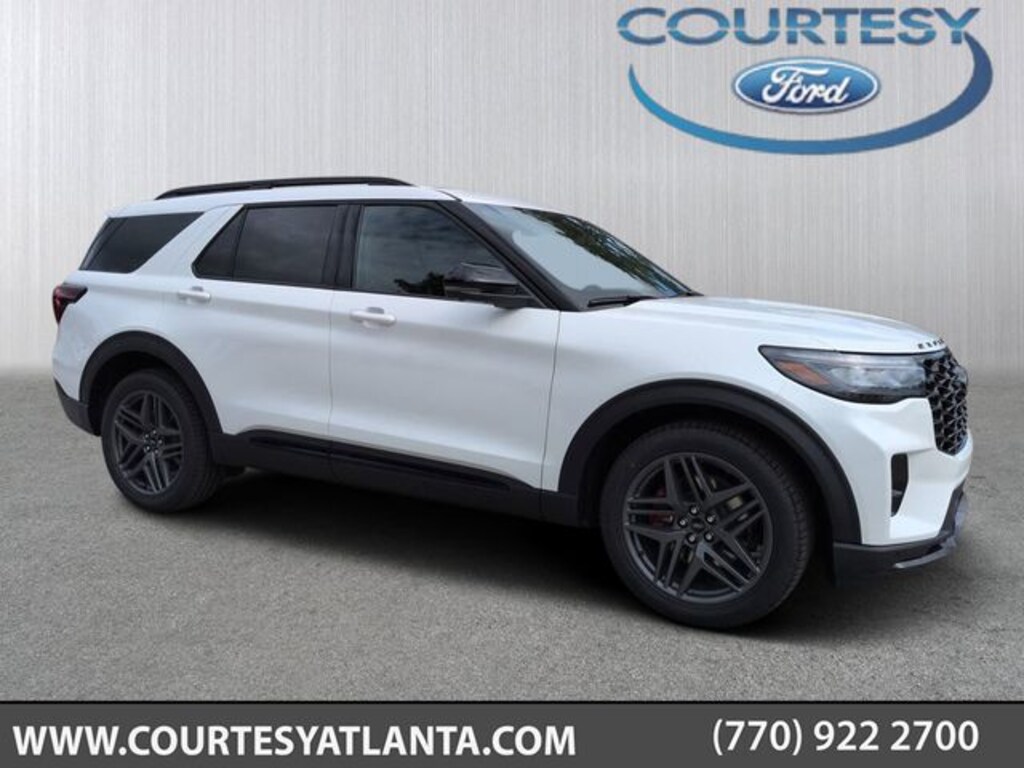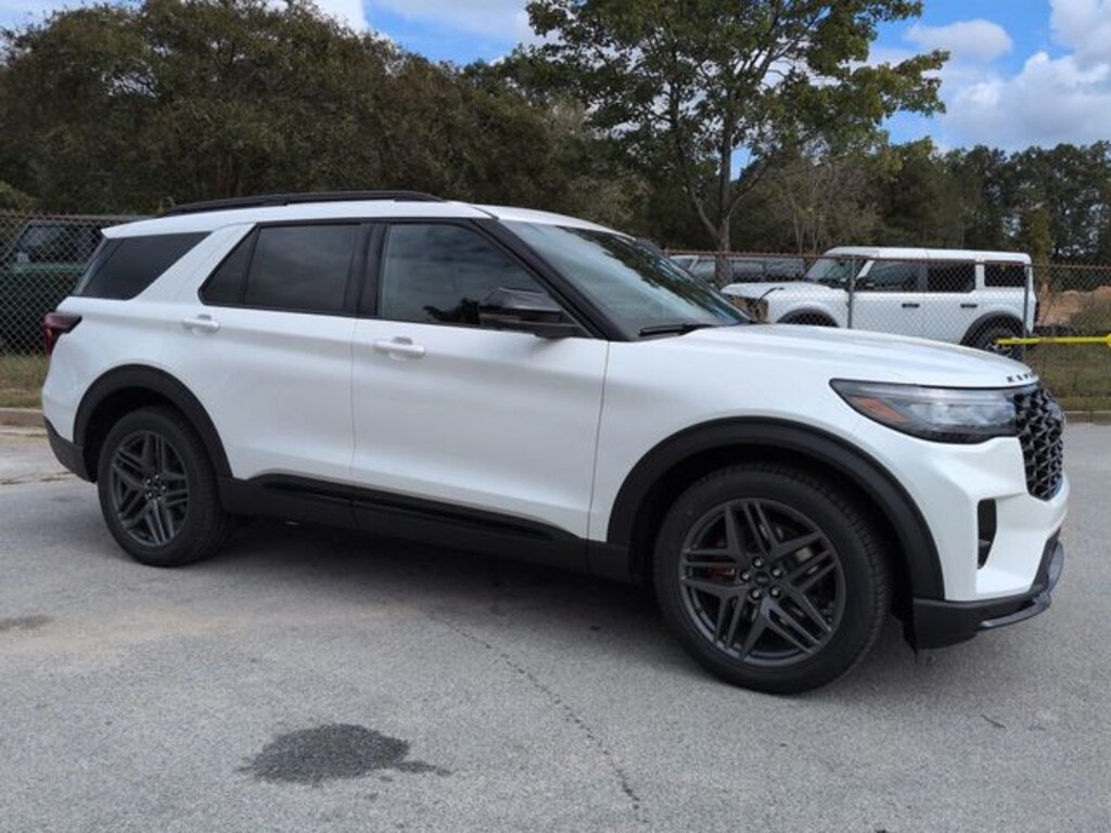 2025 Star White Metallic Tri-Coat 2025 Ford Explorer ST ST 4D Sport Utility 4WD 3.0L EcoBoost V6 4D Sport Utility, 3.0L EcoBoost V6, 10-Speed Automatic, 4WD, 12.3" HD Color Driver Cluster, 13.2" LCD Centerstack Touchscreen, Android Auto, Apple Carplay, Auto LED Headlights, B&O Sound System by Bang & Olufsen, Backup Camera, Bluetooth w/ Audio Streaming, Equipment Group 400A Standard Package, Intersection Assist, LED Foglights, Multicontour Seats w/Front Active Motion, Navigation System, Panoramic Sunroof/Moonroof, Panoramic Vista Roof w/Power Shade, Power Mirror Package, Power Package, Skid Plate Package, Sport Package, Sun and Sound Package, Tow Package, Trailer Package. Equipment Group 400A Standard Package, Sun and Sound Package (B&O Sound System by Bang & Olufsen, Multicontour Seats w/Front Active Motion, and Panoramic Vista Roof w/Power Shade), 4D Sport Utility, 3.0L EcoBoost V6, 10-Speed Automatic, 4WD, 12.3" HD Color Driver Cluster, 13.2" LCD Centerstack Touchscreen, Android Auto, Apple Carplay, Auto LED Headlights, Backup Camera, Bluetooth w/ Audio Streaming, Intersection Assist, LED Foglights, Navigation System, Panoramic Sunroof/Moonroof, Power Mirror Package, Power Package, Skid Plate Package, Sport Package, Tow Package, Trailer Package, 10 Speakers, 3.58 Non-Limited Slip Rear Axle, 3rd row seats: bench, 4-Wheel Disc Brakes, ABS brakes, Air Conditioning, Alloy wheels, AM/FM radio: SiriusXM with 360L, Apple CarPlay/Android Auto, Auto High-beam Headlights, Auto-dimming door mirrors, Auto-dimming Rear-View mirror, Automatic temperature control, Brake assist, Bumpers: body-color, Compass, Delay-off headlights, Driver door bin, Driver vanity mirror, Dual front impact airbags, Dual front side impact airbags, Electronic Stability Control, Emergency communication system: 911 Assist, Exterior Parking Camera Rear, Four wheel independent suspension, Front anti-roll bar, Front Bucket Seats, Front Center Armrest, Front dual zone A/C, Front fog lights, Front reading lights, Fully automatic headlights, Garage door transmitter, Heated door mirrors, Heated front seats, Heated rear seats, Heated steering wheel, Heated/Ventilated Miko Sport Captain's Chairs, Illuminated entry, Knee airbag, Leather steering wheel, Low tire pressure warning, Memory seat, Occupant sensing airbag, Outside temperature display, Overhead airbag, Overhead console, Panic alarm, Passenger door bin, Passenger vanity mirror, Power door mirrors, Power driver seat, Power Liftgate, Power passenger seat, Power steering, Power windows, Radio: B&O Sound System by Bang & Olufsen, Rain sensing wipers, Rear air conditioning, Rear anti-roll bar, Rear reading lights, Rear window defroster, Rear window wiper, Remote keyless entry, Security system, Speed control, Speed-sensing steering, Speed-Sensitive Wipers, Split folding rear seat, Spoiler, Sport steering wheel, Steering wheel mounted audio controls, Tachometer, Telescoping steering wheel, Tilt steering wheel, Traction control, Trip computer, Turn signal indicator mirrors, Ventilated front seats, and Wheels: 21" Magnetite-Painted Aluminum.