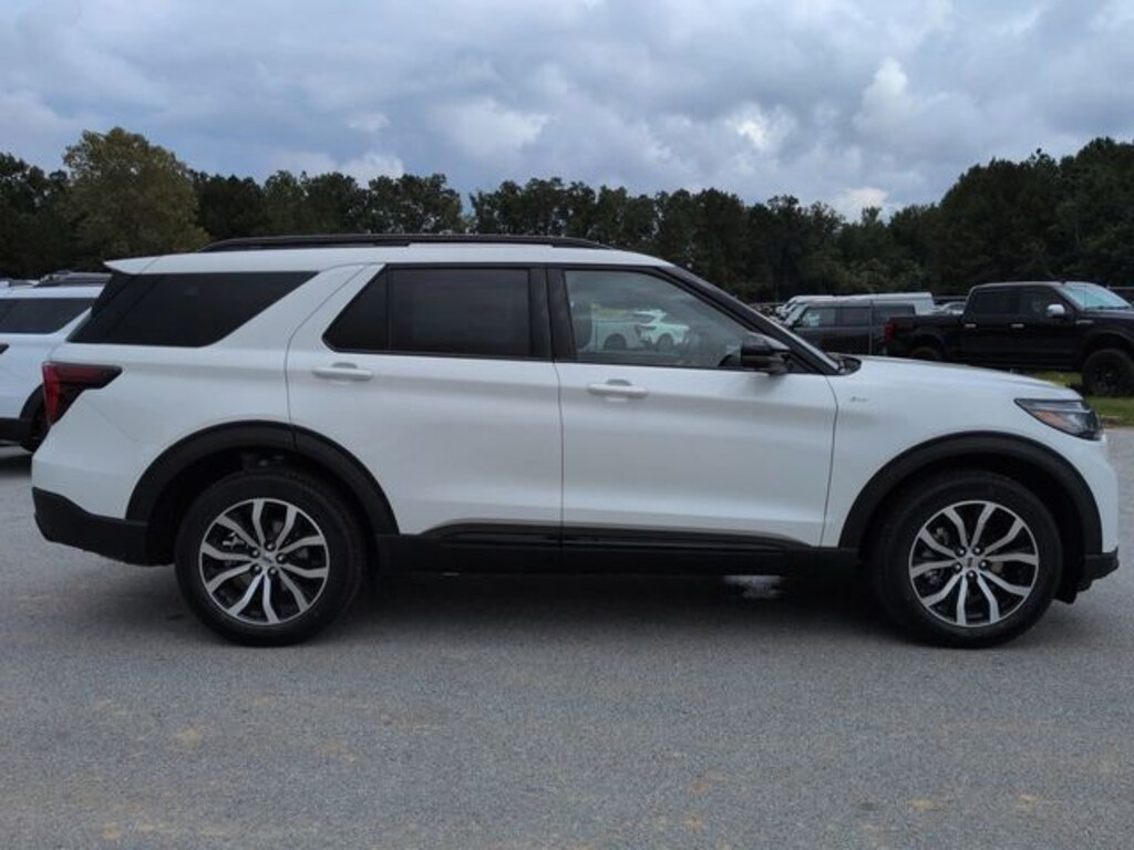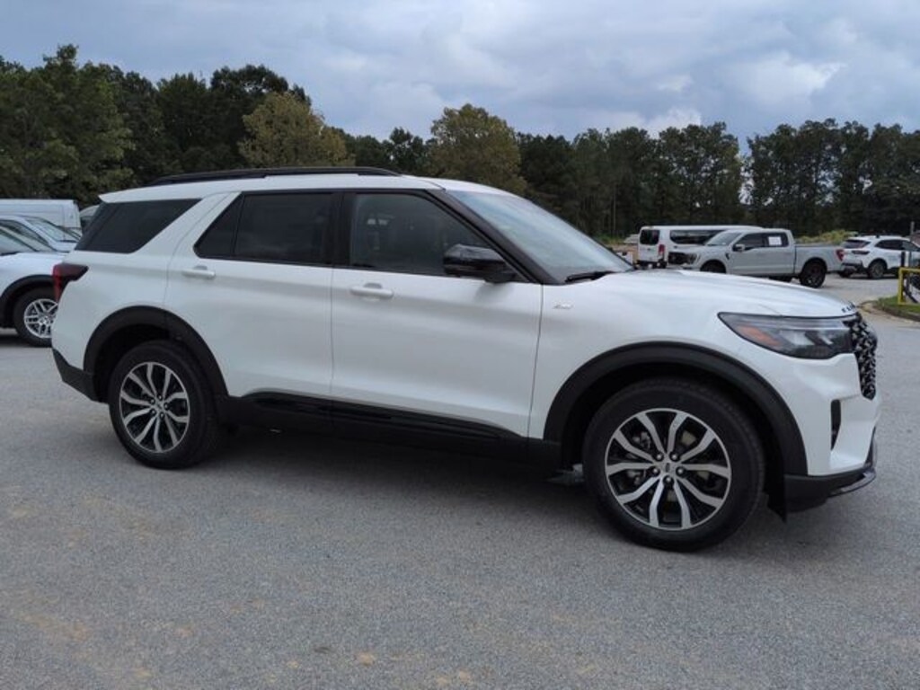 2025 Star White Metallic Tri-Coat 2025 Ford Explorer ST-Line ST-Line 4D Sport Utility 4WD 2.3L EcoBoost I-4 4D Sport Utility, 2.3L EcoBoost I-4, 10-Speed Automatic, 4WD, 12.3" HD Color Driver Cluster, 13.2" LCD Centerstack Touchscreen, 3rd Row Seating, Android Auto, Apple Carplay, Auto LED Headlights, Backup Camera, Bluetooth w/ Audio Streaming, Equipment Group 300A Standard Package, Hill Start Assist, Intersection Assist, Multi Zone Climate Control, Navigation System, Panoramic Sunroof/Moonroof, Power Mirror Package, Power Package, Side-Wind Stabilization, Tow Package, Trailer Package. Equipment Group 300A Standard Package, 4D Sport Utility, 2.3L EcoBoost I-4, 10-Speed Automatic, 4WD, 12.3" HD Color Driver Cluster, 13.2" LCD Centerstack Touchscreen, 3rd Row Seating, Android Auto, Apple Carplay, Auto LED Headlights, Backup Camera, Bluetooth w/ Audio Streaming, Hill Start Assist, Intersection Assist, Multi Zone Climate Control, Navigation System, Panoramic Sunroof/Moonroof, Power Mirror Package, Power Package, Side-Wind Stabilization, Tow Package, Trailer Package, 10 Speakers, 2nd Row Captain's Chairs w/E-Z Entry & Armrest, 3.58 Non-Limited Slip Rear Axle, 3rd row seats: bench, 4-Wheel Disc Brakes, ABS brakes, Air Conditioning, Alloy wheels, Apple CarPlay/Android Auto, Auto High-beam Headlights, Automatic temperature control, Brake assist, Bumpers: body-color, Compass, Delay-off headlights, Driver door bin, Driver vanity mirror, Dual front impact airbags, Dual front side impact airbags, Electronic Stability Control, Emergency communication system: 911 Assist, Exterior Parking Camera Rear, Four wheel independent suspension, Front anti-roll bar, Front Bucket Seats, Front Center Armrest, Front dual zone A/C, Front fog lights, Front reading lights, Fully automatic headlights, Garage door transmitter, Heated door mirrors, Heated front seats, Heated steering wheel, Heated Unique Cloth Captain's Chairs, Illuminated entry, Knee airbag, Leather steering wheel, Low tire pressure warning, Occupant sensing airbag, Outside temperature display, Overhead airbag, Overhead console, Panic alarm, Panoramic Vista Roof w/Power Shade, Passenger door bin, Passenger vanity mirror, Power door mirrors, Power driver seat, Power Liftgate, Power passenger seat, Power steering, Power windows, Radio: B&O Sound System by Bang & Olufsen, Rear air conditioning, Rear anti-roll bar, Rear reading lights, Rear window defroster, Rear window wiper, Remote keyless entry, Security system, Speed control, Speed-sensing steering, Speed-Sensitive Wipers, Split folding rear seat, Spoiler, Steering wheel mounted audio controls, Tachometer, Telescoping steering wheel, Tilt steering wheel, Traction control, Trip computer, Variably intermittent wipers, and Wheels: 20" Ebony-Painted Machined Aluminum.
