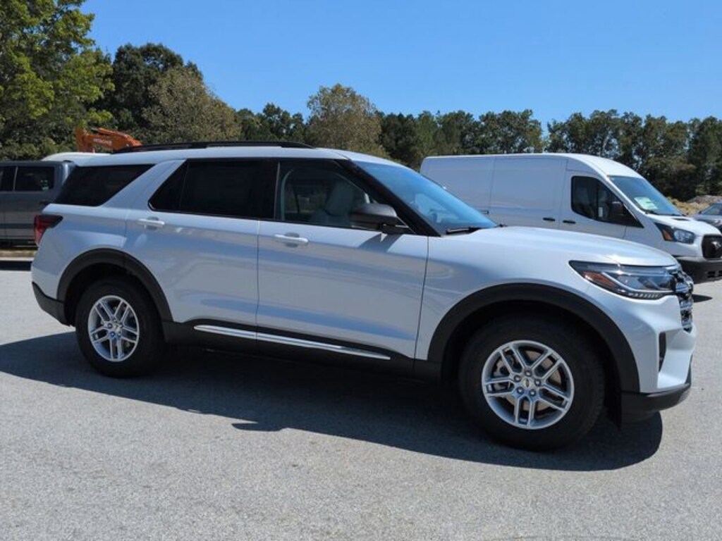 2025 Space White Metallic 2025 Ford Explorer Active Active 4D Sport Utility RWD 2.3L EcoBoost I-4 4D Sport Utility, 2.3L EcoBoost I-4, 10-Speed Automatic, RWD, 12.3" HD Color Driver Cluster, 13.2" LCD Centerstack Touchscreen, 3rd Row Seating, Active Comfort Package, Auto LED Headlights, Backup Camera, Equipment Group 200A Standard Package, Front Fascia, Heated ActiveX Seating Material Captain's Chairs, Heated Steering Wheel, Hill Start Assist, Intersection Assist, Multi Zone Climate Control, Navigation System, Remote Start System, Second Row HVAC Controls, Side-Wind Stabilization, Tow Package, Trailer Package, Universal Garage Door Opener (UGDO). Active Comfort Package (Front Fascia, Heated ActiveX Seating Material Captain's Chairs, Heated Steering Wheel, Remote Start System, Second Row HVAC Controls, and Universal Garage Door Opener (UGDO)), Equipment Group 200A Standard Package, Smoker's Package, 4D Sport Utility, 2.3L EcoBoost I-4, 10-Speed Automatic, RWD, 12.3" HD Color Driver Cluster, 13.2" LCD Centerstack Touchscreen, 3rd Row Seating, Auto LED Headlights, Backup Camera, Hill Start Assist, Intersection Assist, Multi Zone Climate Control, Navigation System, Side-Wind Stabilization, Tow Package, Trailer Package, 3.58 Non-Limited Slip Rear Axle, 3rd row seats: bench, 4-Wheel Disc Brakes, 6 Speakers, ABS brakes, Air Conditioning, Alloy wheels, AM/FM Stereo, Apple CarPlay/Android Auto, Auto High-beam Headlights, Automatic temperature control, Brake assist, Bumpers: body-color, Compass, Delay-off headlights, Driver door bin, Driver vanity mirror, Dual front impact airbags, Dual front side impact airbags, Electronic Stability Control, Emergency communication system: 911 Assist, Exterior Parking Camera Rear, Four wheel independent suspension, Front anti-roll bar, Front Bucket Seats, Front Center Armrest, Front dual zone A/C, Front reading lights, Fully automatic headlights, Heated door mirrors, Heated front seats, Illuminated entry, Knee airbag, Leather steering wheel, Low tire pressure warning, Occupant sensing airbag, Outside temperature display, Overhead airbag, Overhead console, Panic alarm, Passenger door bin, Passenger vanity mirror, Power door mirrors, Power driver seat, Power Liftgate, Power passenger seat, Power steering, Power windows, Rear air conditioning, Rear anti-roll bar, Rear reading lights, Rear window defroster, Rear window wiper, Remote keyless entry, Speed control, Speed-sensing steering, Speed-Sensitive Wipers, Split folding rear seat, Spoiler, Steering wheel mounted audio controls, Tachometer, Telescoping steering wheel, Tilt steering wheel, Traction control, Trip computer, Unique Heated Cloth Captain's Chairs, Variably intermittent wipers, and Wheels: 18" Sparkle Silver-Painted Aluminum.