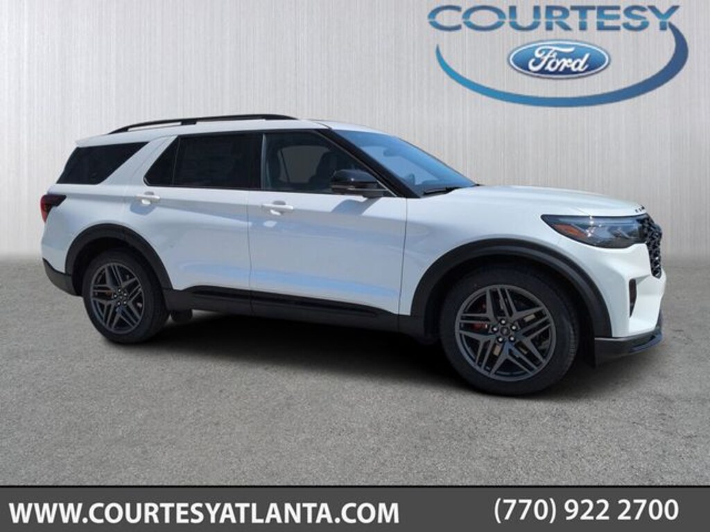 2025 Star White Metallic Tri-Coat 2025 Ford Explorer ST ST 4D Sport Utility 4WD 3.0L EcoBoost V6 4D Sport Utility, 3.0L EcoBoost V6, 10-Speed Automatic, 4WD, 12.3" HD Color Driver Cluster, 13.2" LCD Centerstack Touchscreen, 3rd Row Seating, Android Auto, Apple Carplay, Auto LED Headlights, B&O Sound System by Bang & Olufsen, Backup Camera, Bluetooth w/ Audio Streaming, Equipment Group 400A Standard Package, Multi Zone Climate Control, Multicontour Seats w/Front Active Motion, Navigation System, Panoramic Sunroof/Moonroof, Panoramic Vista Roof w/Power Shade, Premium Sound Package, Sport Package, Sun and Sound Package, Suspension Package. Equipment Group 400A Standard Package, Sun and Sound Package (B&O Sound System by Bang & Olufsen, Multicontour Seats w/Front Active Motion, and Panoramic Vista Roof w/Power Shade), 4D Sport Utility, 3.0L EcoBoost V6, 10-Speed Automatic, 4WD, 12.3" HD Color Driver Cluster, 13.2" LCD Centerstack Touchscreen, 3rd Row Seating, Android Auto, Apple Carplay, Auto LED Headlights, Backup Camera, Bluetooth w/ Audio Streaming, Multi Zone Climate Control, Navigation System, Panoramic Sunroof/Moonroof, Premium Sound Package, Sport Package, Suspension Package, 10 Speakers, 3.58 Non-Limited Slip Rear Axle, 3rd row seats: bench, 4-Wheel Disc Brakes, ABS brakes, Air Conditioning, Alloy wheels, Apple CarPlay/Android Auto, Auto High-beam Headlights, Auto-dimming door mirrors, Auto-dimming Rear-View mirror, Automatic temperature control, Brake assist, Bumpers: body-color, Compass, Delay-off headlights, Driver door bin, Driver vanity mirror, Dual front impact airbags, Dual front side impact airbags, Electronic Stability Control, Emergency communication system: 911 Assist, Exterior Parking Camera Rear, Four wheel independent suspension, Front anti-roll bar, Front Bucket Seats, Front Center Armrest, Front dual zone A/C, Front fog lights, Front reading lights, Fully automatic headlights, Garage door transmitter, Heated door mirrors, Heated front seats, Heated rear seats, Heated steering wheel, Heated/Ventilated Miko Sport Captain's Chairs, Illuminated entry, Knee airbag, Leather steering wheel, Low tire pressure warning, Memory seat, Occupant sensing airbag, Outside temperature display, Overhead airbag, Overhead console, Panic alarm, Passenger door bin, Passenger vanity mirror, Power door mirrors, Power driver seat, Power Liftgate, Power passenger seat, Power steering, Power windows, Radio: B&O Sound System by Bang & Olufsen, Rain sensing wipers, Rear air conditioning, Rear anti-roll bar, Rear reading lights, Rear window defroster, Rear window wiper, Remote keyless entry, Security system, Speed control, Speed-sensing steering, Speed-Sensitive Wipers, Split folding rear seat, Spoiler, Sport steering wheel, Steering wheel mounted audio controls, Tachometer, Telescoping steering wheel, Tilt steering wheel, Traction control, Trip computer, Turn signal indicator mirrors, Ventilated front seats, and Wheels: 21" Magnetite-Painted Aluminum.