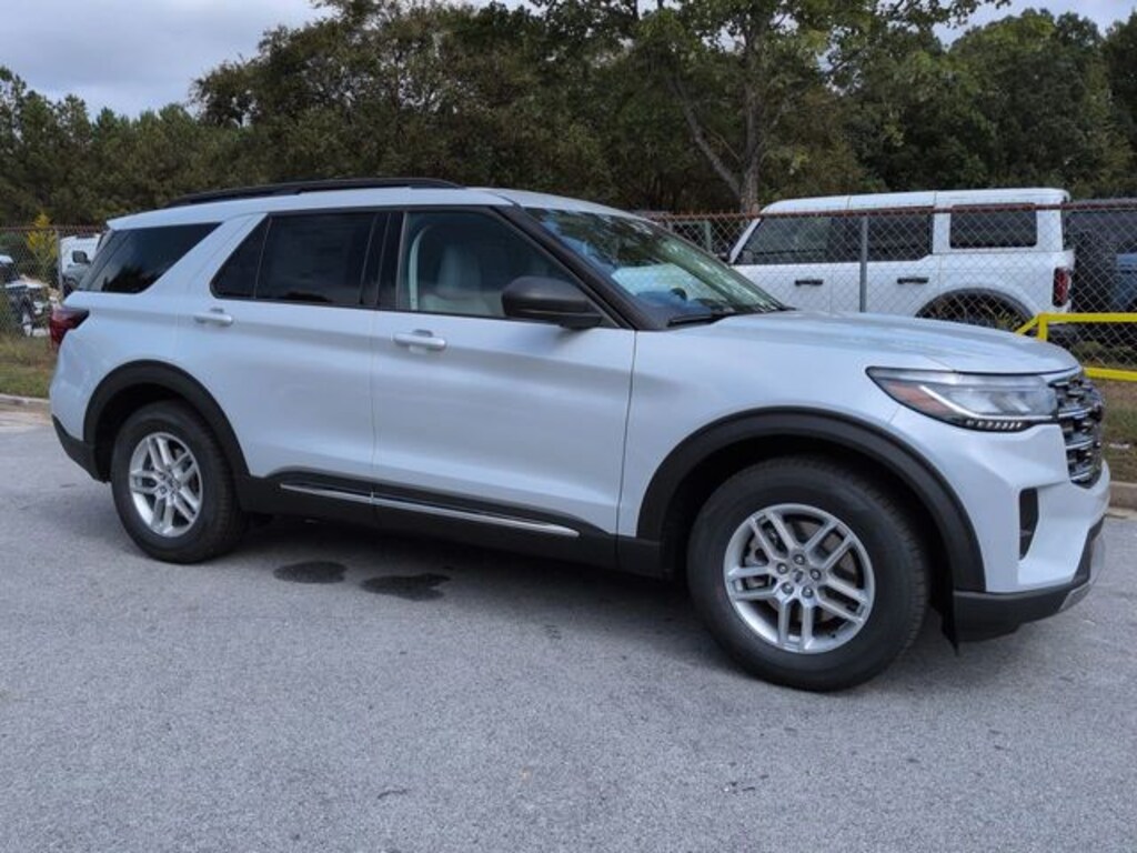 2025 Space White Metallic 2025 Ford Explorer Active Active 4D Sport Utility RWD 2.3L EcoBoost I-4 4D Sport Utility, 2.3L EcoBoost I-4, 10-Speed Automatic, RWD, 12.3" HD Color Driver Cluster, 13.2" LCD Centerstack Touchscreen, 3rd Row Seating, Active Comfort Package, Android Auto, Apple Carplay, Auto LED Headlights, Backup Camera, Bluetooth w/ Audio Streaming, Cold Weather Package, Equipment Group 200A Standard Package, Front Fascia, Heated ActiveX Seating Material Captain's Chairs, Heated Steering Wheel, Hill Start Assist, Intersection Assist, Multi Zone Climate Control, Navigation System, Push Button Start, Remote Start, Remote Start System, Second Row HVAC Controls, Side-Wind Stabilization, Tow Package, Trailer Package, Universal Garage Door Opener (UGDO). Active Comfort Package (Front Fascia, Heated ActiveX Seating Material Captain's Chairs, Heated Steering Wheel, Remote Start System, Second Row HVAC Controls, and Universal Garage Door Opener (UGDO)), Equipment Group 200A Standard Package, 4D Sport Utility, 2.3L EcoBoost I-4, 10-Speed Automatic, RWD, 12.3" HD Color Driver Cluster, 13.2" LCD Centerstack Touchscreen, 3rd Row Seating, Android Auto, Apple Carplay, Auto LED Headlights, Backup Camera, Bluetooth w/ Audio Streaming, Cold Weather Package, Hill Start Assist, Intersection Assist, Multi Zone Climate Control, Navigation System, Push Button Start, Remote Start, Side-Wind Stabilization, Tow Package, Trailer Package, 3.58 Non-Limited Slip Rear Axle, 3rd row seats: bench, 4-Wheel Disc Brakes, 6 Speakers, ABS brakes, Air Conditioning, Alloy wheels, AM/FM Stereo, Apple CarPlay/Android Auto, Auto High-beam Headlights, Automatic temperature control, Brake assist, Bumpers: body-color, Compass, Delay-off headlights, Driver door bin, Driver vanity mirror, Dual front impact airbags, Dual front side impact airbags, Electronic Stability Control, Emergency communication system: 911 Assist, Exterior Parking Camera Rear, Four wheel independent suspension, Front anti-roll bar, Front Bucket Seats, Front Center Armrest, Front dual zone A/C, Front reading lights, Fully automatic headlights, Heated door mirrors, Heated front seats, Illuminated entry, Knee airbag, Leather steering wheel, Low tire pressure warning, Occupant sensing airbag, Outside temperature display, Overhead airbag, Overhead console, Panic alarm, Passenger door bin, Passenger vanity mirror, Power door mirrors, Power driver seat, Power Liftgate, Power passenger seat, Power steering, Power windows, Rear air conditioning, Rear anti-roll bar, Rear reading lights, Rear window defroster, Rear window wiper, Remote keyless entry, Speed control, Speed-sensing steering, Speed-Sensitive Wipers, Split folding rear seat, Spoiler, Steering wheel mounted audio controls, Tachometer, Telescoping steering wheel, Tilt steering wheel, Traction control, Trip computer, Unique Heated Cloth Captain's Chairs, and Wheels: 18" Sparkle Silver-Painted Aluminum.