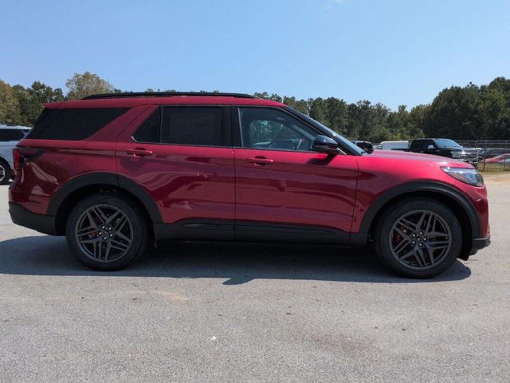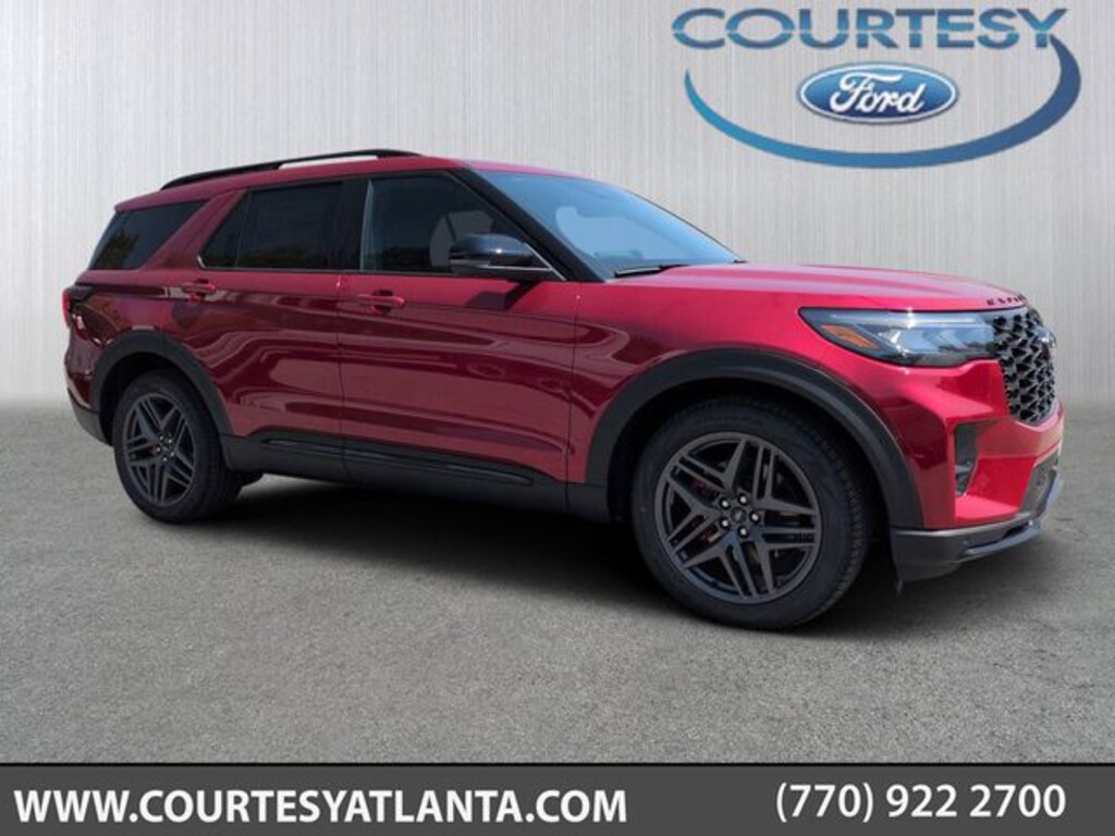 2025 Rapid Red Metallic Tinted Clearcoat 2025 Ford Explorer ST ST 4D Sport Utility 4WD 3.0L EcoBoost V6 4D Sport Utility, 3.0L EcoBoost V6, 10-Speed Automatic, 4WD, 12.4" LCD Digital Driver Cluster, 13.2" LCD Centerstack Touchscreen, Android Auto, Apple Carplay, Auto LED Headlights, B&O Sound System by Bang & Olufsen, Backup Camera, Bluetooth w/ Audio Streaming, Equipment Group 400A Standard Package, Intersection Assist, Multicontour Seats w/Front Active Motion, Navigation System, Panoramic Vista Roof w/Power Shade, Push Button Start, Remote Start, Sun and Sound Package, Tow Package, Trailer Package. Equipment Group 400A Standard Package, Sun and Sound Package (B&O Sound System by Bang & Olufsen, Multicontour Seats w/Front Active Motion, and Panoramic Vista Roof w/Power Shade), 4D Sport Utility, 3.0L EcoBoost V6, 10-Speed Automatic, 4WD, 12.4" LCD Digital Driver Cluster, 13.2" LCD Centerstack Touchscreen, Android Auto, Apple Carplay, Auto LED Headlights, Backup Camera, Bluetooth w/ Audio Streaming, Intersection Assist, Navigation System, Push Button Start, Remote Start, Tow Package, Trailer Package, 10 Speakers, 3.58 Non-Limited Slip Rear Axle, 3rd row seats: bench, 4-Wheel Disc Brakes, ABS brakes, Air Conditioning, Alloy wheels, AM/FM radio: SiriusXM with 360L, Apple CarPlay/Android Auto, Auto High-beam Headlights, Auto-dimming door mirrors, Auto-dimming Rear-View mirror, Automatic temperature control, Brake assist, Bumpers: body-color, Compass, Delay-off headlights, Driver door bin, Driver vanity mirror, Dual front impact airbags, Dual front side impact airbags, Electronic Stability Control, Emergency communication system: 911 Assist, Exterior Parking Camera Rear, Four wheel independent suspension, Front anti-roll bar, Front Bucket Seats, Front Center Armrest, Front dual zone A/C, Front fog lights, Front reading lights, Fully automatic headlights, Garage door transmitter, Heated door mirrors, Heated front seats, Heated rear seats, Heated steering wheel, Heated/Ventilated Miko Sport Captain's Chairs, Illuminated entry, Knee airbag, Leather steering wheel, Low tire pressure warning, Memory seat, Occupant sensing airbag, Outside temperature display, Overhead airbag, Overhead console, Panic alarm, Passenger door bin, Passenger vanity mirror, Power door mirrors, Power driver seat, Power Liftgate, Power passenger seat, Power steering, Power windows, Radio: B&O Sound System by Bang & Olufsen, Rain sensing wipers, Rear air conditioning, Rear anti-roll bar, Rear reading lights, Rear window defroster, Rear window wiper, Remote keyless entry, Security system, Speed control, Speed-sensing steering, Speed-Sensitive Wipers, Split folding rear seat, Spoiler, Sport steering wheel, Steering wheel mounted audio controls, Tachometer, Telescoping steering wheel, Tilt steering wheel, Traction control, Trip computer, Turn signal indicator mirrors, Ventilated front seats, and Wheels: 21" Magnetite-Painted Aluminum.