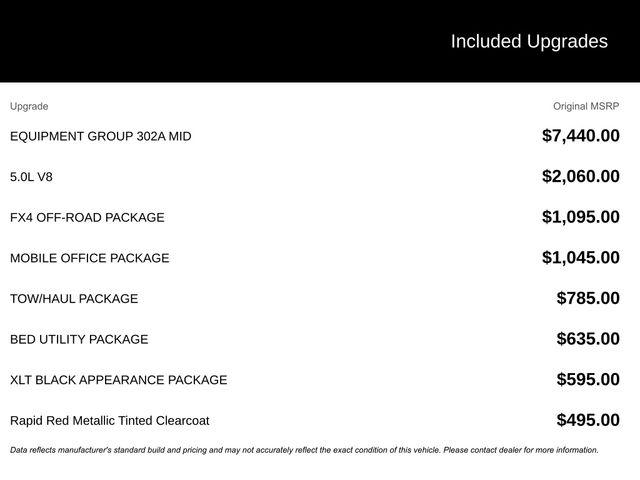 2025 Rapid Red Metallic Tinted Clearcoat 2025 Ford F-150 XLT XLT 4D SuperCrew 4WD 5.0L V8 12" LCD Productivity Touchscreen, 5G WiFi Hotspot Telematics, Auto Emergency Braking, Auto LED Headlights, Backup Camera, Blind Spot Monitoring, BLIS w/ Cross Traffic Alert, Bluetooth w/ Audio Streaming, Lane Keeping System, Off Road Package, Parking Sensors, Post Collision Braking, Power Sliding Rear Window, Pre-Collision w/ Pedestrian Detection, Reverse Brake Assist, Reverse Sensing, Skid Plate Package, Tow Package, Trailer Package, XLT Package, 4D SuperCrew, 5.0L V8, 10-Speed Automatic, 4WD, 360 Degree Camera, 4 Pickup Box Tie-Down Plates, 400W Cab & Bed Outlets, 4x4 FX4 Off-Road Bodyside Decal, 6" Angular Bright Anodized Step Bar, 6" Black Running Boards, Adaptive Cruise Control w/Stop & Go, Auto-Dimming Rear-View Mirror, Bed Utility Package, Black Exterior Badging, Black Grille, Black Painted Grille w/Chrome Center Bar, Body-Color Front & Rear Bumpers, Chrome Door & Tailgate Handles, Chrome Single-Tip Exhaust, Cloth 40/Console/40 Front Seats, Connected Navigation, Console Worksurface, Dark Interior Appliques, Driver State Detection, Dual-Zone Electronic Automatic Temperature Control, Equipment Group 302A Mid, Evasive Steering Assist, Floor Shifter, Ford Co-Pilot360 Assist 2.0, Front Parking Sensors, FX4 Off-Road Package, Gray Box Side Decal, Heated Front Seats, Hill Descent Control, Integrated Trailer Brake Controller, Intelligent Access w/Push Button Start, LED Box Lighting, Max Tow Electronic Locking w/3.73 Axle Ratio, Mobile Office Package, Monotube Rear Shocks, Off-Road Tuned Front Shock Absorbers, Partitioned Lockable Rear Storage, Power Glass Heated Sideview Mirrors, Power-Sliding Rear Window, Remote Start System w/Remote Tailgate Release, Rock Crawl Mode, Tailgate Step w/Tailgate Work Surface, Tow/Haul Package, Towing Technology, Tray Style Floor Liner w/o Carpet Mats, Unique Sport Cloth 40/Console/40 Front-Seats, Wheels: 18" Gloss Black, Wrapped Steering Wheel, XLT Black Appearance Package. Bed Utility Package (4 Pickup Box Tie-Down Plates, LED Box Lighting, and Tailgate Step w/Tailgate Work Surface), Equipment Group 302A Mid (360 Degree Camera, 400W Cab & Bed Outlets, 6" Angular Bright Anodized Step Bar, Adaptive Cruise Control w/Stop & Go, Auto-Dimming Rear-View Mirror, Black Painted Grille w/Chrome Center Bar, Chrome Door & Tailgate Handles, Chrome Single-Tip Exhaust, Cloth 40/Console/40 Front Seats, Connected Navigation, Driver State Detection, Dual-Zone Electronic Automatic Temperature Control, Evasive Steering Assist, Ford Co-Pilot360 Assist 2.0, Front Parking Sensors, Heated Front Seats, Intelligent Access w/Push Button Start, Power Glass Heated Sideview Mirrors, Power-Sliding Rear Window, Remote Start System w/Remote Tailgate Release, Towing Technology, and Wrapped Steering Wheel), FX4 Off-Road Package (4x4 FX4 Off-Road Bodyside Decal, Hill Descent Control, Monotube Rear Shocks, Off-Road Tuned Front Shock Absorbers, Rock Crawl Mode, and Tray Style Floor Liner w/o Carpet Mats), Mobile Office Package (Console Worksurface and Partitioned Lockable Rear Storage), Tow/Haul Package (Integrated Trailer Brake Controller), XLT Black Appearance Package (6" Black Running Boards, Black Exterior Badging, Black Grille, Body-Color Front & Rear Bumpers, Dark Interior Appliques, Floor Shifter, Gray Box Side Decal, Unique Sport Cloth 40/Console/40 Front-Seats, and Wheels: 18" Gloss Black), 4D SuperCrew, 5.0L V8, 10-Speed Automatic, 4WD, Max Tow Electronic Locking w/3.73 Axle Ratio, 4-Wheel Disc Brakes, 6 Speakers, ABS brakes, Air Conditioning, Alloy wheels, Auto High-beam Headlights, Brake assist, Bum $1,000 - Exp. 12/31/2026 Retail Trade Assistance. Must trade in a vehicle to qualify $1,000 - Exp. 12/31/2026 Dealer Finance Assistance. Must finance through dealer