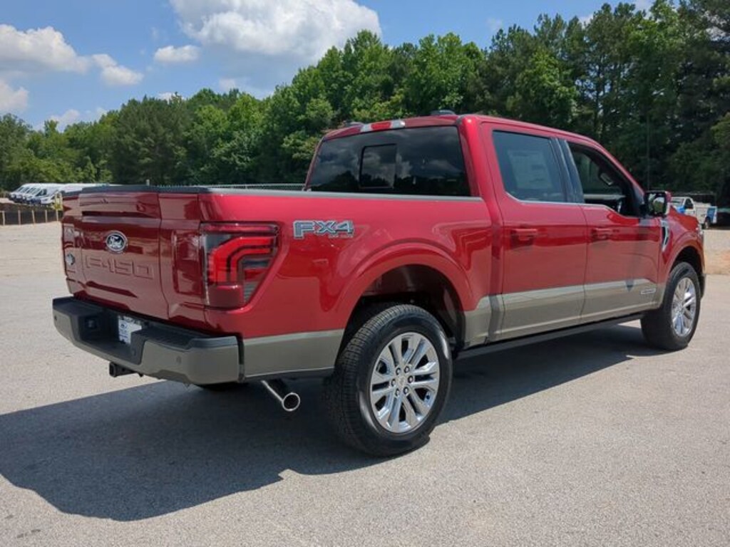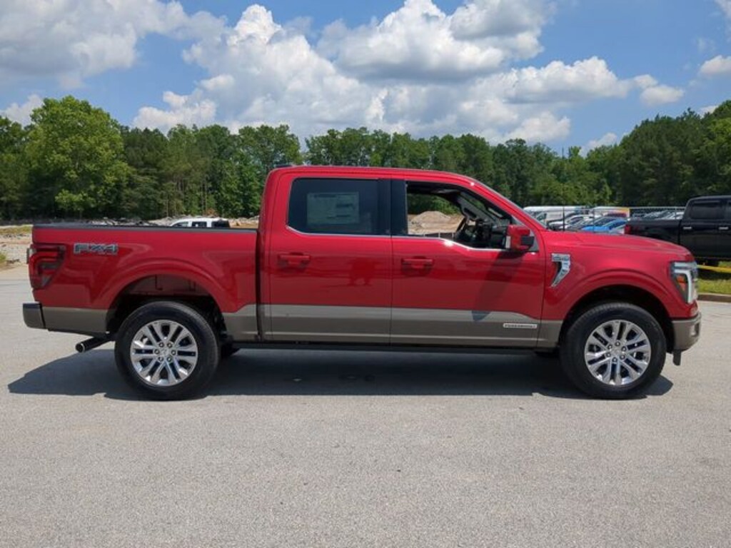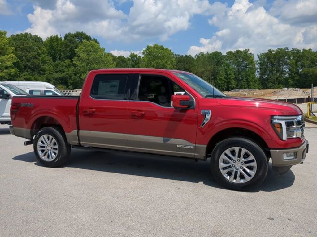 2025 Rapid Red Metallic Tinted Clearcoat 2025 Ford F-150 King Ranch King Ranch 4D SuperCrew 4WD 3.5L PowerBoost Full-Hybrid V6 12" LCD Productivity Touchscreen, 360-Degree Camera, 5G WiFi Hotspot Telematics, Adaptive Cruise Control, Auto Emergency Braking, Auto LED Headlights, Backup Camera, Blind Spot Monitoring, BLIS w/ Cross Traffic Alert, Bluetooth w/ Audio Streaming, King Ranch Package, Lane Keeping System, Leather Seats, LED Foglights, Parking Sensors, Post Collision Braking, Power Mirror Package, Power Package, Pre Collision Assist w/ AEB, Reverse Brake Assist, Reverse Sensing, Tow Package, Trailer Package, 4D SuperCrew, 3.5L PowerBoost Full-Hybrid V6, 10-Speed Automatic, 4WD, 4x4 FX4 Off-Road Bodyside Decal, Electronic Locking w/3.73 Axle Ratio, Equipment Group 601A High, FX4 Off-Road Package, GVWR: 7,400 lbs Payload Package, Hill Descent Control, Monotube Rear Shocks, Navigation system: Connected Navigation, Off-Road Tuned Front Shock Absorbers, Radio: B&O Unleashed Sound System by Bang & Olufsen, Rock Crawl Mode, SYNC 4 w/Enhanced Voice Recognition. Equipment Group 601A High, FX4 Off-Road Package (4x4 FX4 Off-Road Bodyside Decal, Hill Descent Control, Monotube Rear Shocks, Off-Road Tuned Front Shock Absorbers, and Rock Crawl Mode), GVWR: 7,400 lbs Payload Package, 4D SuperCrew, 3.5L PowerBoost Full-Hybrid V6, 10-Speed Automatic, 4WD, Electronic Locking w/3.73 Axle Ratio, Navigation system: Connected Navigation, Radio: B&O Unleashed Sound System by Bang & Olufsen, SYNC 4 w/Enhanced Voice Recognition, 14 Speakers, 4-Wheel Disc Brakes, ABS brakes, Adjustable pedals, Air Conditioning, Alloy wheels, AM/FM radio: SiriusXM with 360L, Auto High-beam Headlights, Auto tilt-away steering wheel, Auto-dimming door mirrors, Auto-dimming Rear-View mirror, Automatic temperature control, Brake assist, Chrome wheels, Compass, Delay-off headlights, Driver door bin, Driver vanity mirror, Dual front impact airbags, Dual front side impact airbags, Electronic Stability Control, Emergency communication system: SYNC 4 911 Assist, Front anti-roll bar, Front Bucket Seats, Front Center Armrest, Front dual zone A/C, Front fog lights, Front reading lights, Front wheel independent suspension, Fully automatic headlights, Garage door transmitter, Genuine wood dashboard insert, Heads-Up Display, Heated door mirrors, Heated front seats, Heated rear seats, Heated steering wheel, Illuminated entry, King Ranch Multicontour Leather Bucket Seats, Leather steering wheel, Low tire pressure warning, Memory seat, Occupant sensing airbag, Outside temperature display, Overhead airbag, Overhead console, Panic alarm, Passenger door bin, Passenger vanity mirror, Pedal memory, Power door mirrors, Power driver seat, Power moonroof, Power passenger seat, Power steering, Power windows, Radio data system, Rain sensing wipers, Rear reading lights, Rear seat center armrest, Rear step bumper, Rear window defroster, Remote keyless entry, Security system, Speed control, Split folding rear seat, Steering wheel memory, Steering wheel mounted audio controls, Tachometer, Telescoping steering wheel, Tilt steering wheel, Traction control, Trip computer, Turn signal indicator mirrors, Variably intermittent wipers, Ventilated front seats, Voltmeter, and Wheels: 20" Chrome-Like PVD.