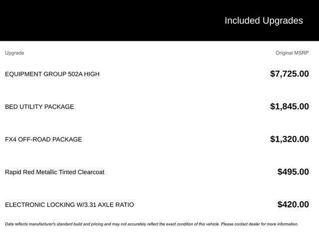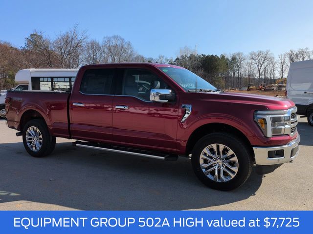 2025 Rapid Red Metallic Tinted Clearcoat 2025 Ford F-150 Lariat Lariat 4D SuperCrew 4WD 3.5L V6 EcoBoost 4WD. Bed Utility Package (4 Pickup Box Tie-Down Plates, LED Box Lighting, Power Tailgate, and Pro Access Tailgate), Equipment Group 502A High (2nd Row Heated Seats, Ambient Lighting - Ice Blue Color Only, Heads-Up Display, Illuminated Driver & Passenger Visors, Power-Sliding Rear Window, Radio: B&O Unleashed Sound System by Bang & Olufsen, and Wheels: 20" Chrome-Like PVD), FX4 Off-Road Package (4x4 FX4 Off-Road Bodyside Decal, Hill Descent Control, Monotube Rear Shocks, Off-Road Tuned Front Shock Absorbers, Rock Crawl Mode, and Tray Style Floor Liner w/o Carpet Mats), Mobile Office Package (Console Worksurface, Partitioned Lockable Rear Storage, and Wireless Charging), 4WD, 4-Wheel Disc Brakes, 6" Extended Running Boards, 8 Speakers, ABS brakes, ActiveX Trimmed Bucket Seats, Adjustable pedals, Air Conditioning, Alloy wheels, AM/FM radio: SiriusXM with 360L, Auto High-beam Headlights, Auto-dimming door mirrors, Auto-dimming Rear-View mirror, Automatic temperature control, Brake assist, Bumpers: chrome, Chrome wheels, Compass, Delay-off headlights, Driver door bin, Driver vanity mirror, Dual front impact airbags, Dual front side impact airbags, Electronic Stability Control, Emergency communication system: SYNC 4 911 Assist, Front anti-roll bar, Front Bucket Seats, Front Center Armrest, Front dual zone A/C, Front fog lights, Front reading lights, Front wheel independent suspension, Fully automatic headlights, Garage door transmitter, Heated door mirrors, Heated front seats, Heated steering wheel, Illuminated entry, Internet access capable: FordPass Connect 5G, Low tire pressure warning, Memory seat, Navigation system: Connected Navigation, Occupant sensing airbag, Outside temperature display, Overhead airbag, Overhead console, Panic alarm, Passenger door bin, Passenger vanity mirror, Pedal memory, Power door mirrors, Power driver seat, Power passenger seat, Power steering, Power windows, Radio data system, Radio: B&O Sound System by Bang & Olufsen, Rain sensing wipers, Rear reading lights, Rear seat center armrest, Rear step bumper, Rear window defroster, Remote keyless entry, Security system, Speed control, Split folding rear seat, Steering wheel mounted audio controls, SYNC 4 w/Enhanced Voice Recognition, Tachometer, Telescoping steering wheel, Tilt steering wheel, Traction control, Trip computer, Turn signal indicator mirrors, Variably intermittent wipers, Ventilated front seats, Voltmeter, and Wheels: 18" Chrome-Like PVD.