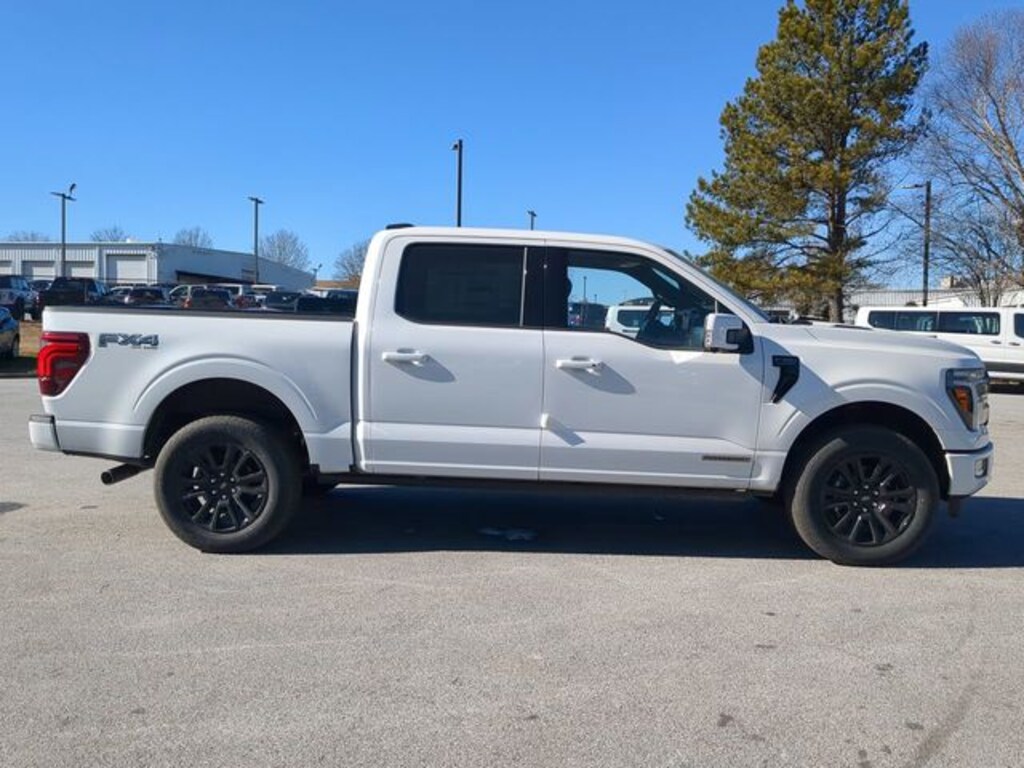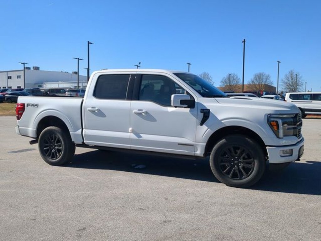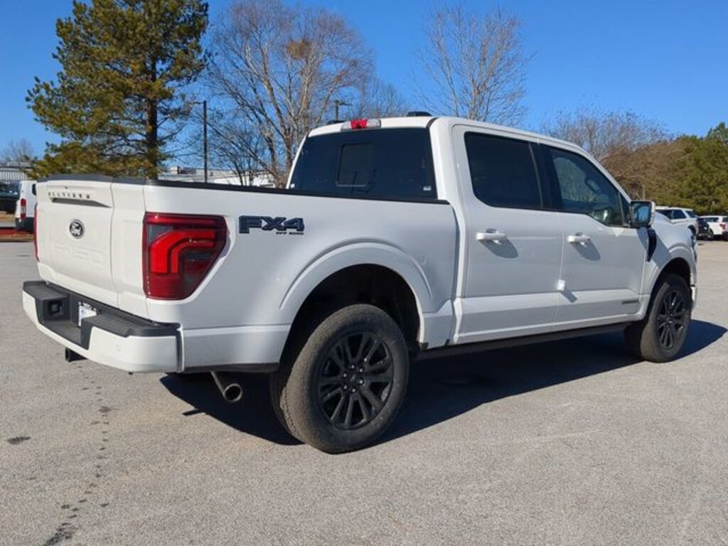 2025 Star White Metallic Tri-Coat 2025 Ford F-150 Platinum Platinum 4D SuperCrew 4WD 3.5L PowerBoost Full-Hybrid V6 12" LCD Productivity Touchscreen, 360-Degree Camera, 5G WiFi Hotspot Telematics, Adaptive Cruise Control, Backup Camera, Blind Spot Monitoring, BLIS w/ Cross Traffic Alert, Lane Keeping System, Off Road Package, Panoramic Sunroof/Moonroof, Parking Sensors, Post Collision Braking, Power Running Boards, Power Sliding Rear Window, Pre Collision Assist w/ AEB, Reverse Brake Assist, Reverse Sensing, Skid Plate Package, Tow Package, Trailer Package, 4D SuperCrew, 3.5L PowerBoost Full-Hybrid V6, 10-Speed Automatic, 4WD, 4x4 FX4 Off-Road Bodyside Decal, Electronic Locking w/3.73 Axle Ratio, Equipment Group 702A High, FX4 Off-Road Package, Heads-Up Display, Hill Descent Control, Monotube Rear Shocks, Off-Road Tuned Front Shock Absorbers, Radio: B&O Unleashed Sound System by Bang & Olufsen, Rock Crawl Mode, Twin Panel Moonroof. Equipment Group 702A High (Heads-Up Display, Radio: B&O Unleashed Sound System by Bang & Olufsen, and Twin Panel Moonroof), FX4 Off-Road Package (4x4 FX4 Off-Road Bodyside Decal, Hill Descent Control, Monotube Rear Shocks, Off-Road Tuned Front Shock Absorbers, and Rock Crawl Mode), 4D SuperCrew, 3.5L PowerBoost Full-Hybrid V6, 10-Speed Automatic, 4WD, Electronic Locking w/3.73 Axle Ratio, 4-Wheel Disc Brakes, 8 Speakers, ABS brakes, Adjustable pedals, Air Conditioning, Alloy wheels, Auto High-beam Headlights, Auto tilt-away steering wheel, Auto-dimming door mirrors, Auto-dimming Rear-View mirror, Automatic temperature control, Brake assist, Bumpers: body-color, Compass, Delay-off headlights, Driver door bin, Driver vanity mirror, Dual front impact airbags, Dual front side impact airbags, Electronic Stability Control, Emergency communication system: SYNC 4 911 Assist, Front anti-roll bar, Front Bucket Seats, Front Center Armrest, Front dual zone A/C, Front fog lights, Front reading lights, Front wheel independent suspension, Fully automatic headlights, Garage door transmitter, Heated door mirrors, Heated front seats, Heated rear seats, Heated steering wheel, Illuminated entry, Leather steering wheel, Low tire pressure warning, Memory seat, Navigation system: Connected Navigation, Occupant sensing airbag, Outside temperature display, Overhead airbag, Overhead console, Panic alarm, Passenger door bin, Passenger vanity mirror, Pedal memory, Power door mirrors, Power driver seat, Power passenger seat, Power steering, Power windows, Radio data system, Radio: B&O Sound System by Bang & Olufsen, Rain sensing wipers, Rear reading lights, Rear seat center armrest, Rear step bumper, Rear window defroster, Remote keyless entry, Security system, Speed control, Split folding rear seat, Steering wheel memory, Steering wheel mounted audio controls, SYNC 4 w/Enhanced Voice Recognition, Tachometer, Telescoping steering wheel, Tilt steering wheel, Tough Bed Spray-In Bedliner, Traction control, Trip computer, Turn signal indicator mirrors, Unique Multi-Contour Leather Bucket Seats, Variably intermittent wipers, Ventilated front seats, Voltmeter, Wheel Well Liner, and Wheels: 20" Painted Gloss Ebony Black.