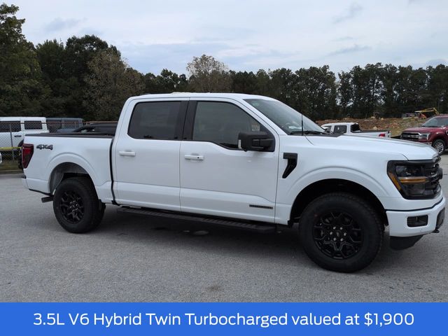 2025 Oxford White 2025 Ford F-150 XLT XLT 4D SuperCrew 4WD 3.5L PowerBoost Full-Hybrid V6 4D SuperCrew, 3.5L PowerBoost Full-Hybrid V6, 10-Speed Automatic, 4WD, 12" LCD Productivity Touchscreen, 5G WiFi Hotspot Telematics, 6" Black Running Boards, Auto Emergency Braking, Auto LED Headlights, Backup Camera, Black Exterior Badging, Black Grille, Blind Spot Monitoring, BLIS w/ Cross Traffic Alert, Bluetooth w/ Audio Streaming, Body-Color Front & Rear Bumpers, Dark Interior Appliques, Electronic Locking w/3.73 Axle Ratio, Equipment Group 302A Mid, Floor Shifter, Gray Box Side Decal, Integrated Trailer Brake Controller, Lane Keeping System, Parking Sensors, Post Collision Braking, Power Mirror Package, Power Package, Power Sliding Rear Window, Pre Collision Assist w/ AEB, Pro Power Onboard - 7.2KW, Reverse Brake Assist, Reverse Sensing, Tow Package, Tow/Haul Package, Trailer Package, Unique Sport Cloth 40/Console/40 Front-Seats, Wheels: 18" Gloss Black, Wireless Charging Pad, XLT Black Appearance Package. Equipment Group 302A Mid, Tow/Haul Package (Integrated Trailer Brake Controller), XLT Black Appearance Package (6" Black Running Boards, Black Exterior Badging, Black Grille, Body-Color Front & Rear Bumpers, Dark Interior Appliques, Floor Shifter, Gray Box Side Decal, Unique Sport Cloth 40/Console/40 Front-Seats, and Wheels: 18" Gloss Black), 4D SuperCrew, 3.5L PowerBoost Full-Hybrid V6, 10-Speed Automatic, 4WD, 12" LCD Productivity Touchscreen, 5G WiFi Hotspot Telematics, Auto Emergency Braking, Auto LED Headlights, Backup Camera, Blind Spot Monitoring, BLIS w/ Cross Traffic Alert, Bluetooth w/ Audio Streaming, Electronic Locking w/3.73 Axle Ratio, Lane Keeping System, Parking Sensors, Post Collision Braking, Power Mirror Package, Power Package, Power Sliding Rear Window, Pre Collision Assist w/ AEB, Pro Power Onboard - 7.2KW, Reverse Brake Assist, Reverse Sensing, Tow Package, Trailer Package, Wireless Charging Pad, 4-Wheel Disc Brakes, 6 Speakers, ABS brakes, Air Conditioning, Alloy wheels, AM/FM radio: SiriusXM with 360L, Auto High-beam Headlights, BlueCruise (Equipment + 1-Year Plan), Brake assist, Bumpers: chrome, Chrome wheels, Cloth 40/20/40 Front Seat, Compass, Delay-off headlights, Driver door bin, Driver vanity mirror, Dual front impact airbags, Dual front side impact airbags, Electronic Stability Control, Emergency communication system: SYNC 4 911 Assist, Front anti-roll bar, Front Center Armrest, Front fog lights, Front reading lights, Front wheel independent suspension, Fully automatic headlights, Heated door mirrors, Illuminated entry, Low tire pressure warning, Occupant sensing airbag, Outside temperature display, Overhead airbag, Overhead console, Panic alarm, Passenger door bin, Passenger vanity mirror, Power door mirrors, Power steering, Power windows, Radio data system, Radio: AM/FM Stereo w/SiriusXM 360L, Rear Parking Sensors, Rear reading lights, Rear step bumper, Rear window defroster, Remote keyless entry, Security system, Speed control, Split folding rear seat, Steering wheel mounted audio controls, SYNC 4 w/Enhanced Voice Recognition, Tachometer, Telescoping steering wheel, Tilt steering wheel, Tough Bed Spray-In Bedliner, Traction control, Trip computer, Variably intermittent wipers, Voltmeter, and Wheels: 18" Chrome-Like PVD. $1,000 - Exp. 12/31/2026 Retail Trade Assistance. Must trade in a vehicle to qualify $1,000 - Exp. 12/31/2026 Dealer Finance Assistance. Must finance through dealer lender to qualify.