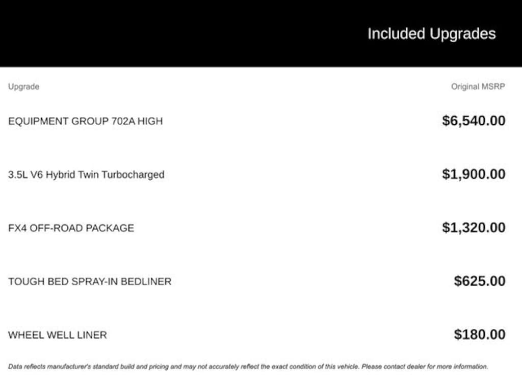 2025 Carbonized Gray Metallic 2025 Ford F-150 Platinum Platinum 4D SuperCrew 4WD 3.5L PowerBoost Full-Hybrid V6 12" LCD Productivity Touchscreen, 360-Degree Camera, 5G WiFi Hotspot Telematics, Adaptive Cruise Control, Auto LED Headlights, Backup Camera, Cold Weather Package, Lane Keeping System, Memory Package, Off Road Package, Panoramic Sunroof/Moonroof, Post Collision Braking, Power Running Boards, Power Sliding Rear Window, Premium Audio Package, Premium Sound Package, Push Button Start, Remote Start, Reverse Brake Assist, Reverse Sensing, Skid Plate Package, Tow Package, Trailer Package, 4D SuperCrew, 3.5L PowerBoost Full-Hybrid V6, 10-Speed Automatic, 4WD, 4-Wheel Disc Brakes, 4x4 FX4 Off-Road Bodyside Decal, 8 Speakers, ABS brakes, Auto High-beam Headlights, Auto-dimming door mirrors, Automatic temperature control, Brake assist, Delay-off headlights, Electronic Locking w/3.73 Axle Ratio, Electronic Stability Control, Emergency communication system: SYNC 4 911 Assist, Equipment Group 702A High, Front dual zone A/C, Front fog lights, Front wheel independent suspension, Fully automatic headlights, FX4 Off-Road Package, Heads-Up Display, Heated door mirrors, Hill Descent Control, Low tire pressure warning, Memory seat, Monotube Rear Shocks, Navigation system: Connected Navigation, Off-Road Tuned Front Shock Absorbers, Panic alarm, Pedal memory, Radio data system, Radio: B&O Sound System by Bang & Olufsen, Radio: B&O Unleashed Sound System by Bang & Olufsen, Remote keyless entry, Rock Crawl Mode, Security system, Speed control, Steering wheel memory, Steering wheel mounted audio controls, SYNC 4 w/Enhanced Voice Recognition, Tough Bed Spray-In Bedliner, Traction control, Twin Panel Moonroof. Equipment Group 702A High (Heads-Up Display, Radio: B&O Unleashed Sound System by Bang & Olufsen, and Twin Panel Moonroof), FX4 Off-Road Package (4x4 FX4 Off-Road Bodyside Decal, Hill Descent Control, Monotube Rear Shocks, Off-Road Tuned Front Shock Absorbers, and Rock Crawl Mode), 4D SuperCrew, 3.5L PowerBoost Full-Hybrid V6, 10-Speed Automatic, 4WD, 4-Wheel Disc Brakes, 8 Speakers, ABS brakes, Auto High-beam Headlights, Auto-dimming door mirrors, Automatic temperature control, Brake assist, Delay-off headlights, Electronic Locking w/3.73 Axle Ratio, Electronic Stability Control, Emergency communication system: SYNC 4 911 Assist, Front dual zone A/C, Front fog lights, Front wheel independent suspension, Fully automatic headlights, Heated door mirrors, Low tire pressure warning, Memory seat, Navigation system: Connected Navigation, Panic alarm, Pedal memory, Radio data system, Radio: B&O Sound System by Bang & Olufsen, Remote keyless entry, Security system, Speed control, Steering wheel memory, Steering wheel mounted audio controls, SYNC 4 w/Enhanced Voice Recognition, Tough Bed Spray-In Bedliner, Traction control, Adjustable pedals, Air Conditioning, Alloy wheels, Auto tilt-away steering wheel, Auto-dimming Rear-View mirror, Bumpers: body-color, Compass, Driver door bin, Driver vanity mirror, Dual front impact airbags, Dual front side impact airbags, Front anti-roll bar, Front Bucket Seats, Front Center Armrest, Front reading lights, Garage door transmitter, Heated front seats, Heated rear seats, Heated steering wheel, Illuminated entry, Leather steering wheel, Occupant sensing airbag, Outside temperature display, Overhead airbag, Overhead console, Passenger door bin, Passenger vanity mirror, Power door mirrors, Power driver seat, Power passenger seat, Power steering, Power windows, Rain sensing wipers, Rear reading lights, Rear seat center armrest, Rear step bumper, Rear window defroster, Split folding rear seat, Tachometer, Telescoping steering wheel, Tilt steering wheel, Tray Style Floor Liner, Trip computer, Turn signal indicator mirrors, Unique Multi-Contour Leather Bu