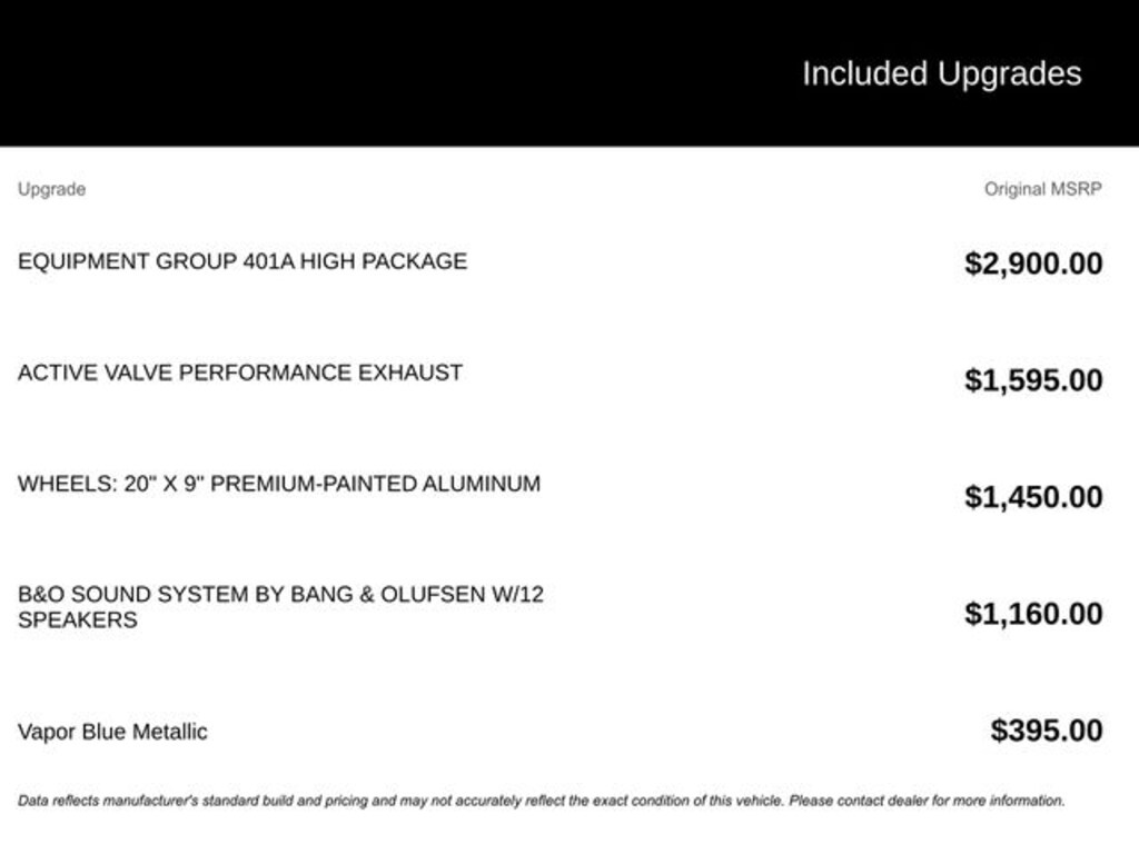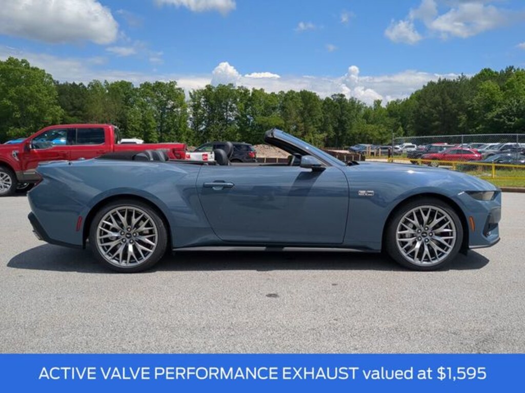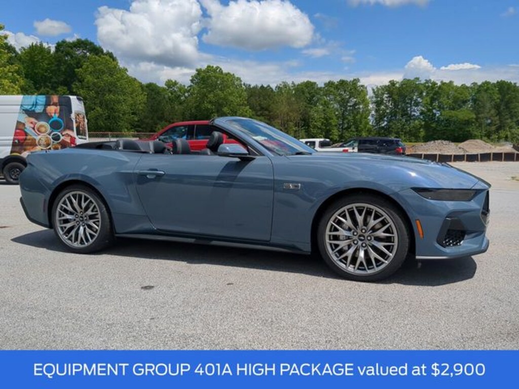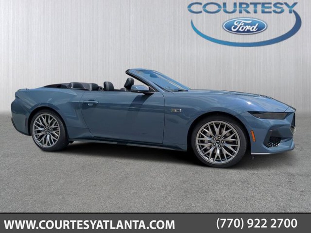 2025 Vapor Blue Metallic 2025 Ford Mustang GT Premium Convertible GT Premium 2D Convertible RWD 5.0L V8 Ti-VCT 12.4" LCD Digital Driver Cluster, 13.2" LCD Centerstack Touchscreen, 4G WiFi Hotspot Telematics, Auto LED Headlights, Backup Camera, Leather Seats, Parking Sensors, Premium Sound Package, Push Button Start, Reverse Sensing, 2D Convertible, 5.0L V8 Ti-VCT, 10-Speed Automatic, RWD, 20" Wheels, Active Anti-Theft System, Active Valve Performance Exhaust, B&O Sound System by Bang & Olufsen w/12 Speakers, Connected Navigation, Driver Seat & Mirrors Memory, Equipment Group 401A High Package, Ford Co-Pilot360 Assist+, Illuminated Door-Sill Scuff Plates, Integrated Turn Signals, Leather-Trimmed Bucket Seats w/Color Accents, Locking Center Console, Pre-Collision Assist w/Automatic Emergency Braking, Rain sensing wipers, Security Package, Speed-Sensitive Wipers, Wheel Locking Kit, Wheels: 20" x 9" Premium-Painted Aluminum. Equipment Group 401A High Package (Driver Seat & Mirrors Memory, Illuminated Door-Sill Scuff Plates, Integrated Turn Signals, and Leather-Trimmed Bucket Seats w/Color Accents), Ford Co-Pilot360 Assist+ (Connected Navigation and Pre-Collision Assist w/Automatic Emergency Braking), Security Package (Active Anti-Theft System, Locking Center Console, and Wheel Locking Kit), 2D Convertible, 5.0L V8 Ti-VCT, 10-Speed Automatic, RWD, 20" Wheels, Active Valve Performance Exhaust, B&O Sound System by Bang & Olufsen w/12 Speakers, Rain sensing wipers, Speed-Sensitive Wipers, Wheels: 20" x 9" Premium-Painted Aluminum, 4-Wheel Disc Brakes, 9 Speakers, ABS brakes, Air Conditioning, Alloy wheels, AM/FM radio: SiriusXM with 360L, AM/FM Stereo, Auto High-beam Headlights, Auto-dimming Rear-View mirror, Automatic temperature control, Brake assist, Bumpers: body-color, Climate Controlled Heated/Cooled Front Seats, Compass, Convertible roof lining, Delay-off headlights, Driver door bin, Driver vanity mirror, Dual front impact airbags, Dual front side impact airbags, Electronic Stability Control, Emergency communication system: 911 Assist, Exterior Parking Camera Rear, Four wheel independent suspension, Front anti-roll bar, Front Bucket Seats, Front Center Armrest, Front dual zone A/C, Front reading lights, Fully automatic headlights, Garage door transmitter, Glass rear window, HD Radio, Heated door mirrors, Heated front seats, Heated steering wheel, Illuminated entry, Knee airbag, Leather Shift Knob, Leather steering wheel, Leather-Trimmed Bucket Seats, Low tire pressure warning, Occupant sensing airbag, Outside temperature display, Overhead console, Panic alarm, Passenger door bin, Passenger vanity mirror, Power convertible roof, Power door mirrors, Power driver seat, Power passenger seat, Power steering, Power windows, Radio data system, Rear anti-roll bar, Rear Parking Sensors, Rear window defroster, Remote keyless entry, Security system, SiriusXM w/360L, Speed control, Speed-sensing steering, Spoiler, Sport steering wheel, Steering wheel mounted audio controls, SYNC 4, Tachometer, Telescoping steering wheel, Tilt steering wheel, Traction control, Trip computer, Turn signal indicator mirrors, Variably intermittent wipers, Ventilated front seats, and Voltmeter.