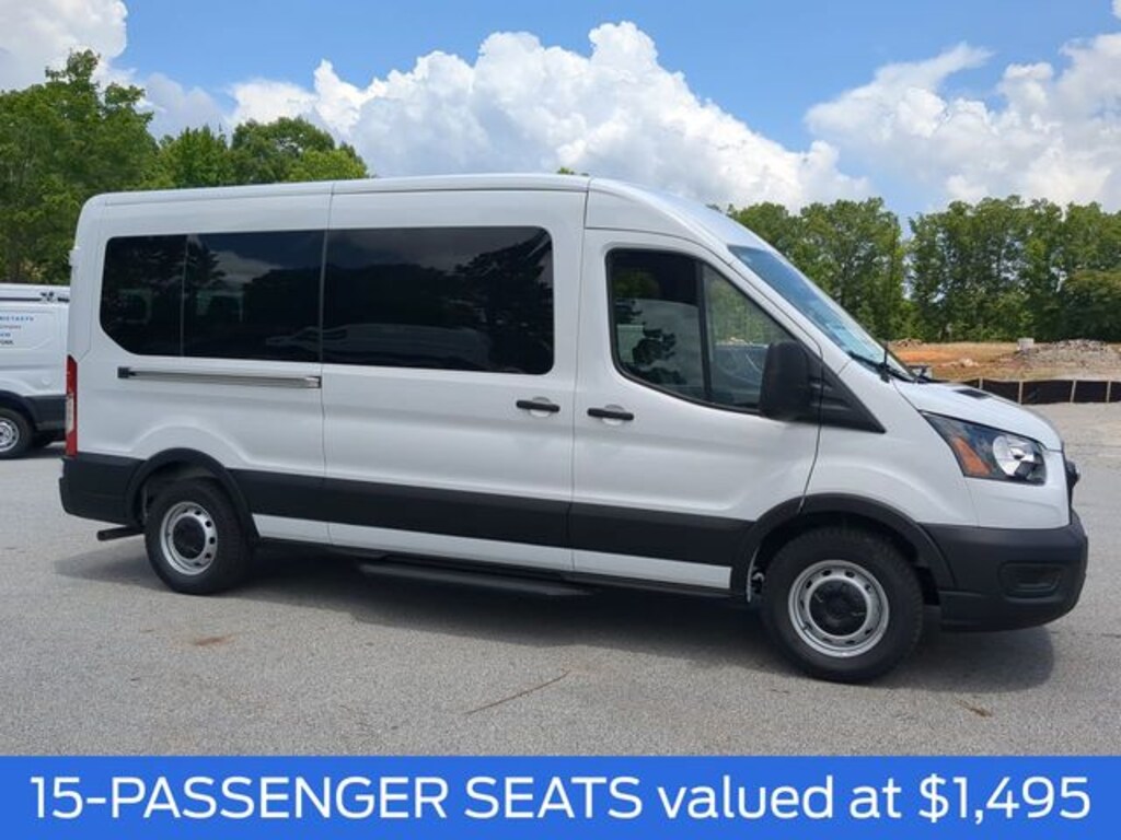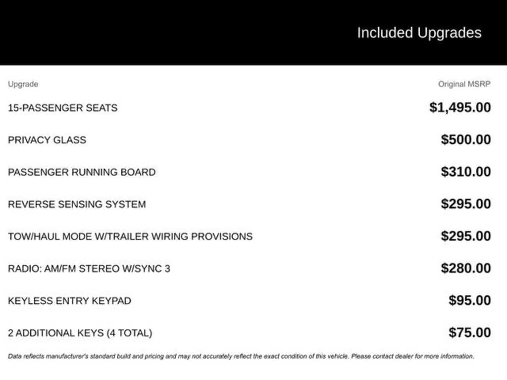 2025 Oxford White 2025 Ford Transit-350 XL XL Passenger Van RWD 3.5L V6 Flex Fuel Passenger Van, 3.5L V6 Flex Fuel, 10-Speed Automatic with Overdrive, RWD, 15-Passenger Seats, 3.73 Limited-Slip Axle Ratio, 4G WiFi Hotspot Telematics, Auto LED Headlights, Backup Camera, Hill Start Assist, Lane Keeping System, Order Code 301A, Parking Sensors, Power Mirror Package, Power Package, Pre Collision Assist w/ AEB, Preferred Equipment Package, Pro Trailer Hitch Assist, Reverse Sensing, Tow Package, Trailer Package. Order Code 301A, Passenger Van, 3.5L V6 Flex Fuel, 10-Speed Automatic with Overdrive, RWD, 15-Passenger Seats, 3.73 Limited-Slip Axle Ratio, 4G WiFi Hotspot Telematics, Auto LED Headlights, Backup Camera, Hill Start Assist, Lane Keeping System, Parking Sensors, Power Mirror Package, Power Package, Pre Collision Assist w/ AEB, Preferred Equipment Package, Pro Trailer Hitch Assist, Reverse Sensing, Tow Package, Trailer Package, 2 Additional Keys (4 Total), 3rd row seats: split-bench, 4-Wheel Disc Brakes, 4th-Row Bench Seat, 8 Speakers, ABS brakes, Air Conditioning, AM/FM radio, Auto High-beam Headlights, Brake assist, Cloth Front Bucket Seats, Dark Palazzo Gray Cloth Bucket Seats, Delay-off headlights, Driver door bin, Driver vanity mirror, Driver's Seat Mounted Armrest, Dual front impact airbags, Dual front side impact airbags, Electronic Air Temperature Control, Electronic Stability Control, Front anti-roll bar, Front Bucket Seats, Front Fog Lamps, Front License Plate Bracket, Front reading lights, Front Sensing System, Front wheel independent suspension, Fully automatic headlights, Illuminated entry, Keyless Entry Keypad, Large Center Console, Low tire pressure warning, Occupant sensing airbag, Overhead airbag, Panic alarm, Passenger door bin, Passenger Running Board, Passenger seat mounted armrest, Passenger vanity mirror, Power door mirrors, Power steering, Power windows, Privacy Glass, Radio: AM/FM Stereo w/SYNC 4 & Nav, Rain sensing wipers, Rear air conditioning, Rear window defroster, Rear-Window Defroster, Remote keyless entry, Reverse Sensing System, Side Sensing System, Speed control, Steering wheel mounted audio controls, Tachometer, Telescoping steering wheel, Tilt steering wheel, Tow/Haul Mode w/Trailer Wiring Provisions, Traction control, Variably intermittent wipers, and Wheels: 16" Steel w/Full Silver Cover.