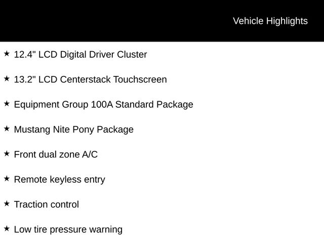 2026 Oxford White 2026 Ford Mustang EcoBoost CC EcoBoost 2D Coupe RWD EcoBoost 2.3L I4 GTDi DOHC Turbocharged VCT 2D Coupe, 10-Speed Automatic, RWD, 12.4" LCD Digital Driver Cluster, 13.2" LCD Centerstack Touchscreen, ABS brakes, Alloy wheels, Black Mirror Caps, Black Painted Wedge Decklid Spoiler, Compass, Electronic Stability Control, Equipment Group 100A Standard Package, Front dual zone A/C, Illuminated entry, Low tire pressure warning, Mustang Nite Pony Package, Painted Black Roof, Remote keyless entry, Traction control, Wheels: 19" x 8.5" Ebony Black-Painted Aluminum. Equipment Group 100A Standard Package (AM/FM Stereo, Cloth Bucket Seats, and SYNC 4), Mustang Nite Pony Package (Black Mirror Caps, Black Painted Wedge Decklid Spoiler, Painted Black Roof, and Wheels: 19" x 8.5" Ebony Black-Painted Aluminum), 2D Coupe, 10-Speed Automatic, RWD, 12.4" LCD Digital Driver Cluster, 13.2" LCD Centerstack Touchscreen, ABS brakes, Alloy wheels, Compass, Electronic Stability Control, Front dual zone A/C, Illuminated entry, Low tire pressure warning, Remote keyless entry, Traction control, 4-Wheel Disc Brakes, 6 Speakers, Air Conditioning, AM/FM radio, Auto High-beam Headlights, Automatic temperature control, Brake assist, Bumpers: body-color, Delay-off headlights, Driver door bin, Driver vanity mirror, Dual front impact airbags, Dual front side impact airbags, Emergency communication system: 911 Assist, Exterior Parking Camera Rear, Four wheel independent suspension, Front anti-roll bar, Front Bucket Seats, Front Center Armrest, Front reading lights, Fully automatic headlights, Knee airbag, Leather Shift Knob, Occupant sensing airbag, Outside temperature display, Overhead airbag, Overhead console, Panic alarm, Passenger door bin, Passenger vanity mirror, Power door mirrors, Power steering, Power windows, Radio data system, Rain sensing wipers, Rear anti-roll bar, Rear Parking Sensors, Rear window defroster, Speed control, Speed-sensing steering, Speed-Sensitive Wipers, Split folding rear seat, Sport steering wheel, Steering wheel mounted audio controls, Tachometer, Telescoping steering wheel, Tilt steering wheel, Trip computer, Variably intermittent wipers, and Voltmeter. Price includes: $1,000 - Exp. 12/31/2026 Retail Trade Assistance. Must trade in a vehicle to qualify $1,000 - Exp. 12/31/2026 Dealer Finance Assistance. Must finance through dealer lender to qualify.